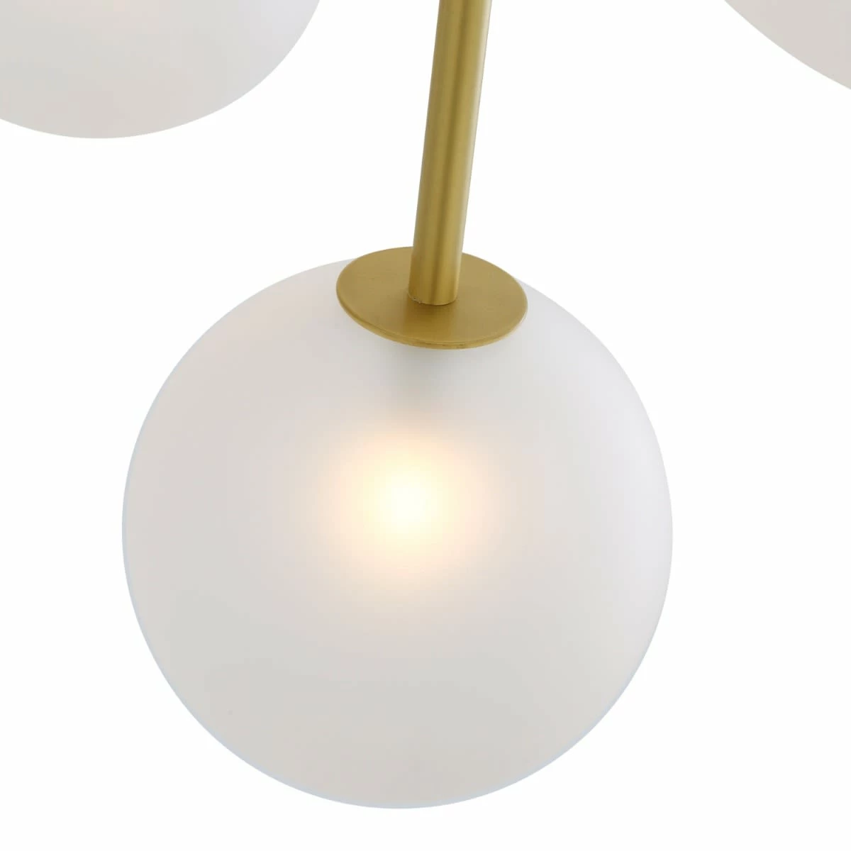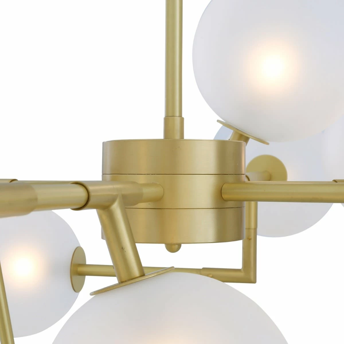 The Athens glass globe chandelier is suspended by a 50cm brass sleeve that connects its supplied ceiling rose to cylindrical brass body. It’s from this brass body that all brass arms originate. The Athens chandelier measures 125cm in diameter and 74.5cm in height.