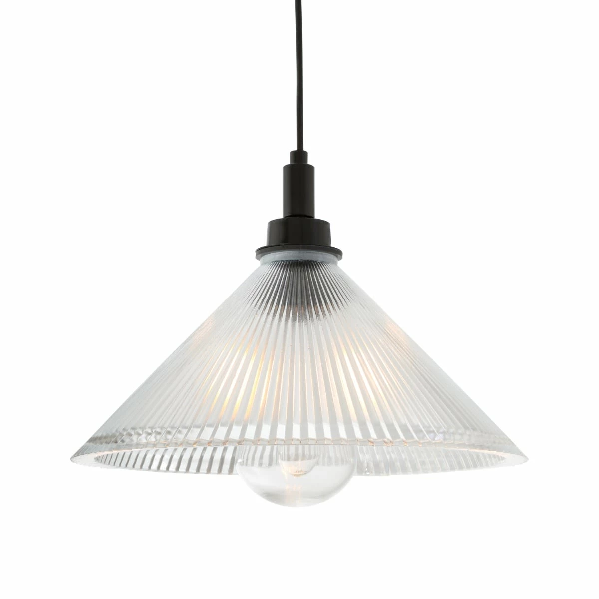 The Beck pendant is a bathroom pendant with a cone-shaped Holophane glass lamp shade. An LED tube light is discreetly housed inside a waterproof teardrop-shaped glass shade that resembles a vintage light bulb.