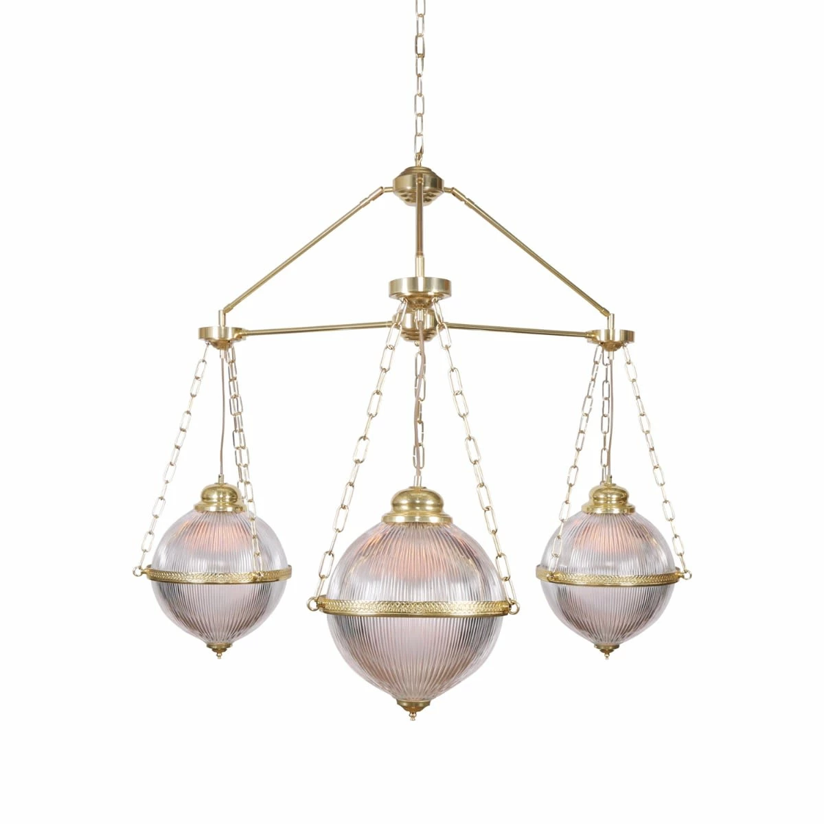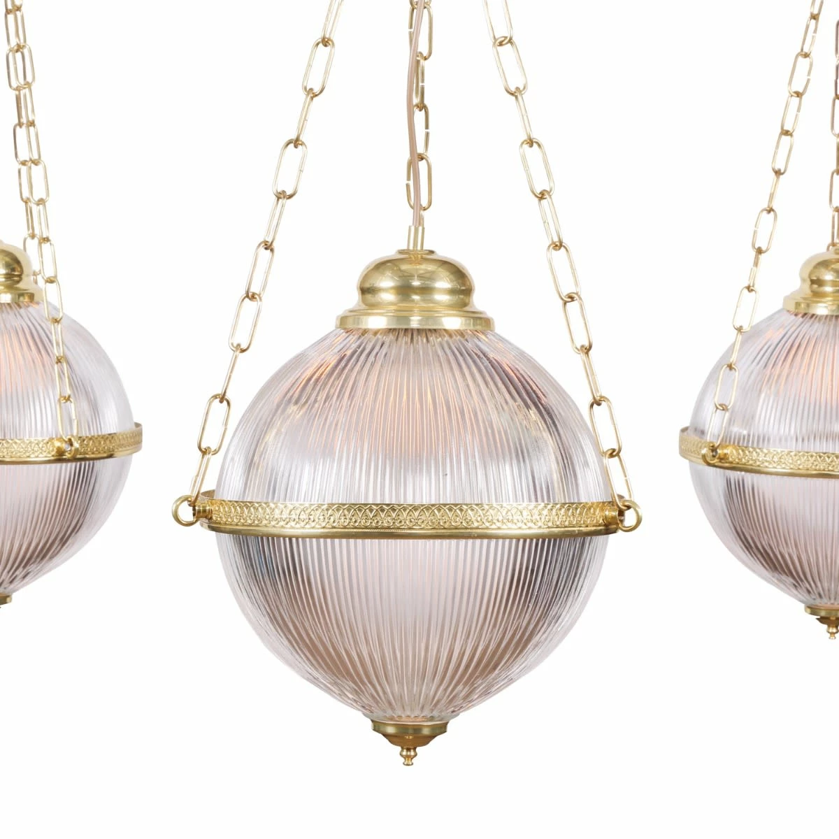 Three Victorian glass pendants are suspended using strong lighting chain. Each pendant features a Holophane spherical glass lamp shade that refracts and disperses light in interesting ways. Inside each glass enclosure is a single E27 lamp holder.