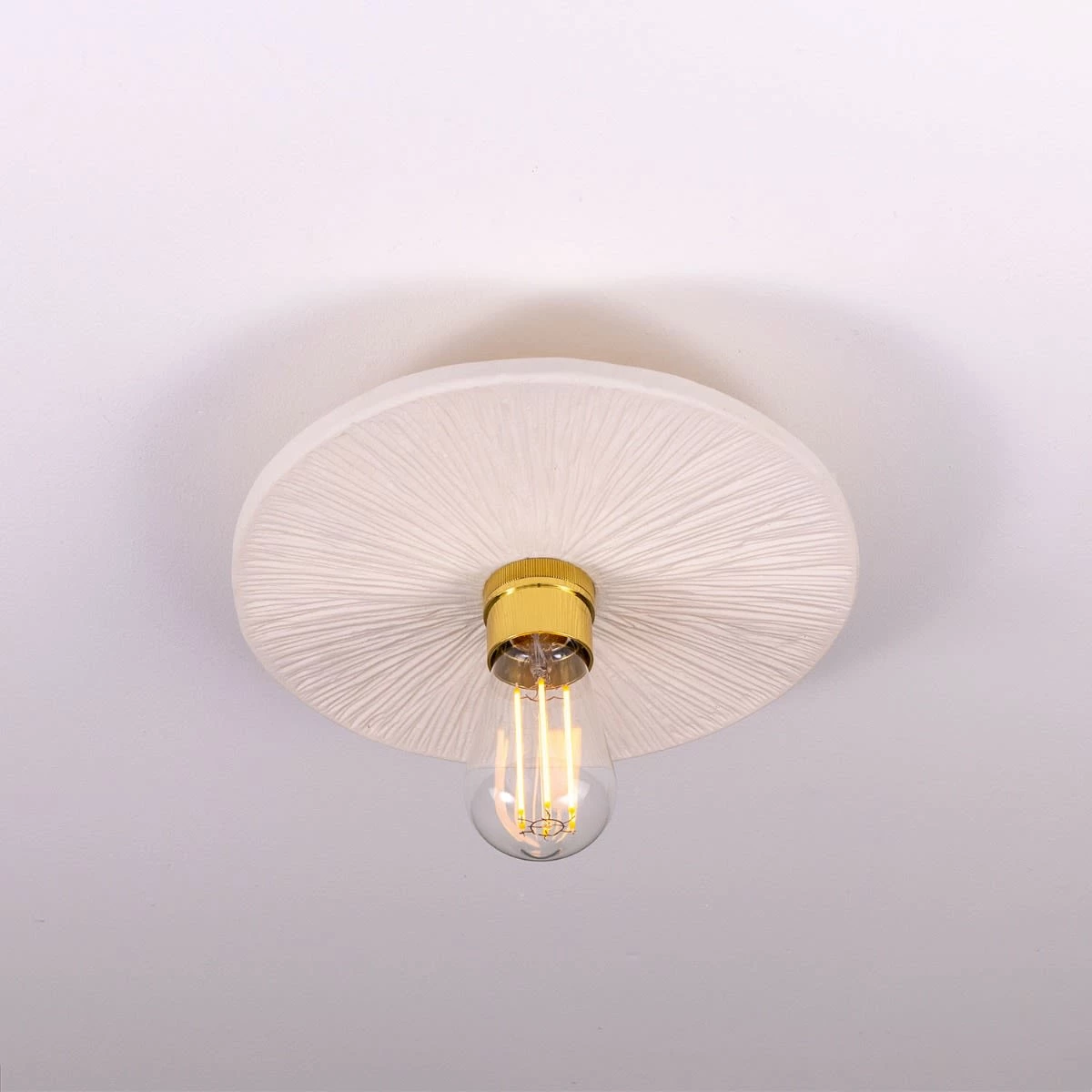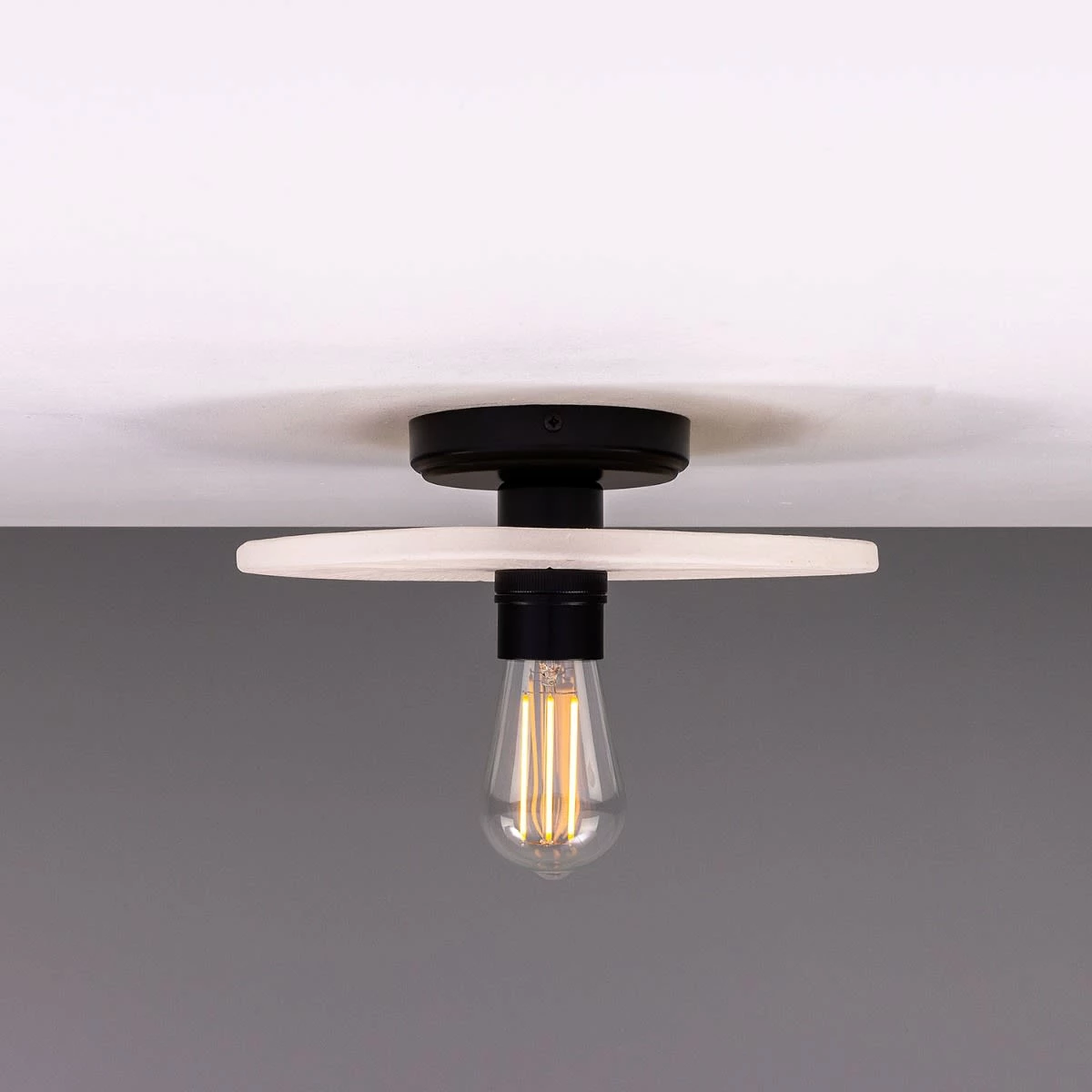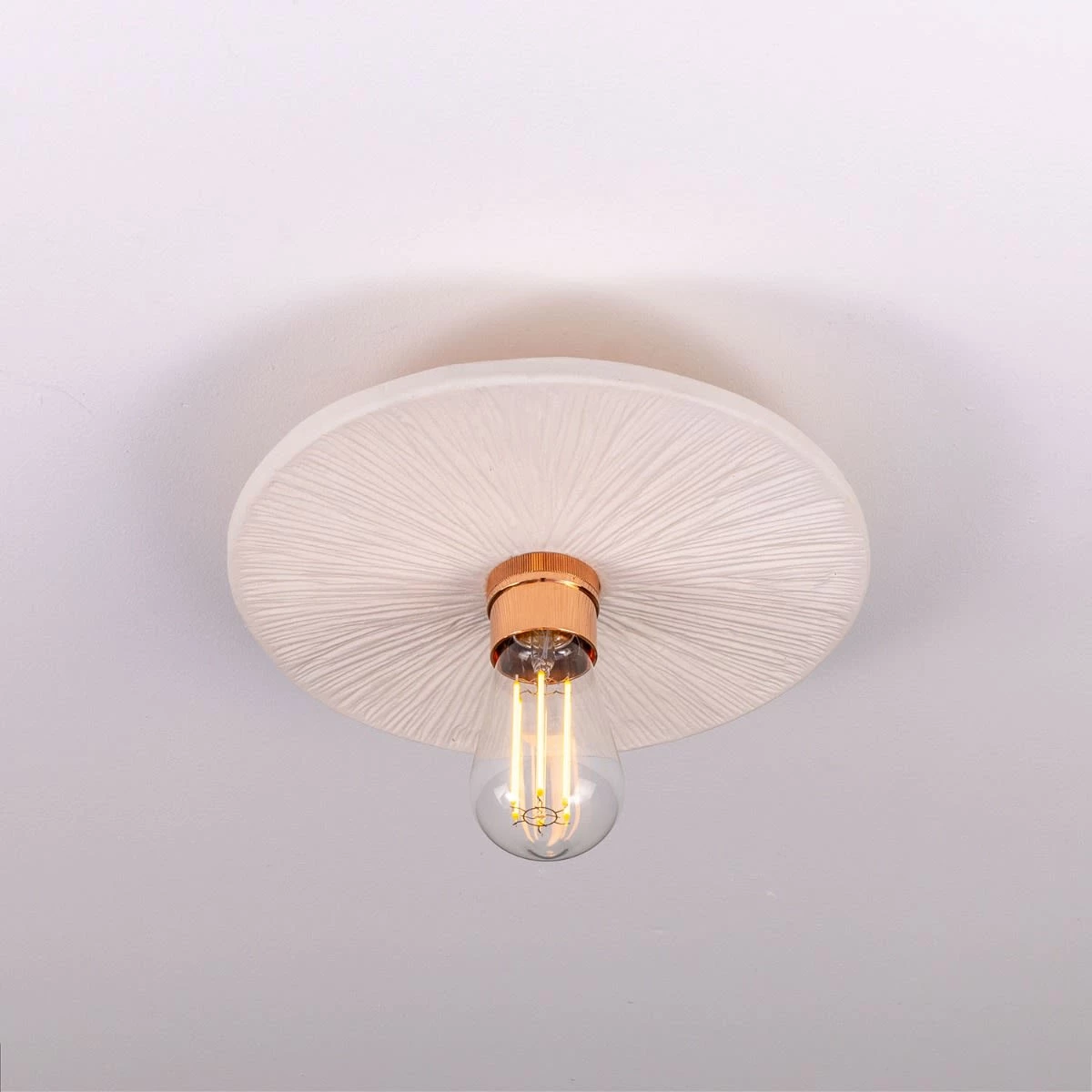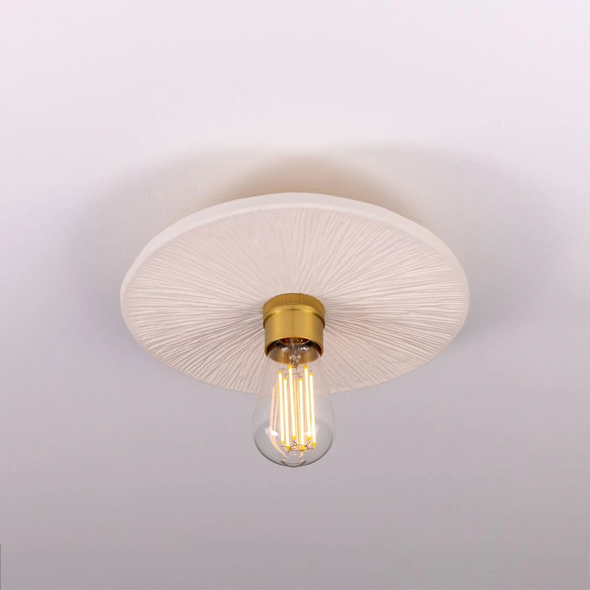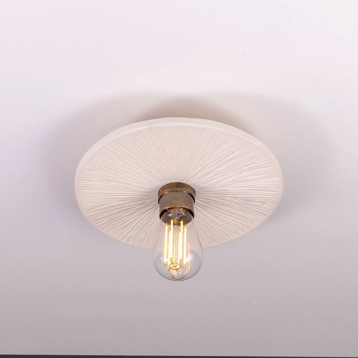 The matte white striped finish of this ceramic ceiling light creates a refreshing, minimalist appearance. The hand-carved striped texture of the ceramic disc shade adds a rustic element that showcases the artisanal efforts of our in-house ceramicists.