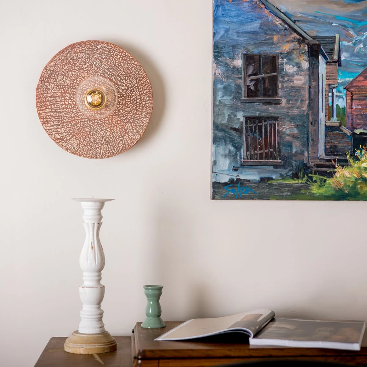 The rustic Red Iron colour finish of this circular wall lamp brilliantly reveals the ceramic shade’s coarsely crackled pattern. This pattern is crafted by hand in our ceramic studio in Mullan Village. The Bog Oak wall sconce is a decorative complement to bare walls and measures 28cm in diameter.