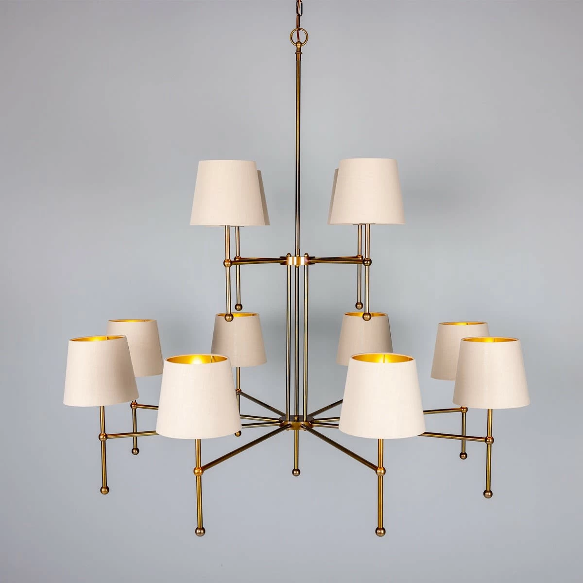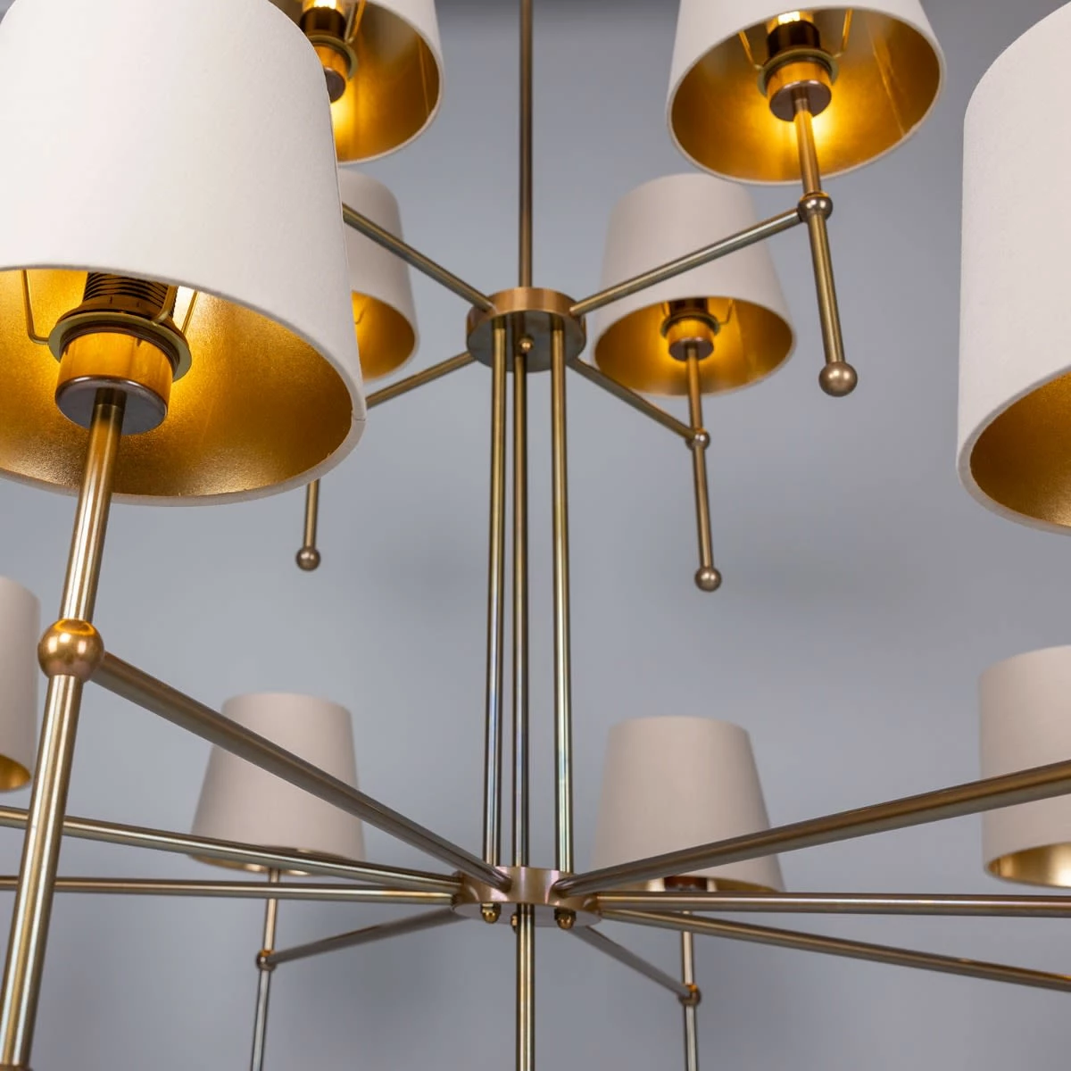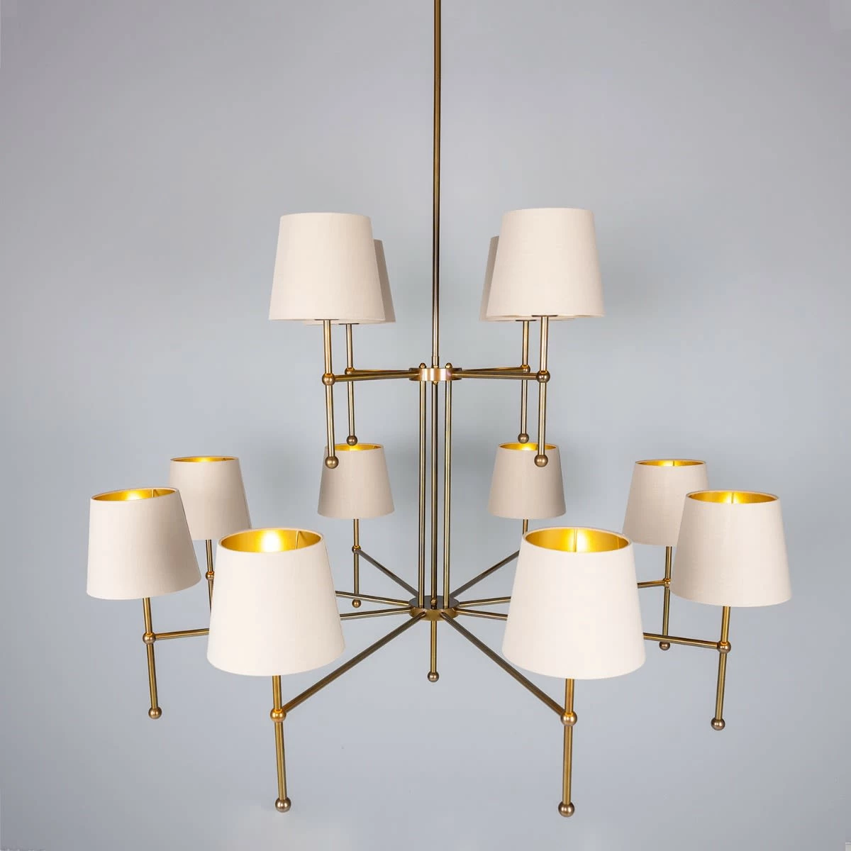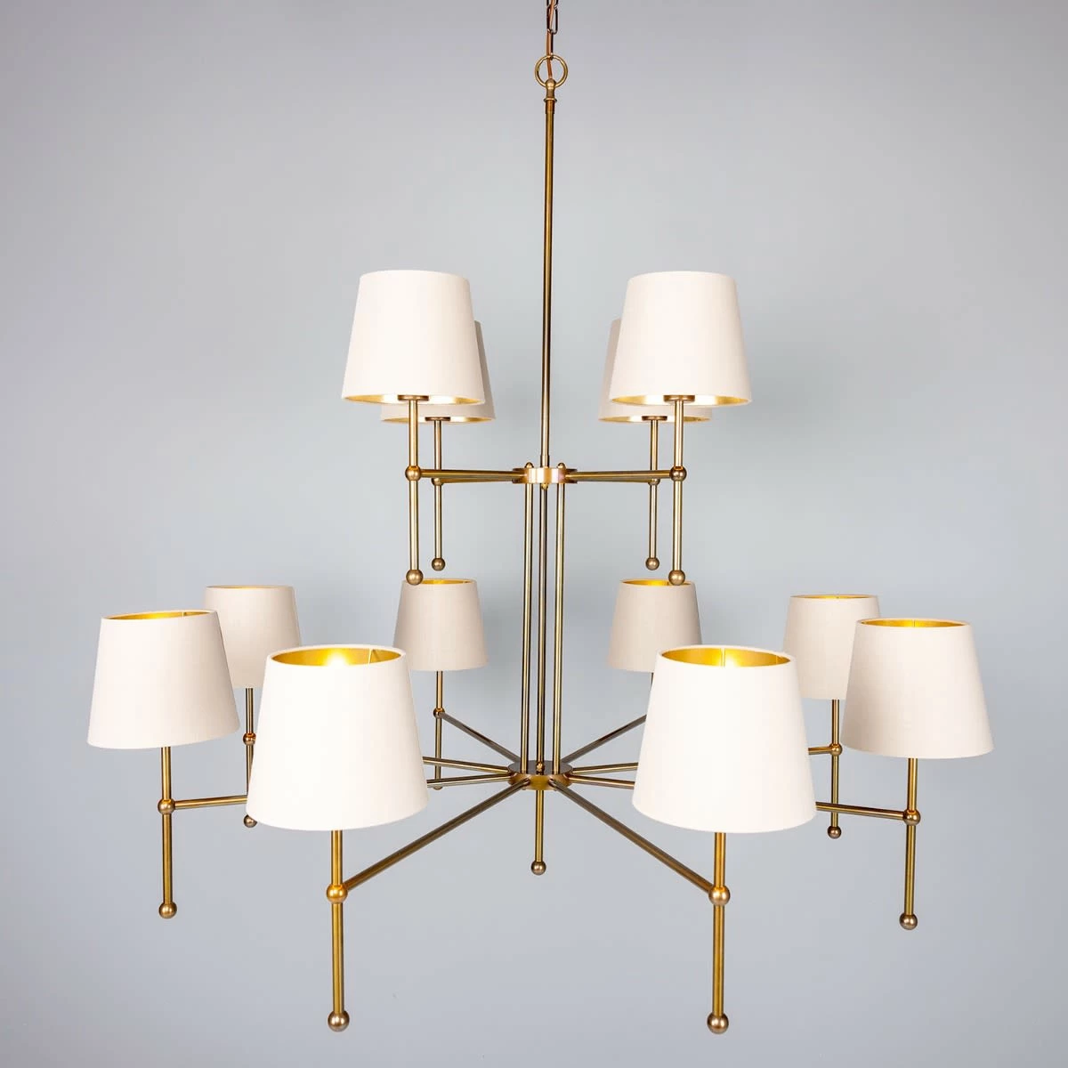 The California chandelier is an elegant, modern chandelier with 12 lights, each supported by a brass arm.