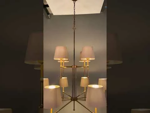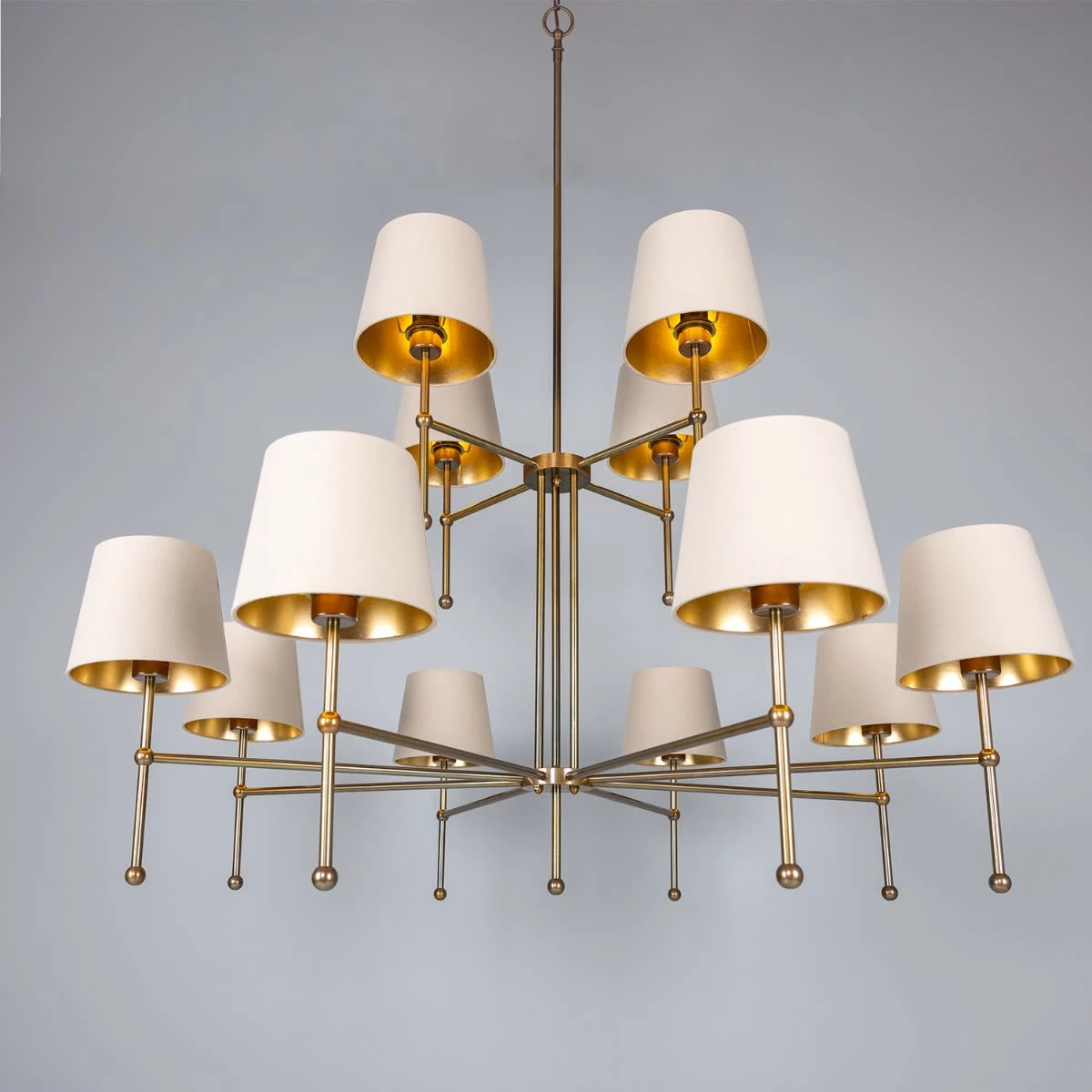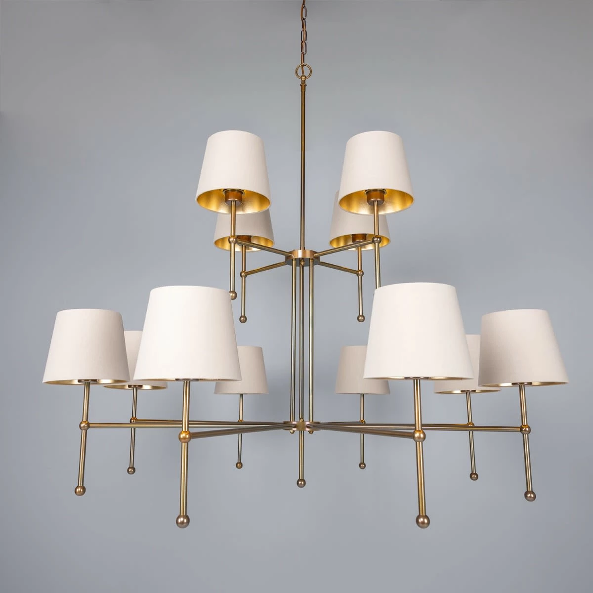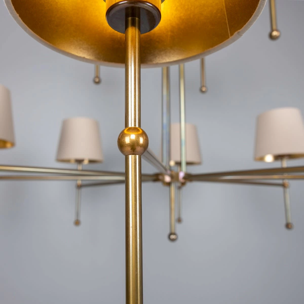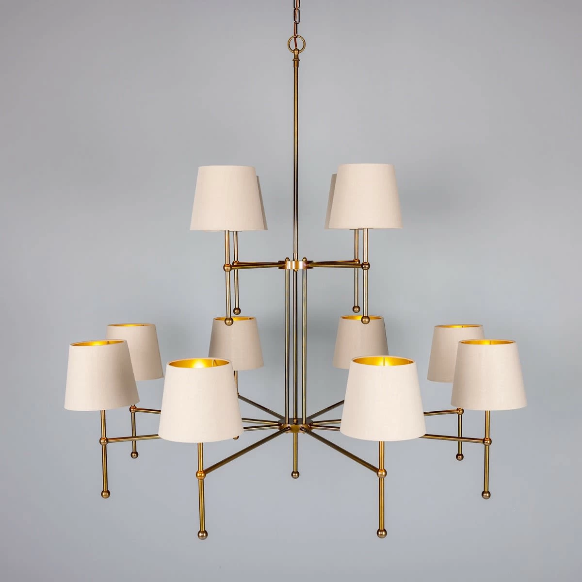 The California chandelier is an elegant, modern chandelier with 12 lights, each supported by a brass arm.