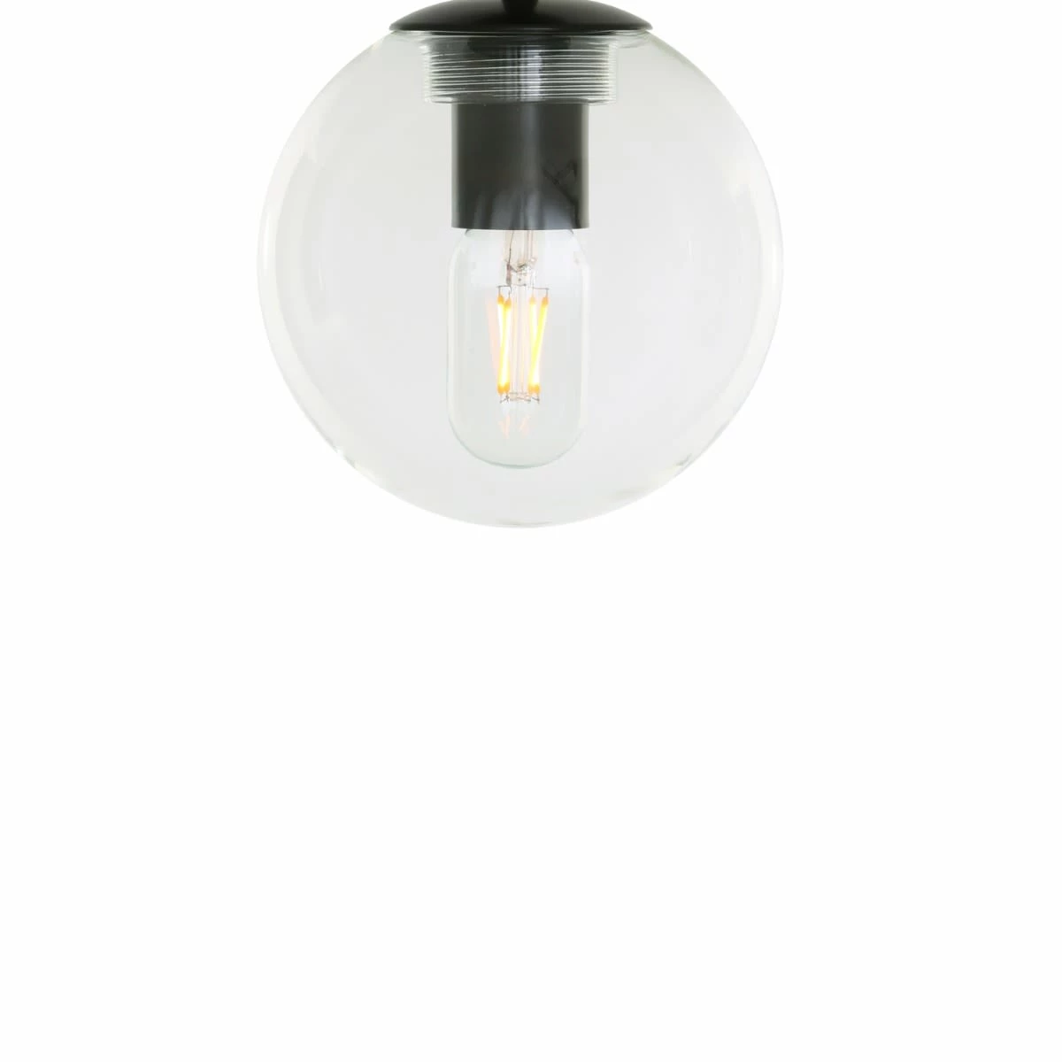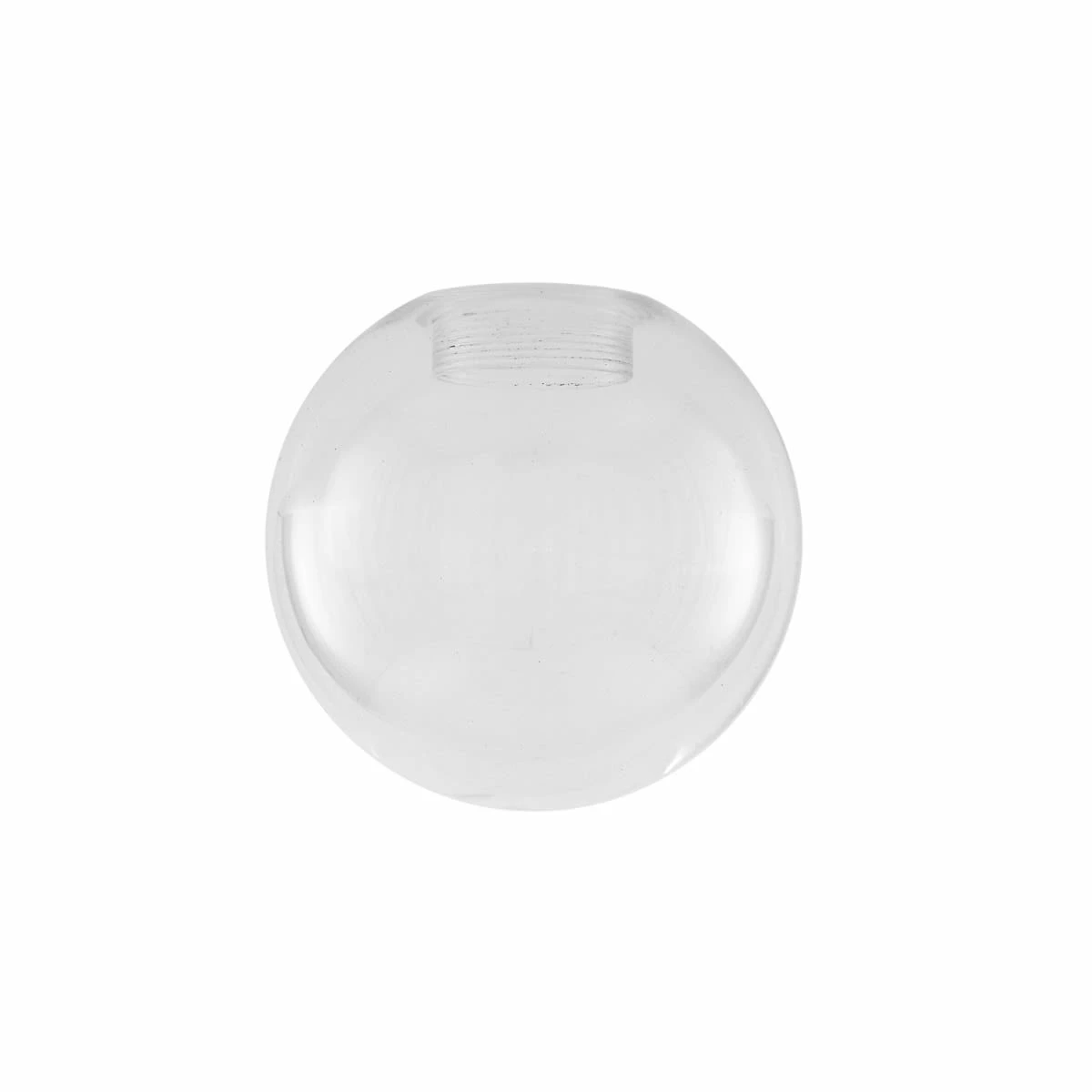 This is a clear 17cm glass globe lamp shade that is internally threaded. Its threaded neck is 6cm in diameter. An E27 lamp holder is housed inside.