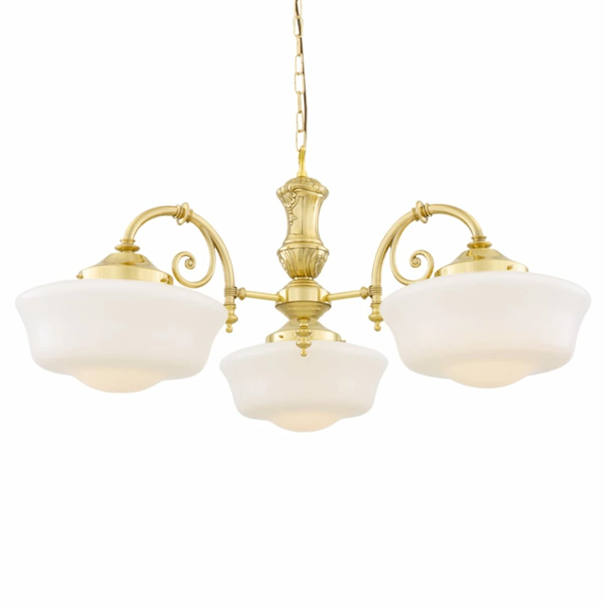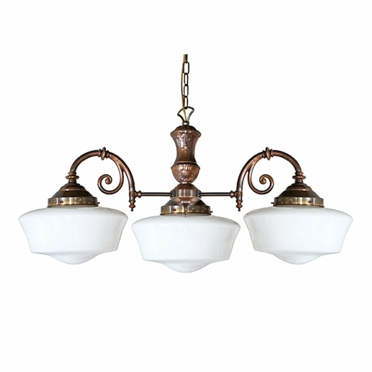 Boasting a traditional design, the Clones 3 Arm 1920’s Schoolhouse Light will grace up any space with its unique style. This schoolhouse chandelier looks beautiful above dining room tables in homes or in rooms requiring large quantities of light. Designed to accommodate a variety of spaces and ceiling heights, this schoolhouse ceiling light fixture casts a soft ambient light over a wide area with its five schoolhouse shades. Suitable for a wide range of settings, this multi-schoolhouse chandelier looks great when lit with a warm bulb for a comfortable lighting. Bulbs are sold separately.