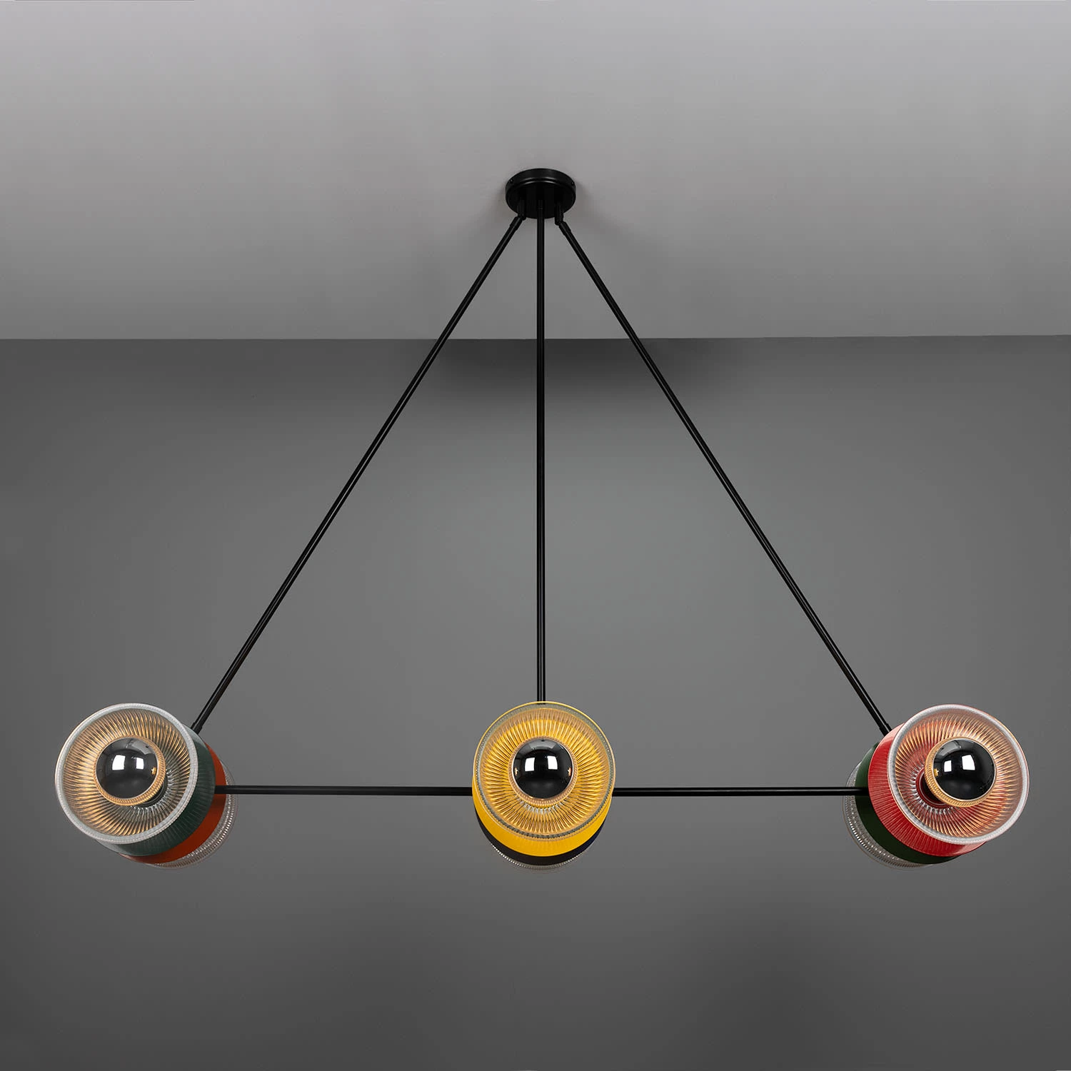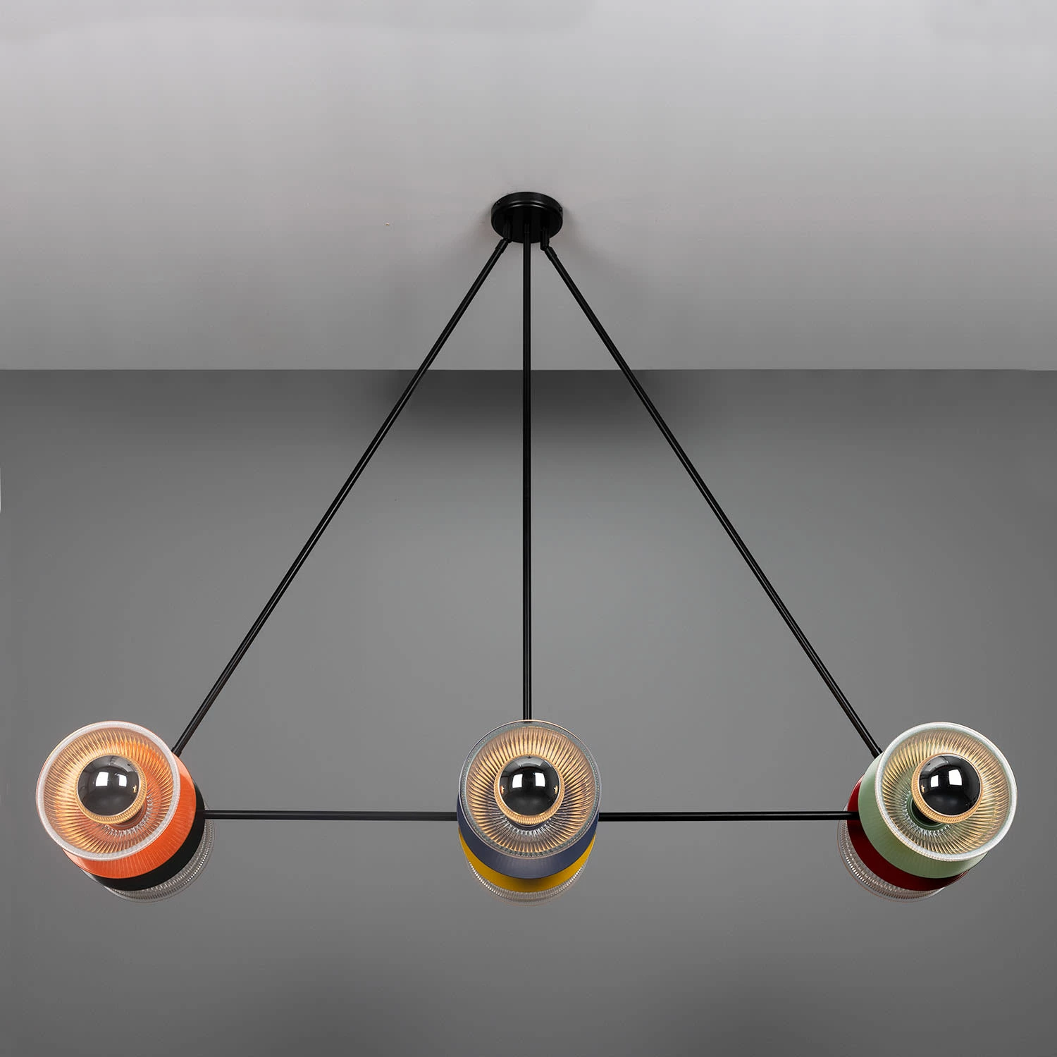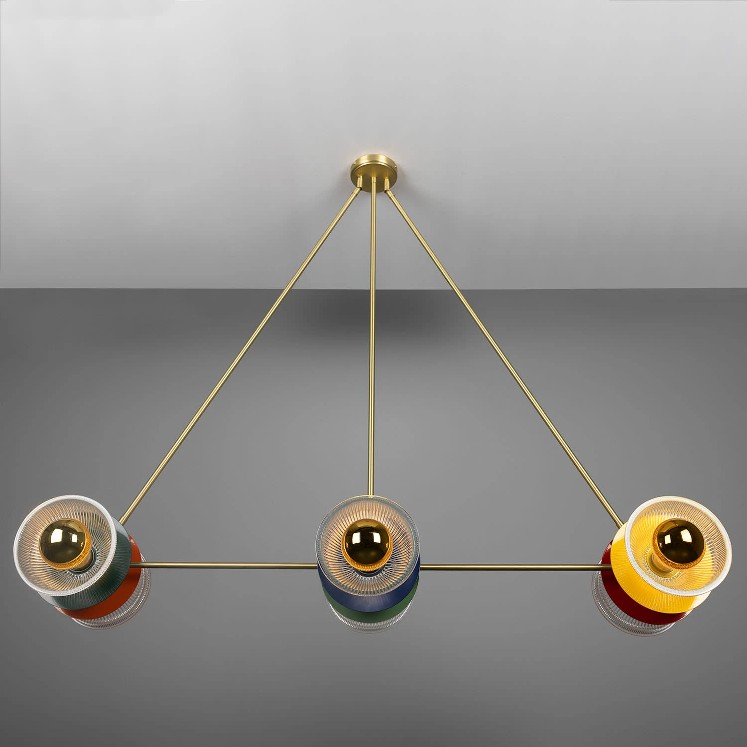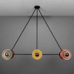 The Eclipse multicoloured chandelier is a modern luminaire with a triangular frame and coloured metal discs.