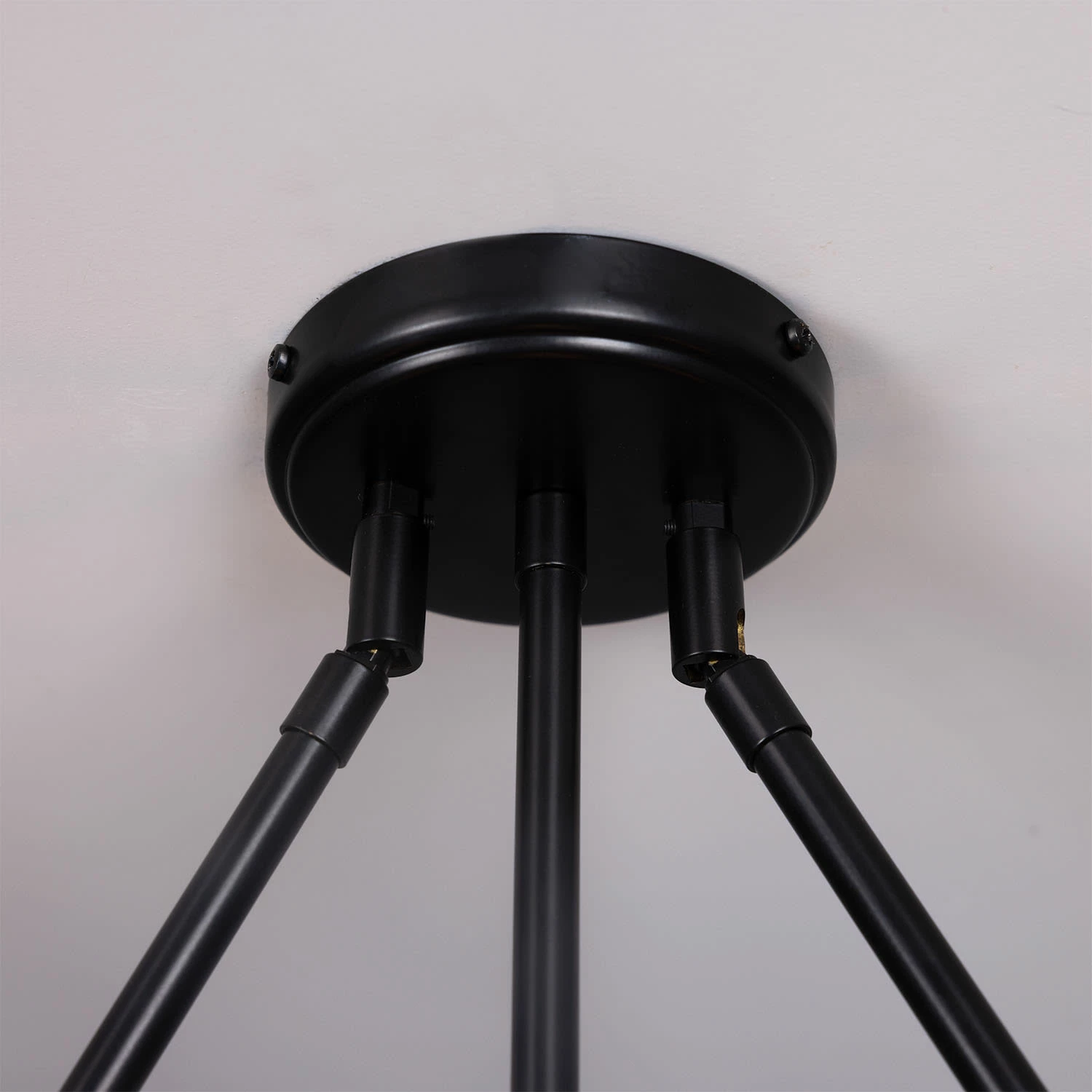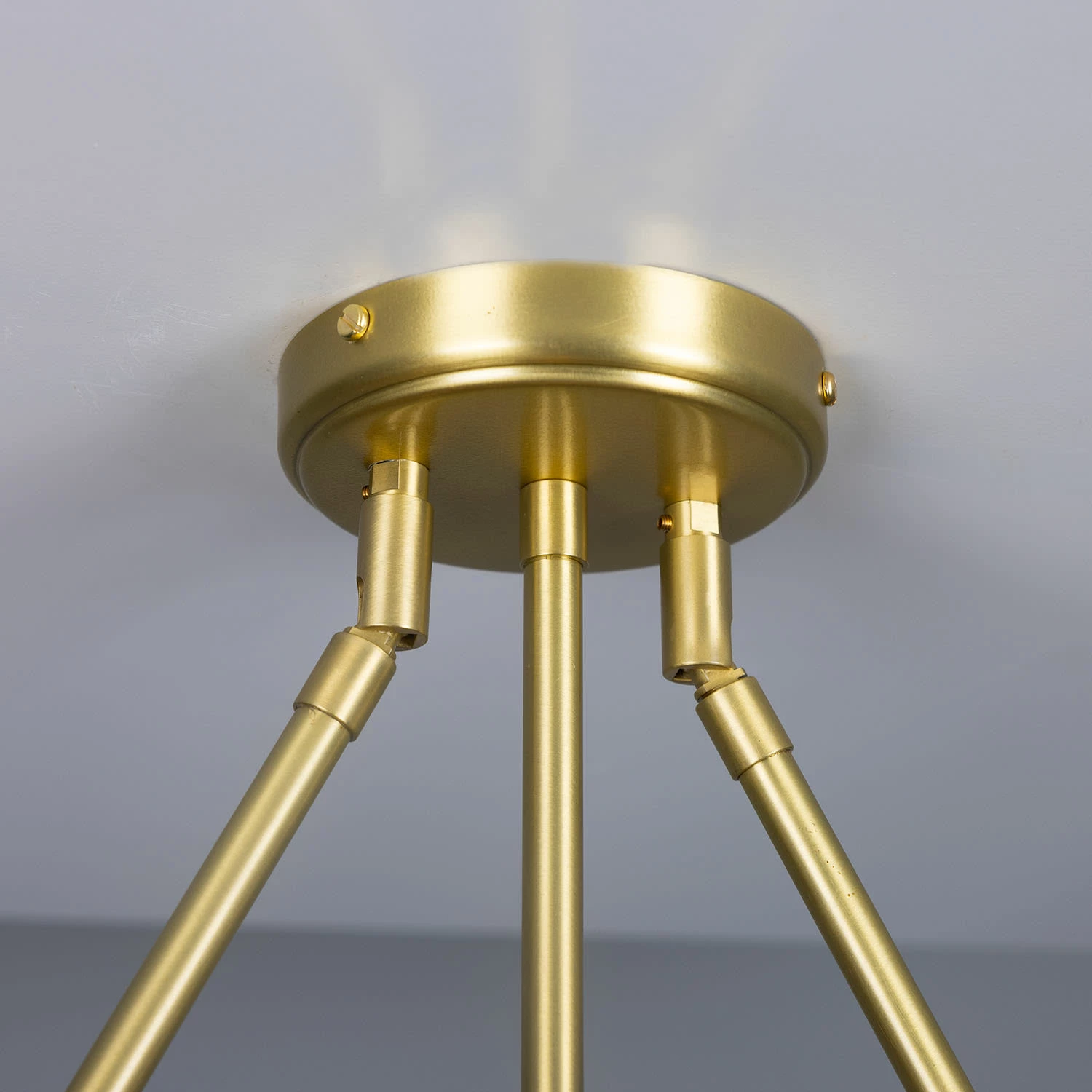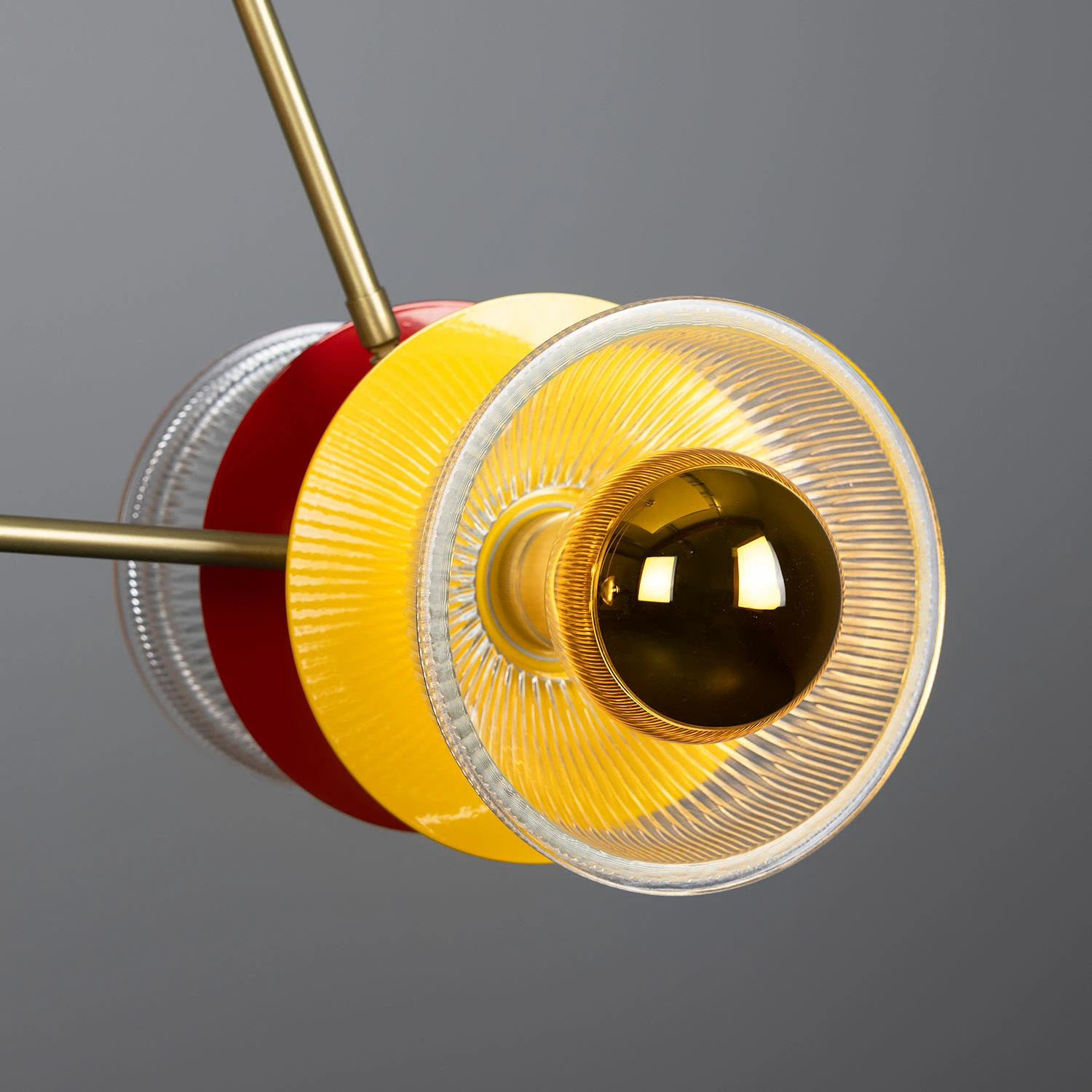 Three brass bars descend from the ceiling rose, embracing six 20cm Holophane glass lamp shades. The light reflects through the reeded glass and casts shadows and rays of light onto the coloured discs, resembling an eclipse.