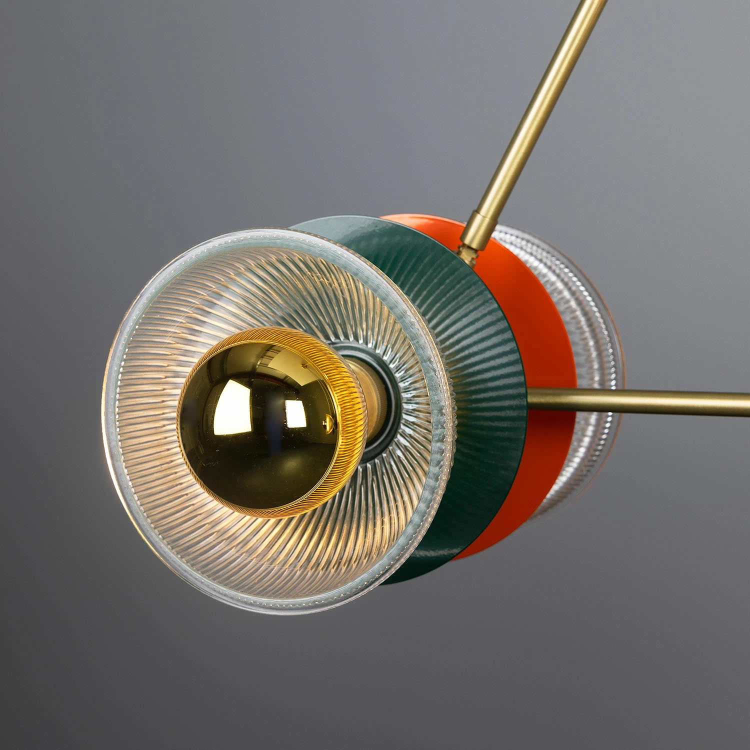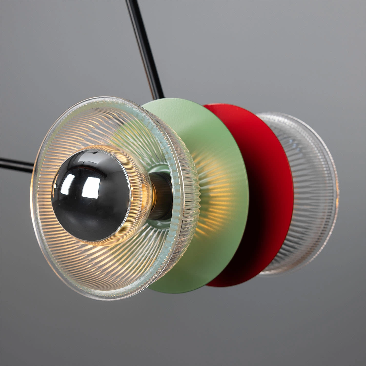 The circular discs behind each glass lamp shade are placed back-to-back and powder-coated in different colours. Those colours are orange, racing green, red, sage green, sapphire blue and yellow. They create a stunning contrast and can be arranged in any way to best suit your vision.