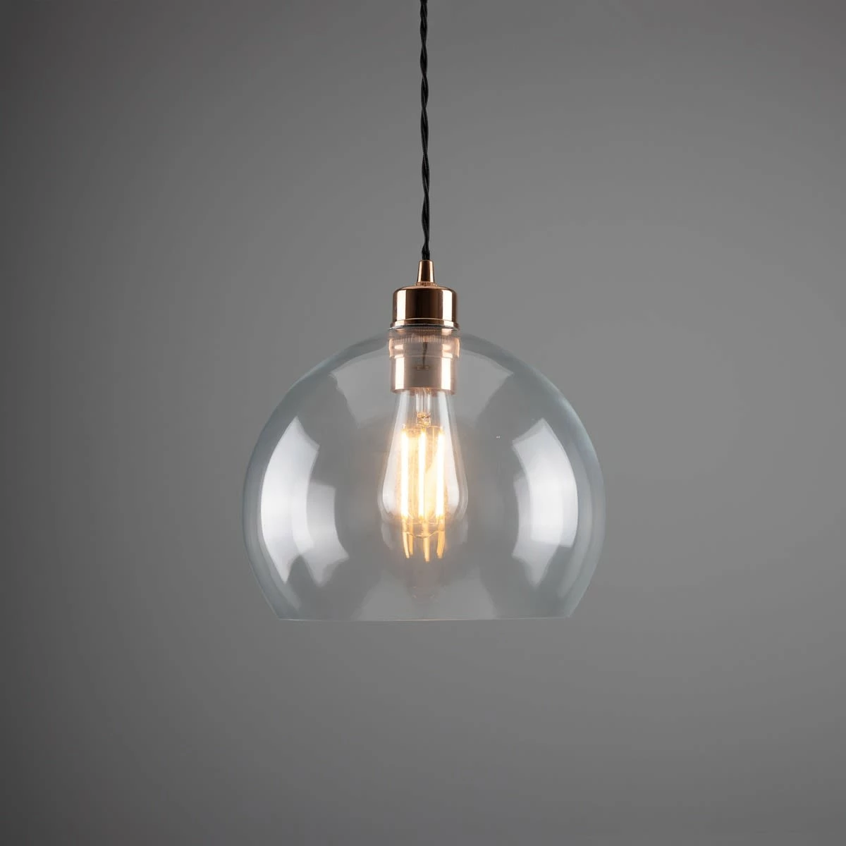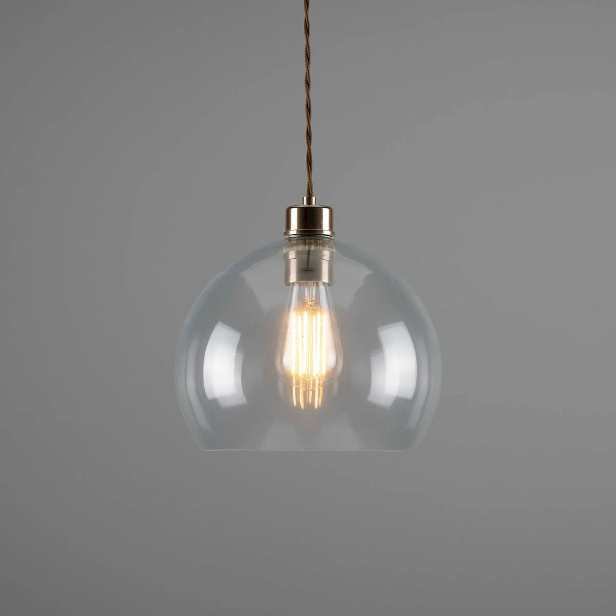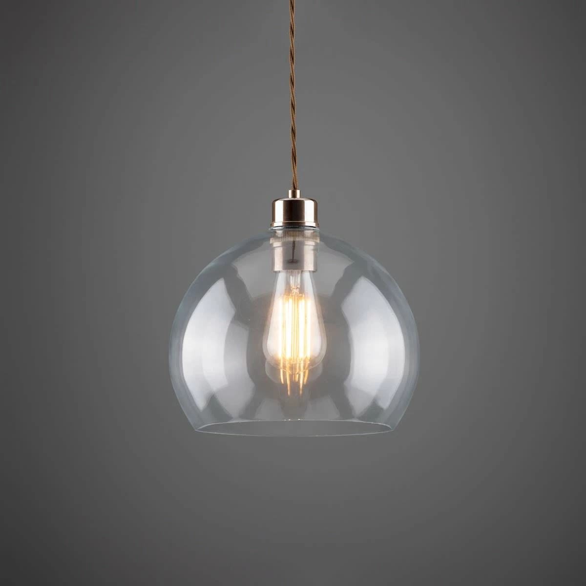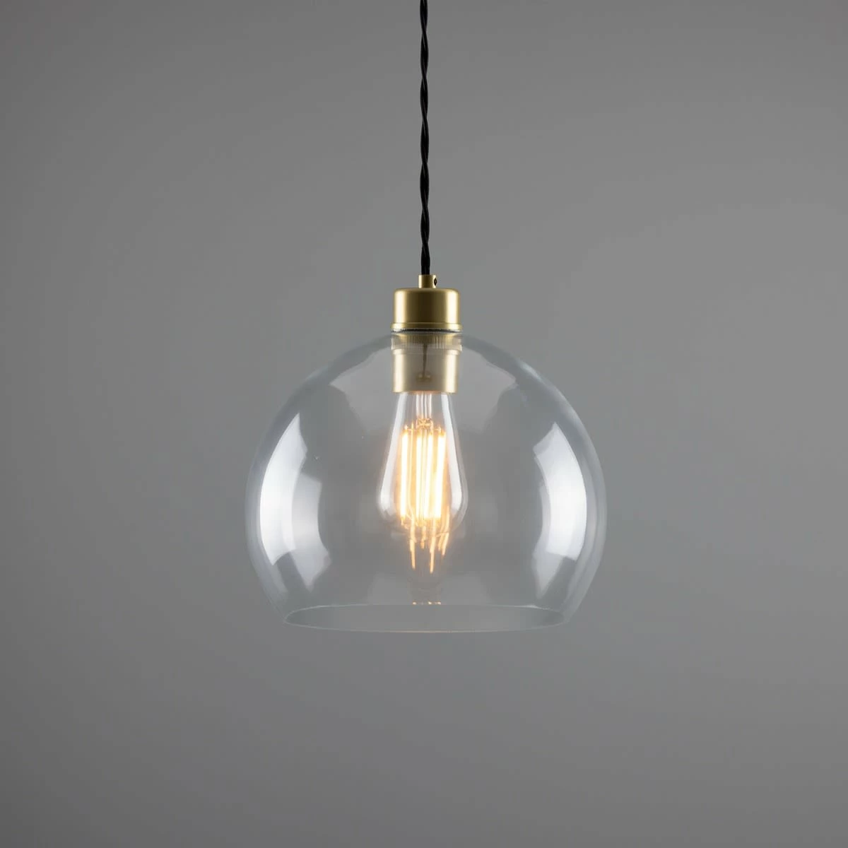 Designed to showcase the warmth of Edison-style bulbs, the Eden 25cm Clear Sphere Pendant will add a touch of unique style to your home. This glass pendant light will add a fresh, clean look to kitchens or dining areas. Simple and chic, this glass pendant light with an open bottom will enhance a visual comfort. Hang as individual pendant over a desk or kitchen work space or cluster several together for a more modern look. Suitable for any minimalist or industrial interiors, this glass pendant light looks fantastic when lit with an Edison squirrel cage bulb for a soft lighting. Bulbs are sold separately.