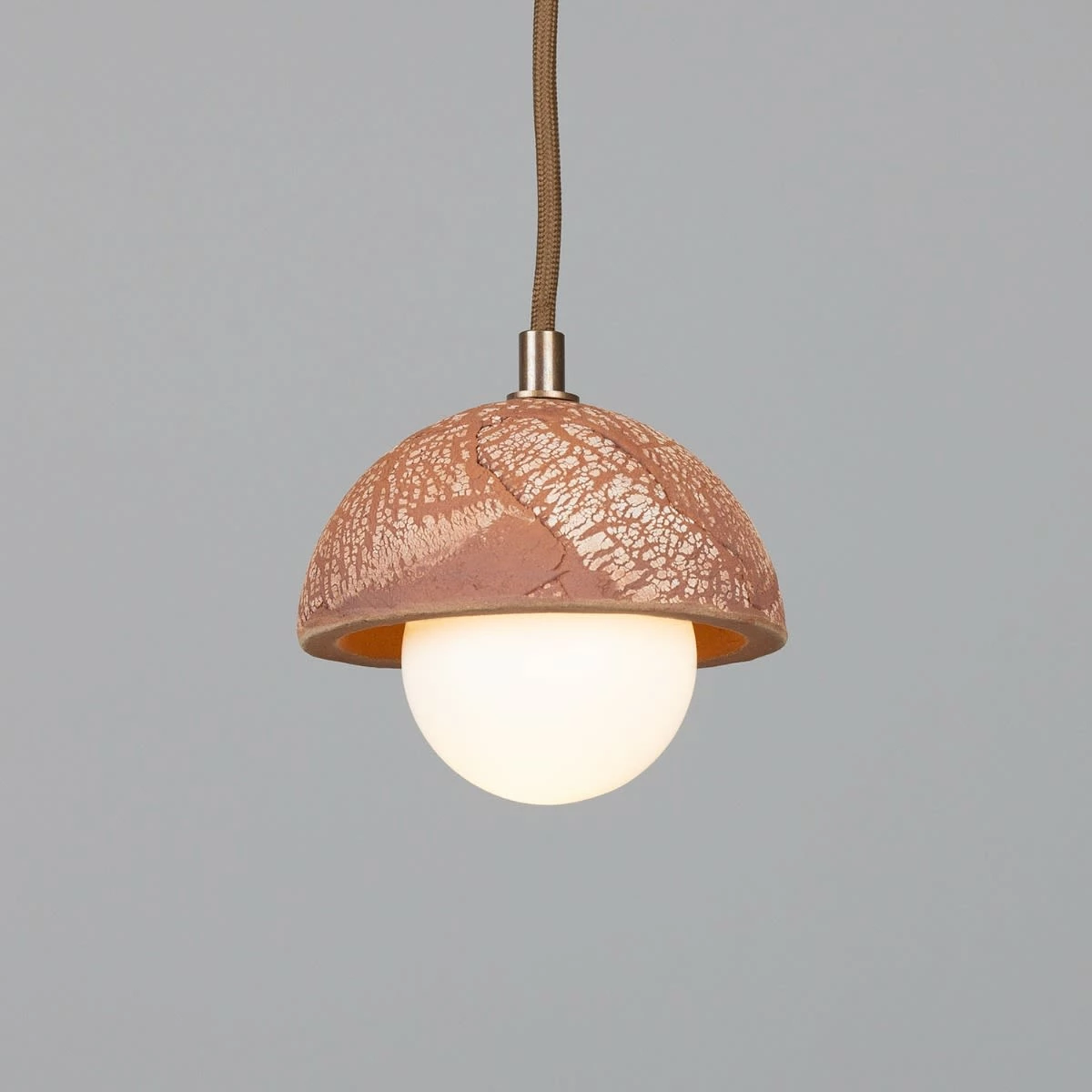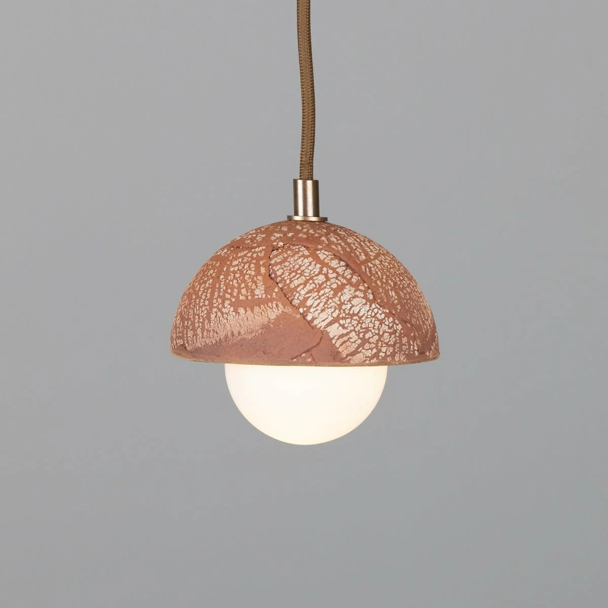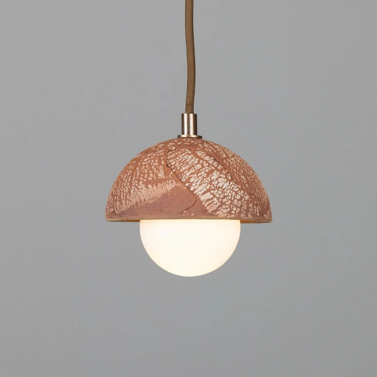 The Ferox Red Iron ceramic dome pendant features a small brass cord grip that is available in five different finishes: antique brass, antique silver, polished brass, satin brass and powder-coated matte black.
