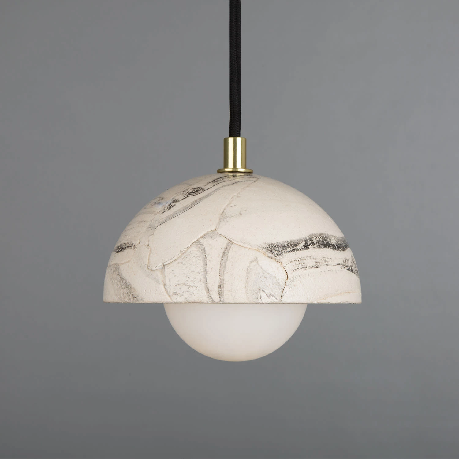 The Ferox marbled ceramic pendant is named after the flowering African plant and its shape resembles the bud of a flower about to bloom.