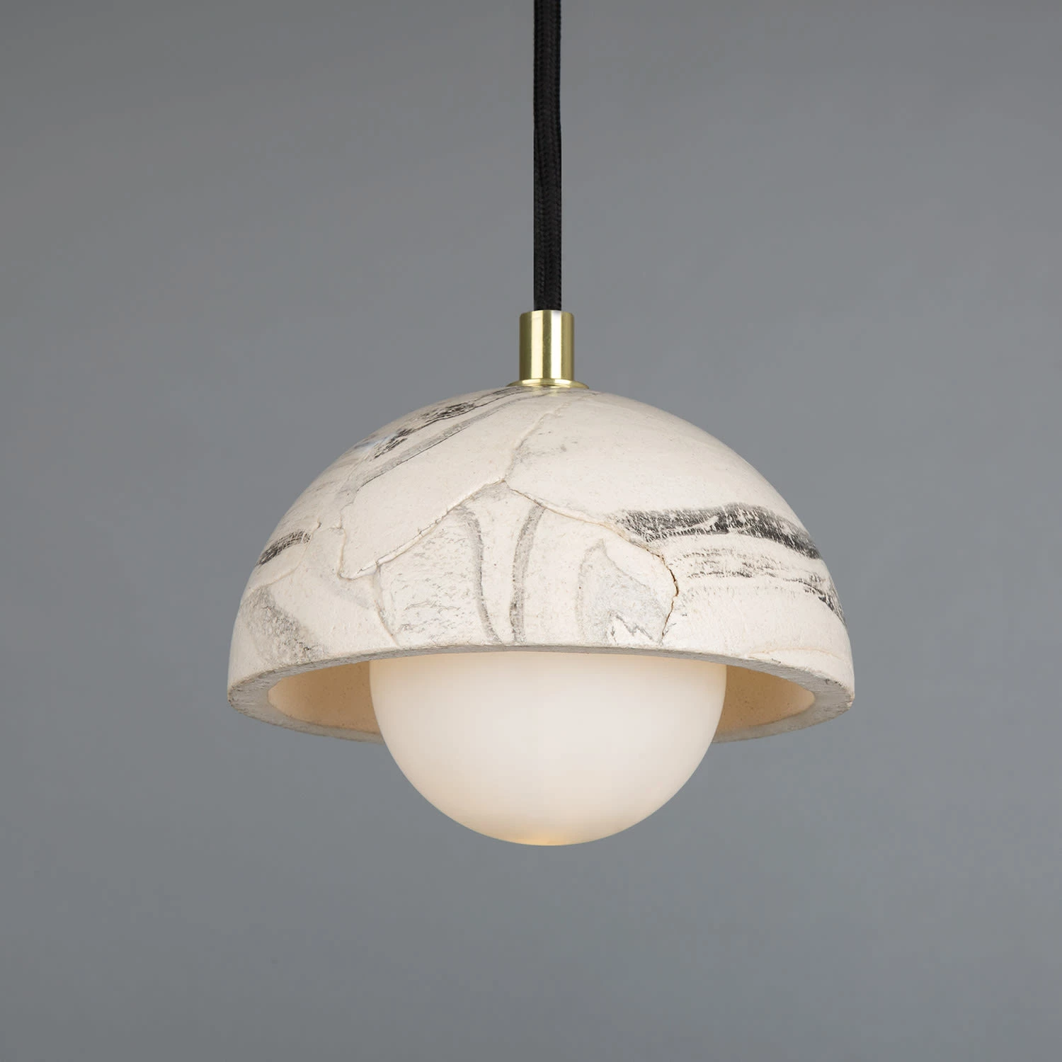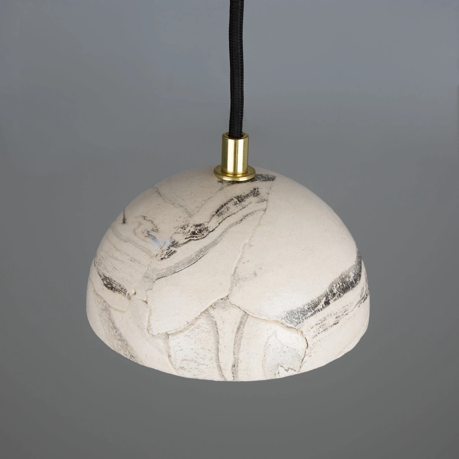 This unique design is enhanced by its marbled texture with a fusion of grey and white hues. This mix of tones creates a striking and sleek colour finish, complemented by the gentle cast of light dispersed by the ceramic and glass pendant.
