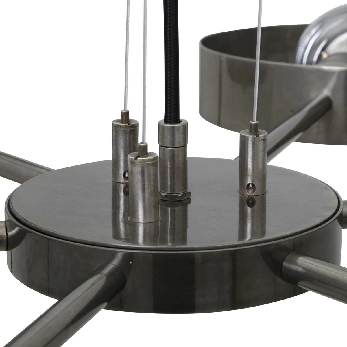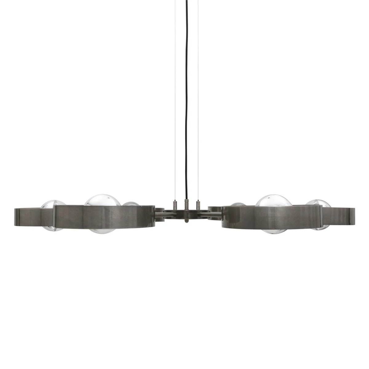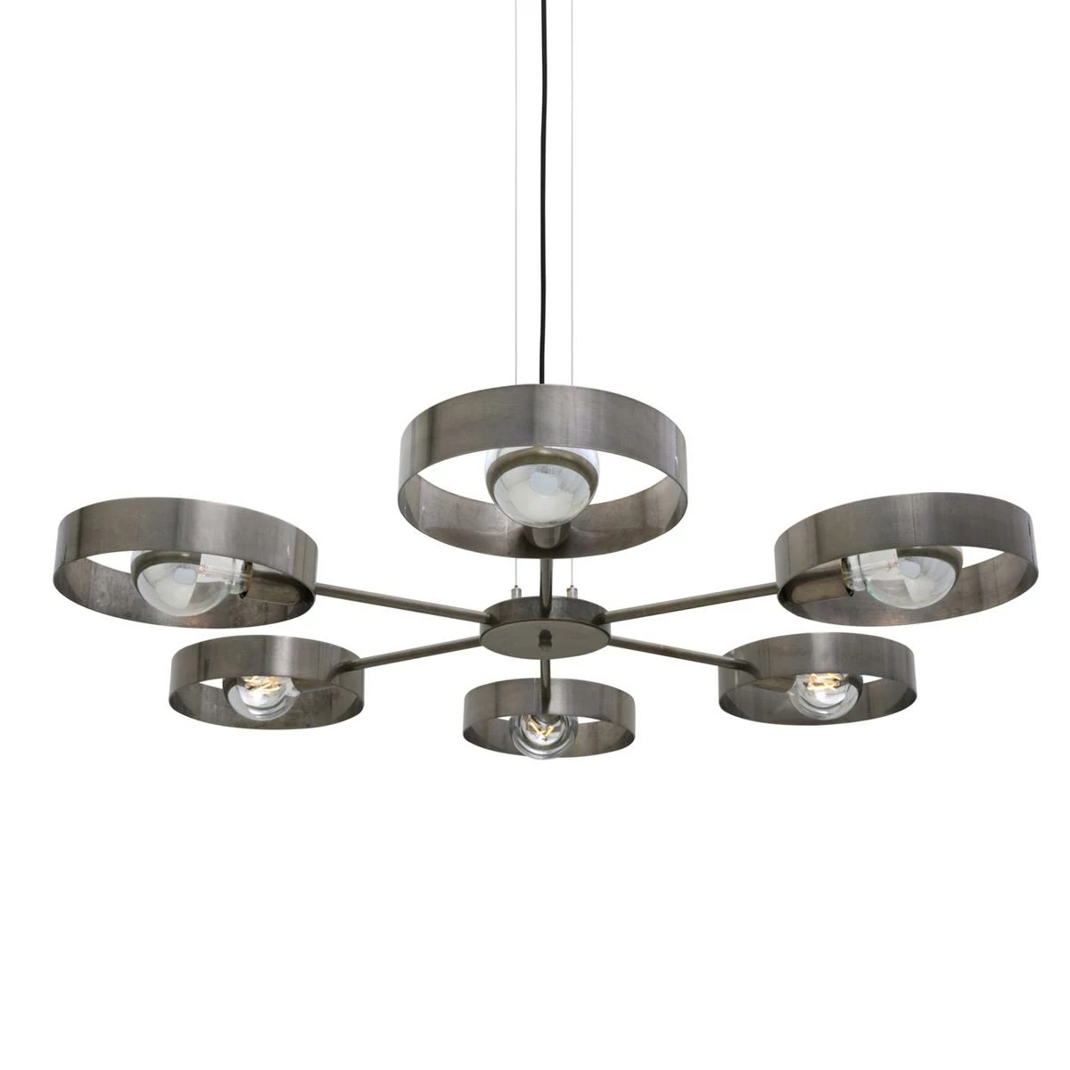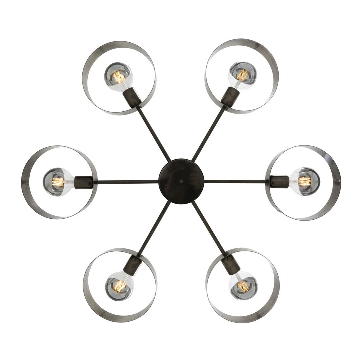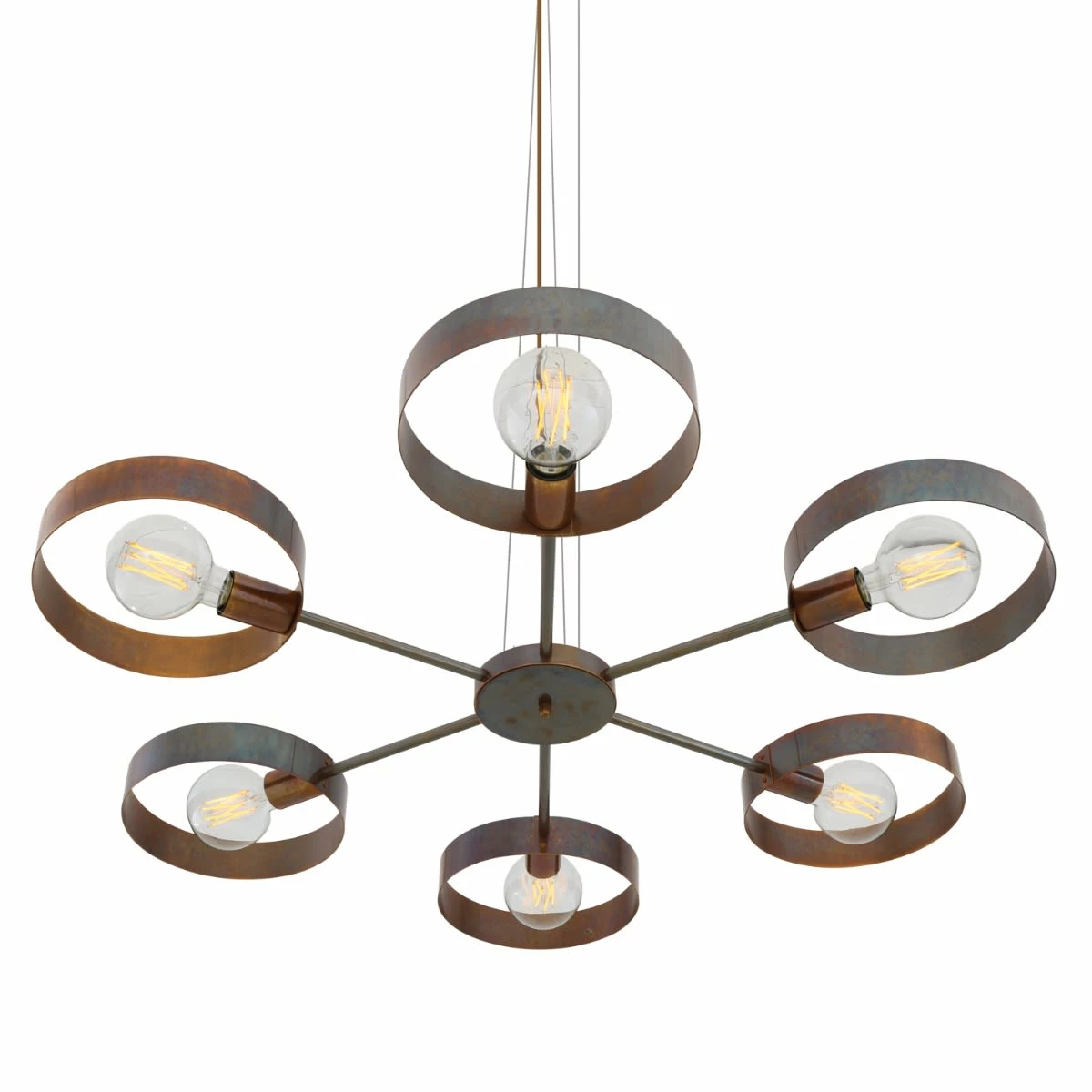 The Fossa chandelier is an industrial chandelier with six arms that radiate from its centre. At the end of each arm is a lamp holder and circular brass ring.