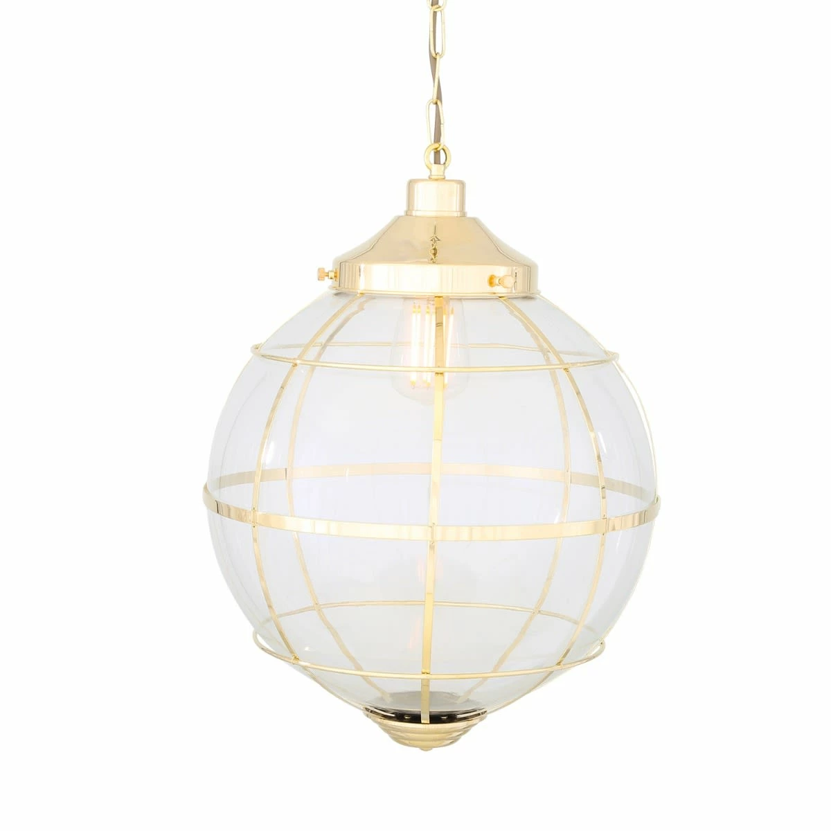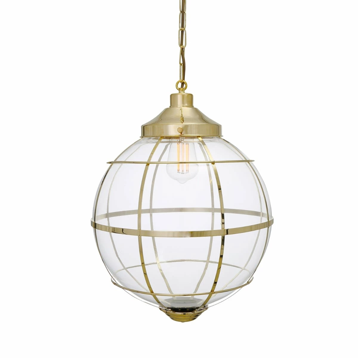 The clear glass globe of the Henlow pendant measures 35cm in diameter and overall the fixture is 46cm in height.