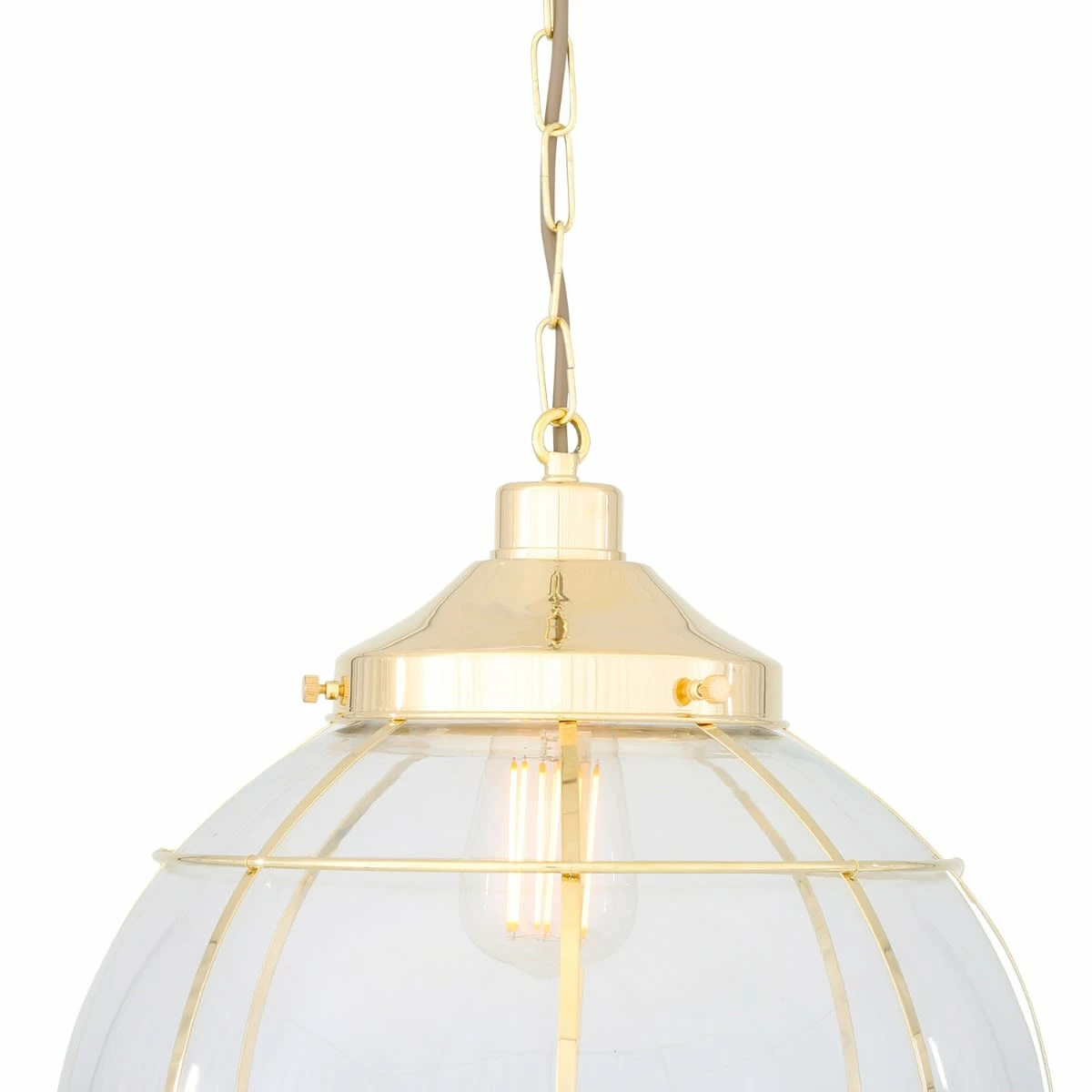 Available in two stylish colour finishes – natural brass or antique brass – this glass globe cage pendant can satisfy a variety of interior colour palettes.