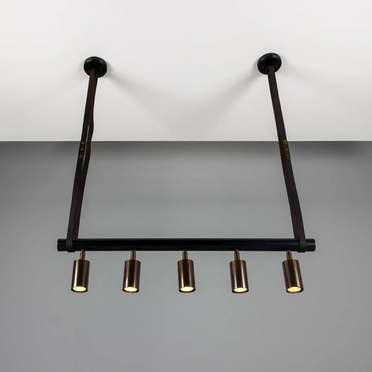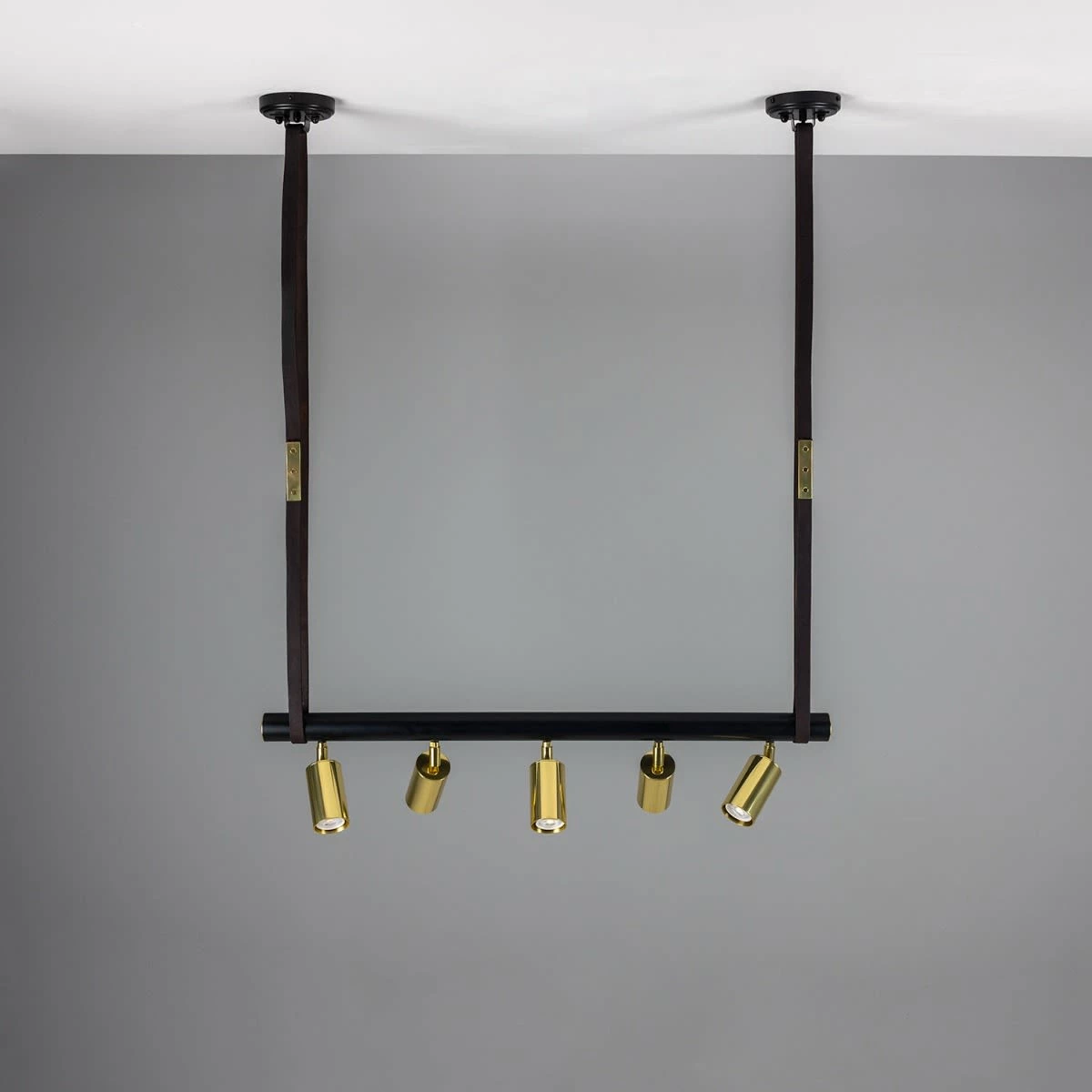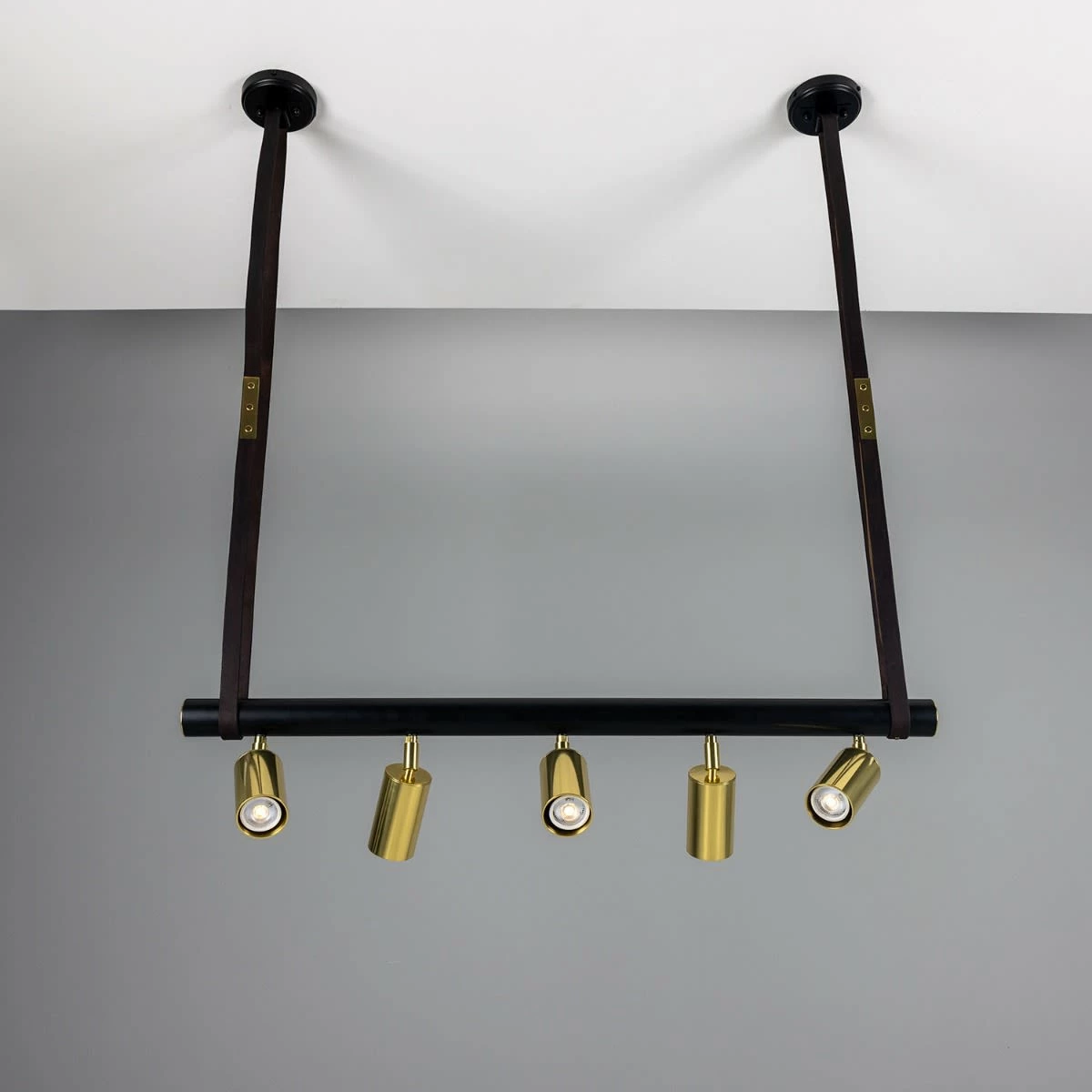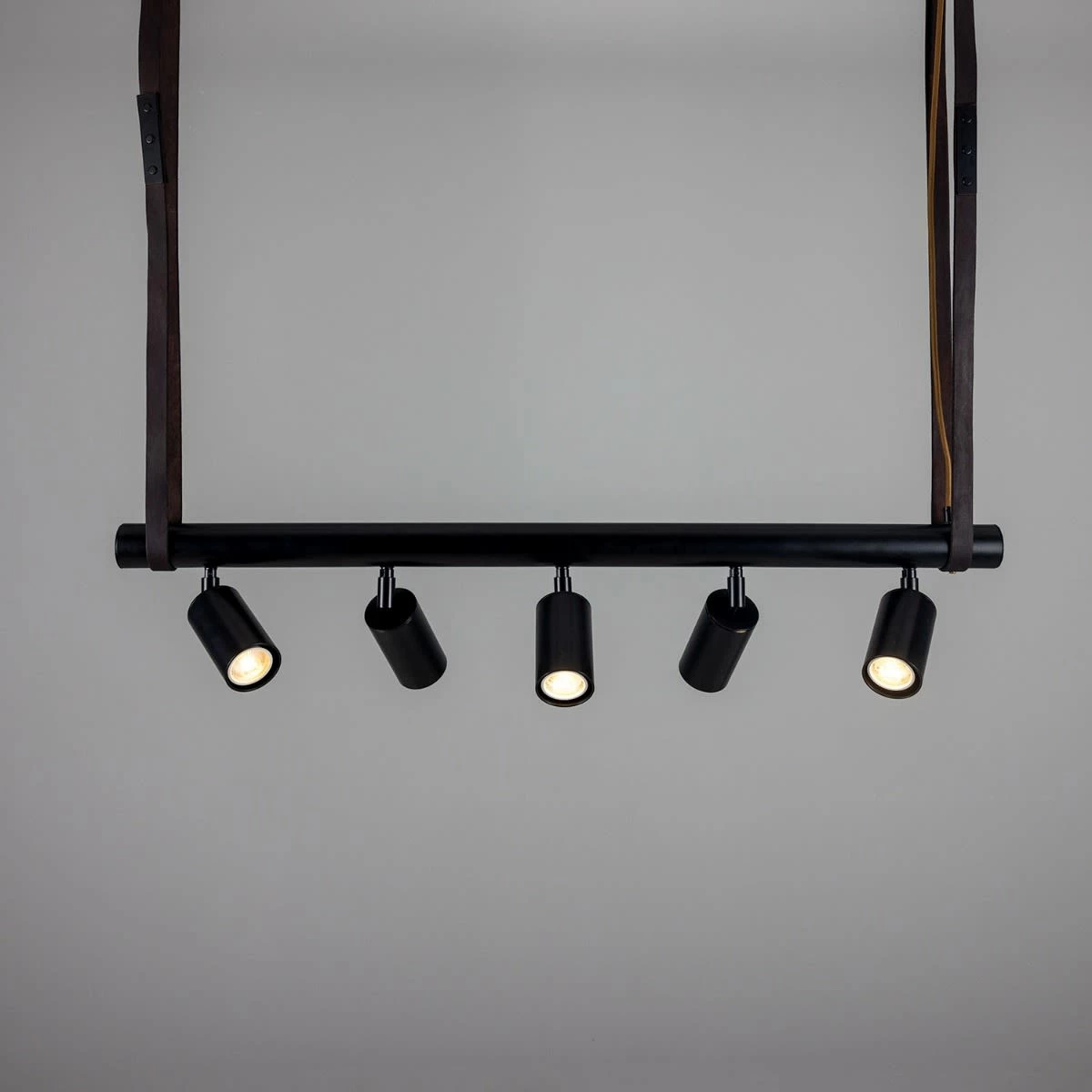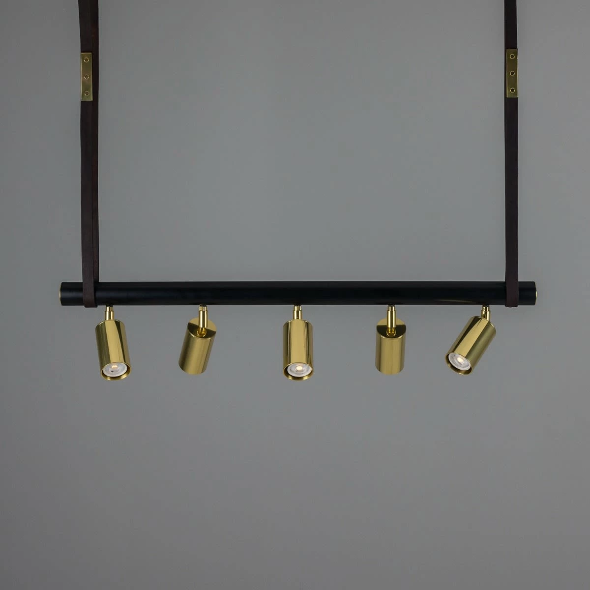 Suspended from two brass ceiling roses with leather straps, a matte black steel tube with brass end caps supports five directional spot lights. Housed inside each brass cylinder light is a GU10 LED bulb (sold separately). The steel tube measures 40″ in length.