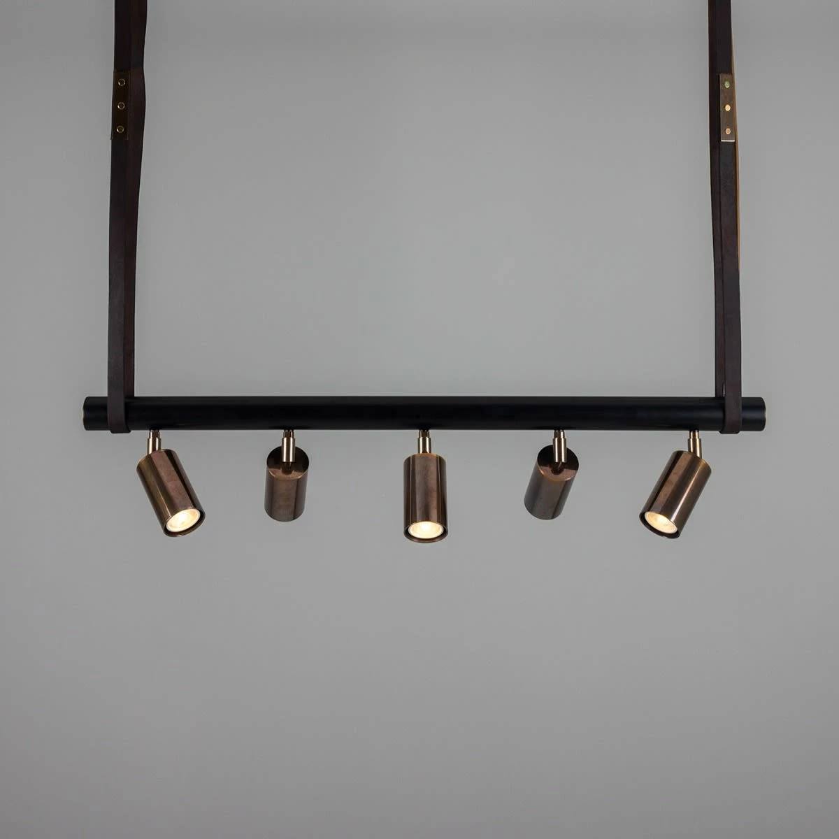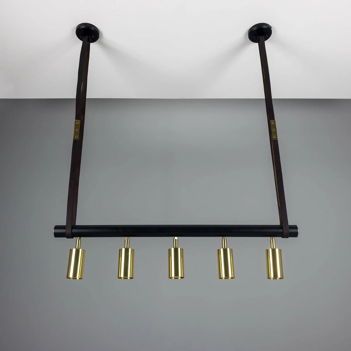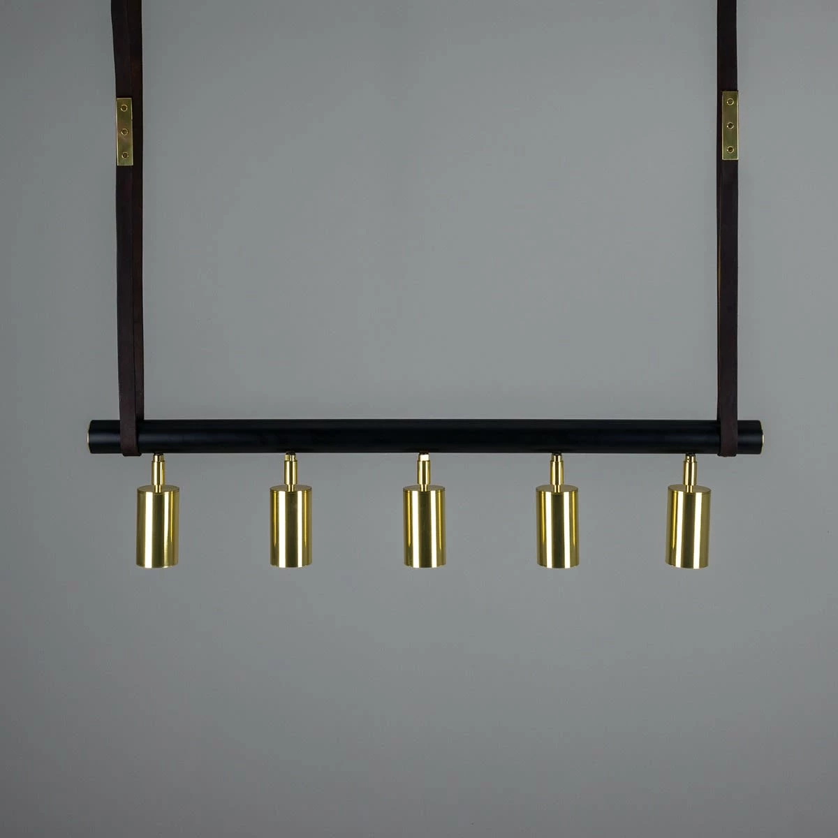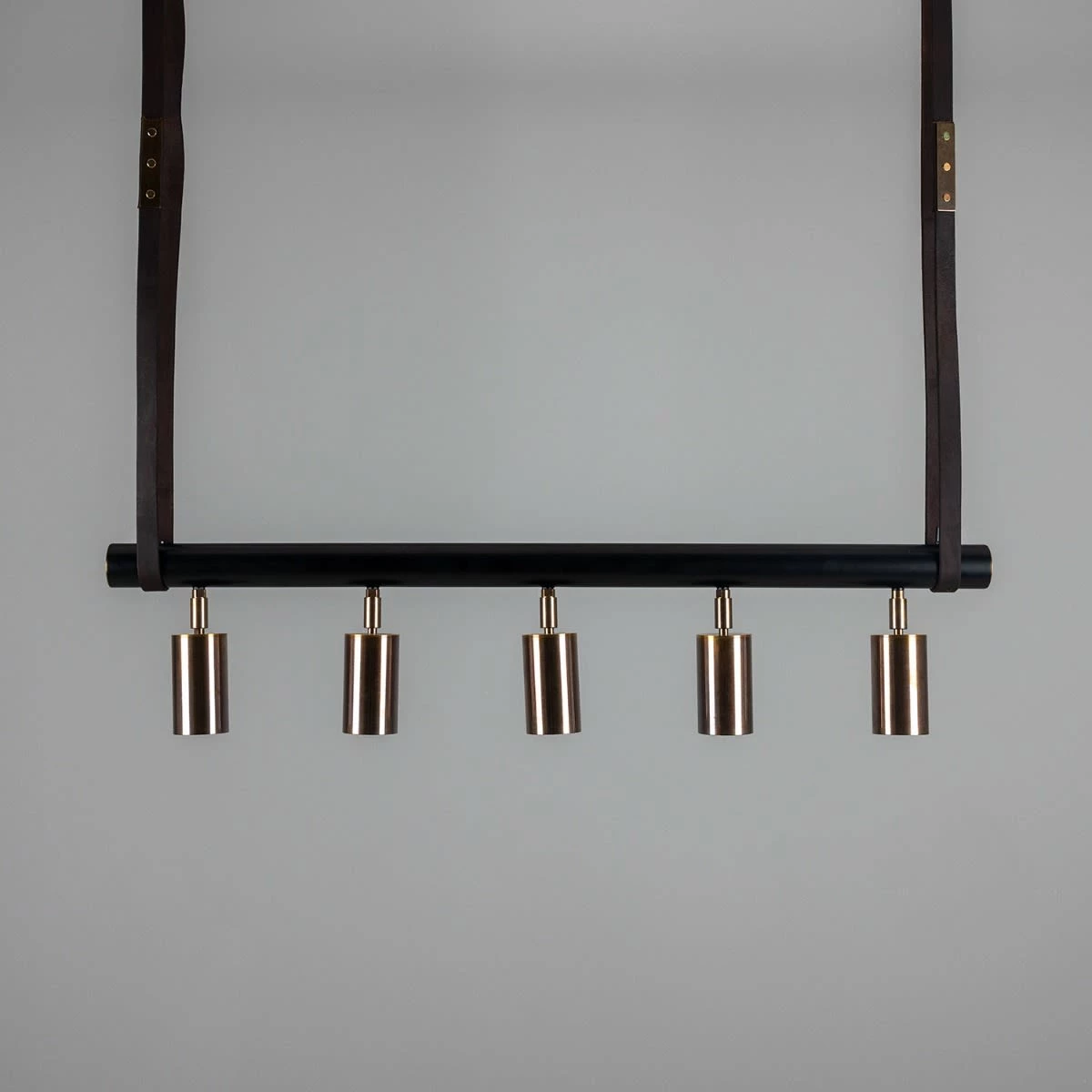 Suspended from two brass ceiling roses with leather straps, a matte black steel tube with brass end caps supports five directional spot lights. Housed inside each brass cylinder light is a GU10 LED bulb (sold separately). The steel tube measures 40″ in length.