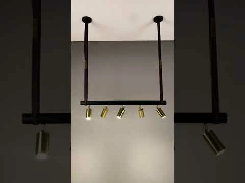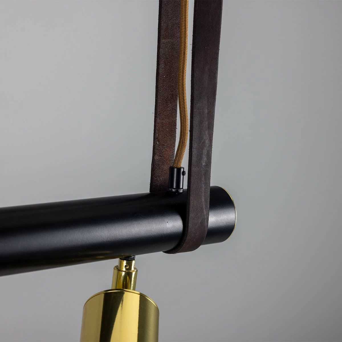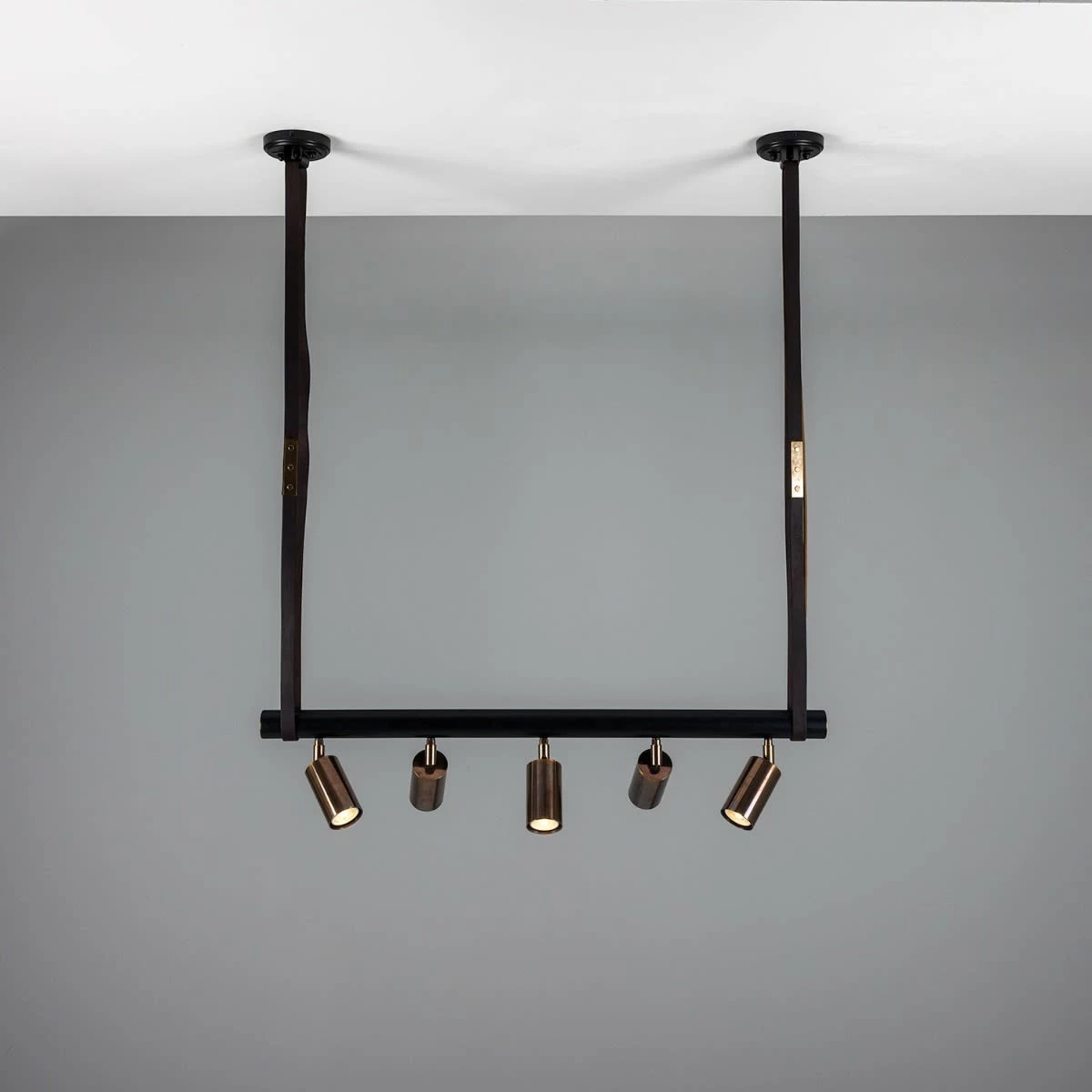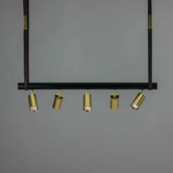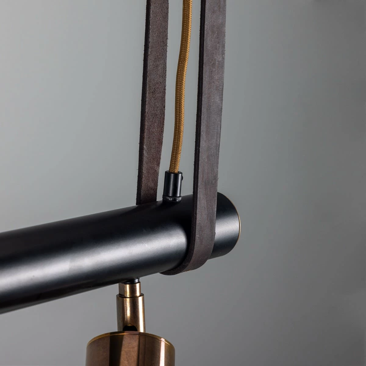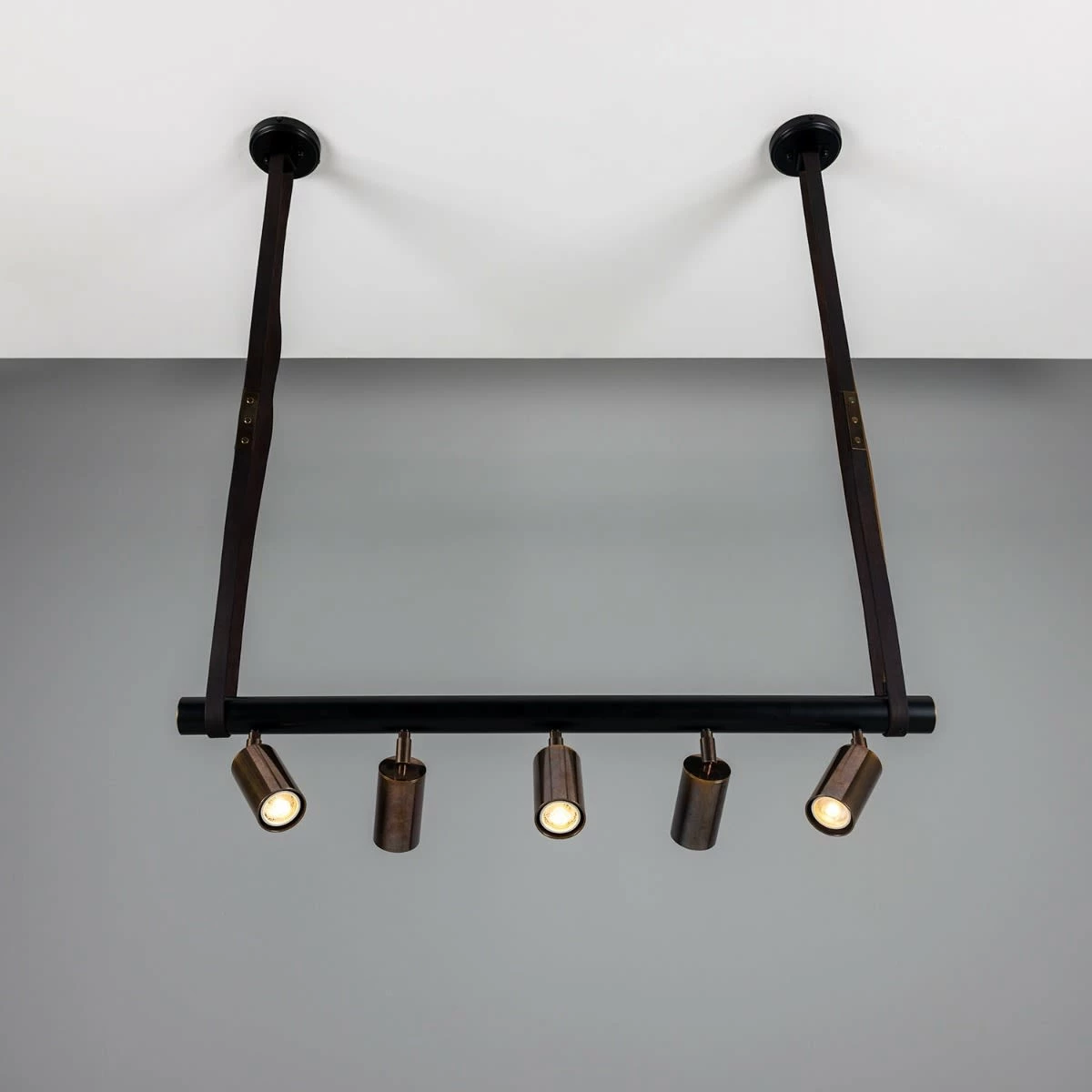 Suspended from two brass ceiling roses with leather straps, a matte black steel tube with brass end caps supports five directional spot lights. Housed inside each brass cylinder light is a GU10 LED bulb (sold separately). The steel tube measures 40″ in length.