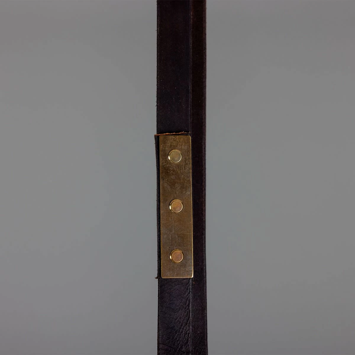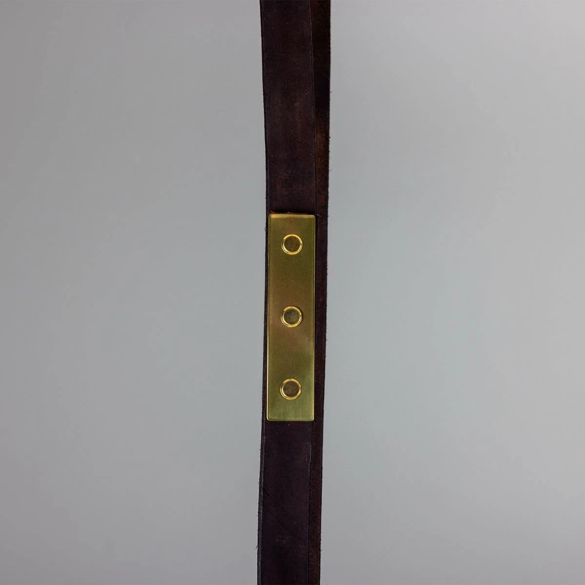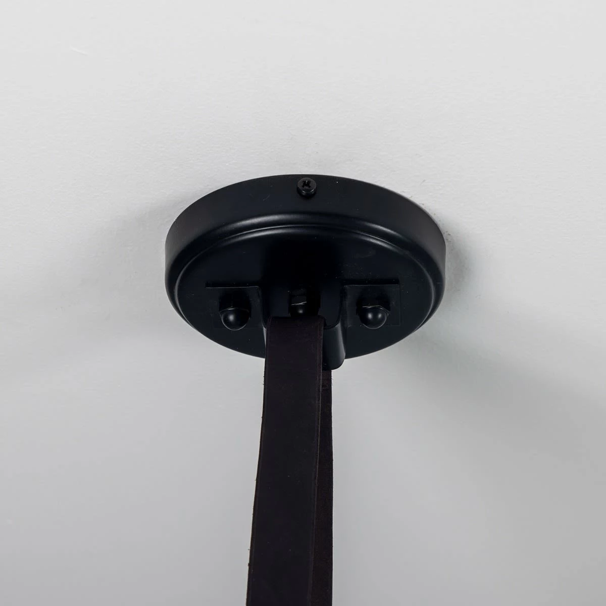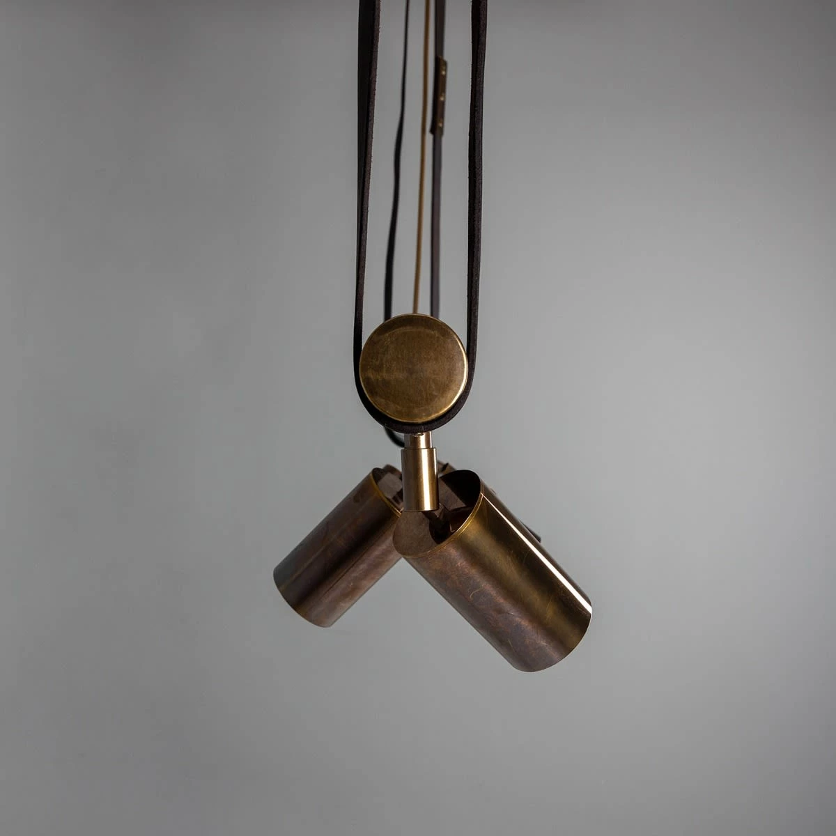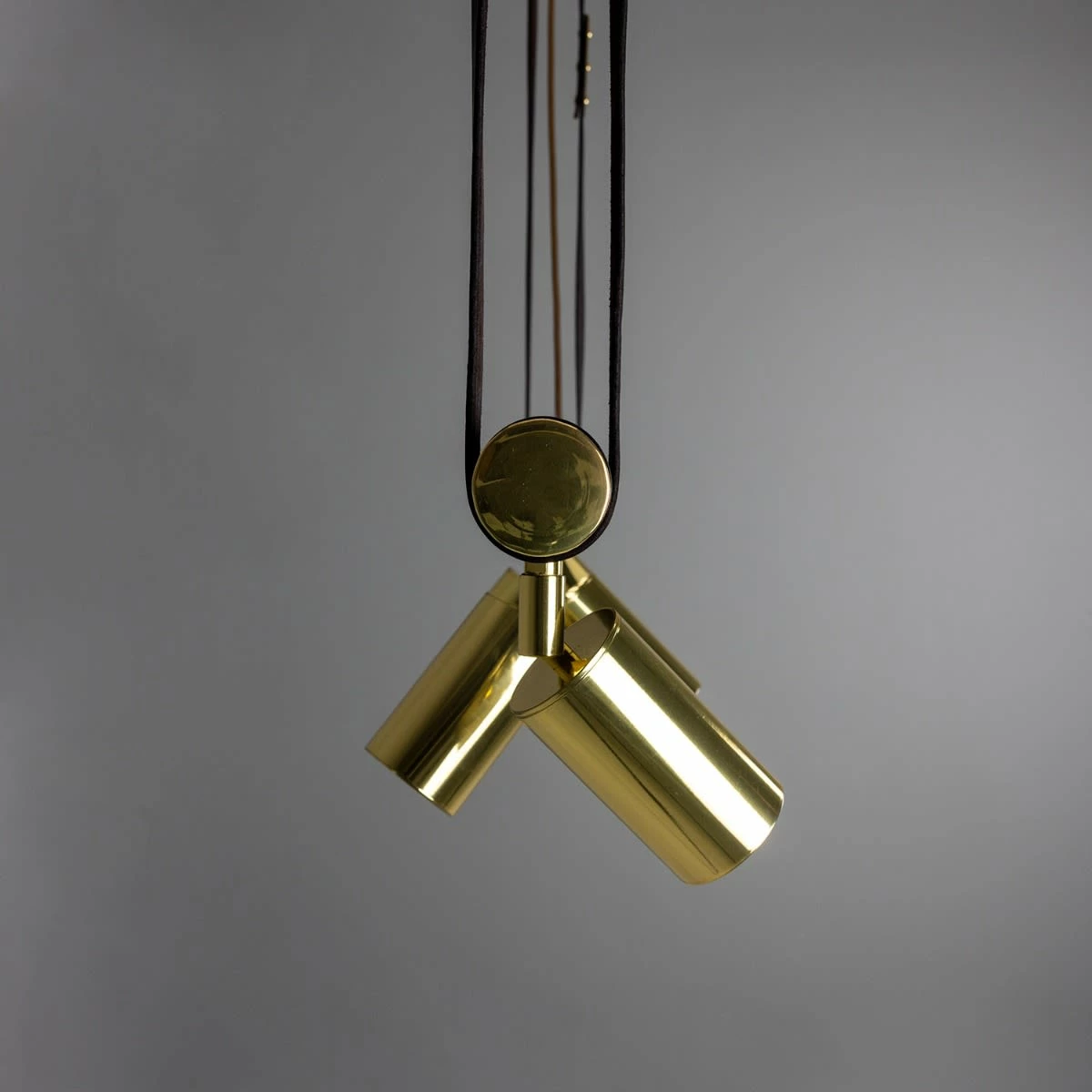 Suspended from two brass ceiling roses with leather straps, a matte black steel tube with brass end caps supports five directional spot lights. Housed inside each brass cylinder light is a GU10 LED bulb (sold separately). The steel tube measures 40″ in length.