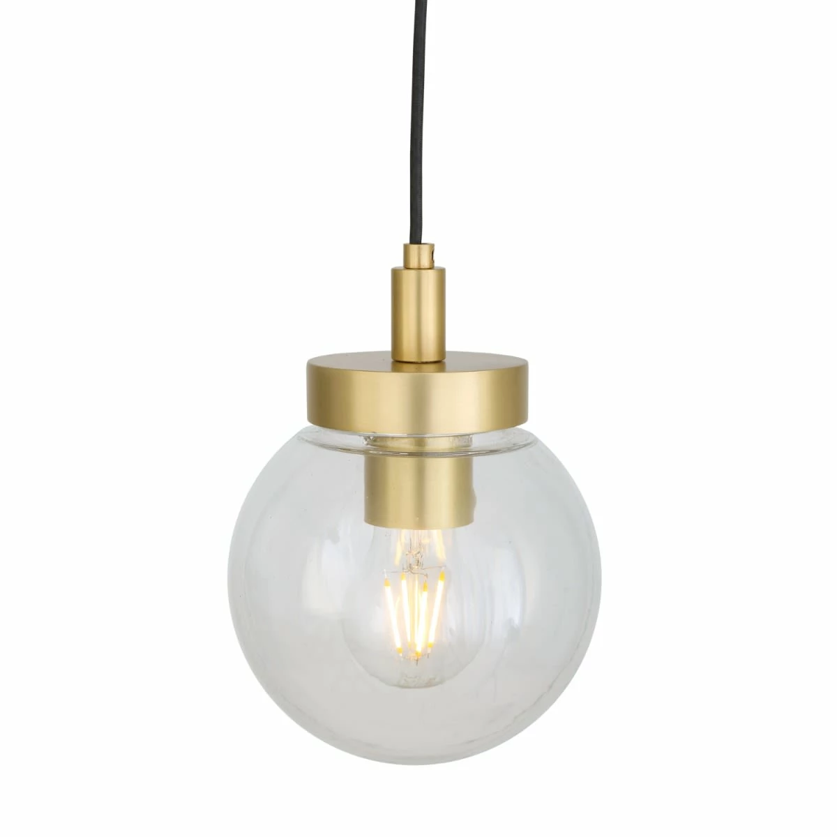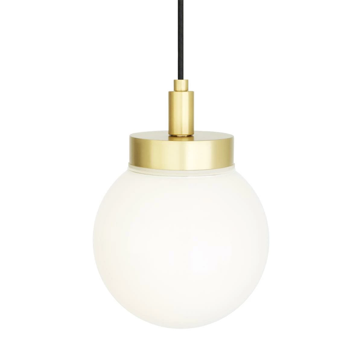 The Jordan pendant is a simple and modern bathroom pendant. It has a distinctive glass globe shade attached to a sealed brass gallery and matching cord grip.