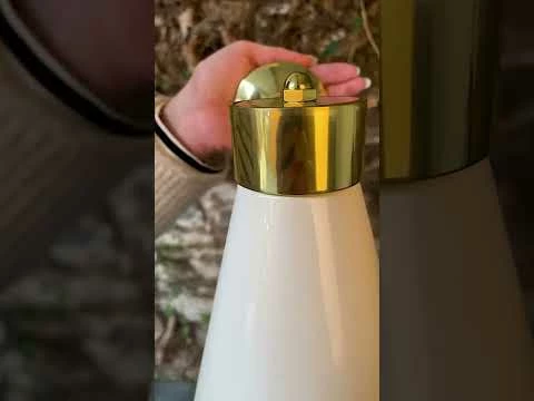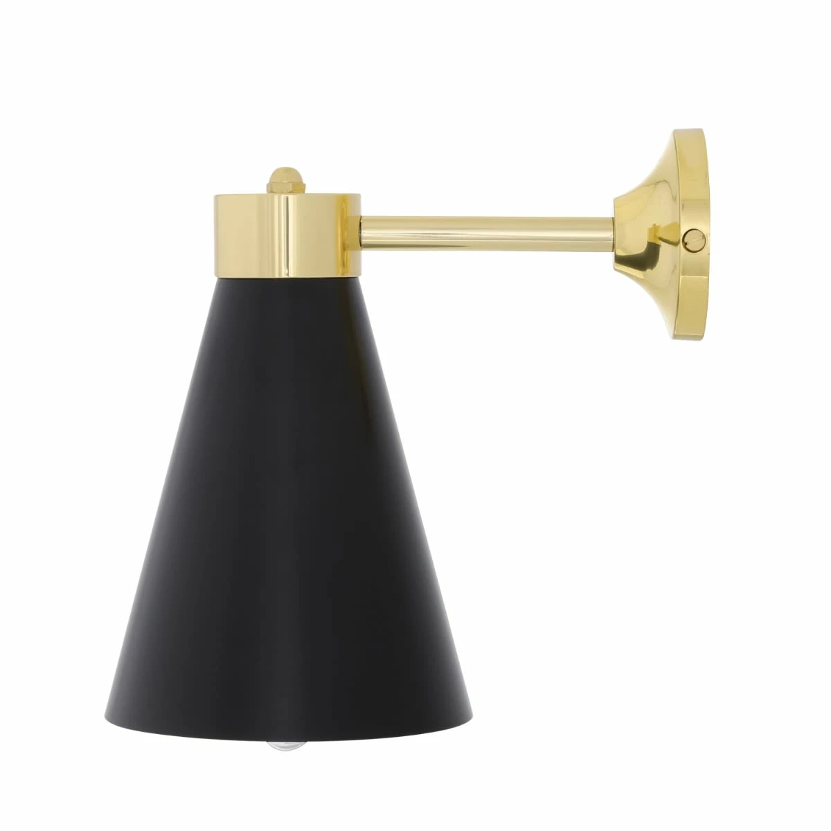 The Kamina wall light is a modern wall light that features a brass cone lamp shade facing downwards towards the floor. The brass shade is powder-coated matte black or white on the outside and polished brass on the inside.