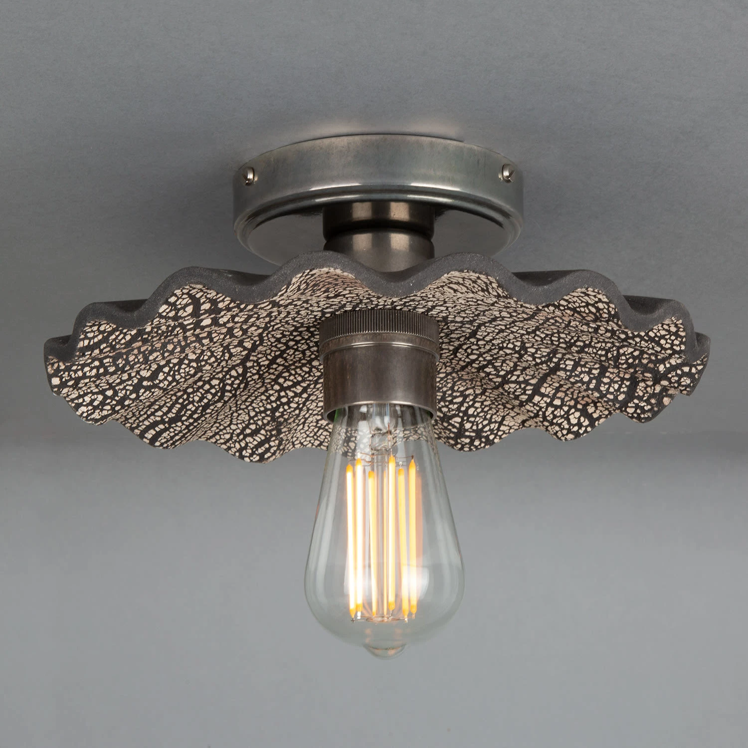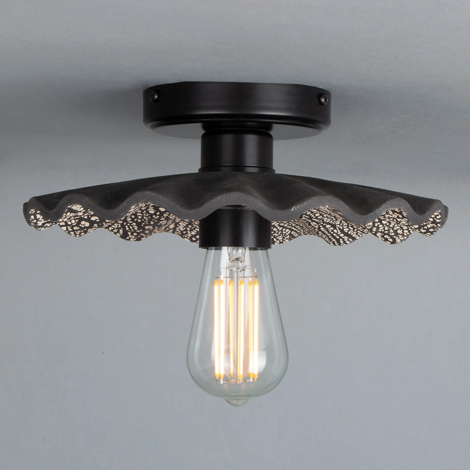 This entirely handmade piece features a smooth black clay finish on the top part of the shade and a crackle effect running through the underside.
