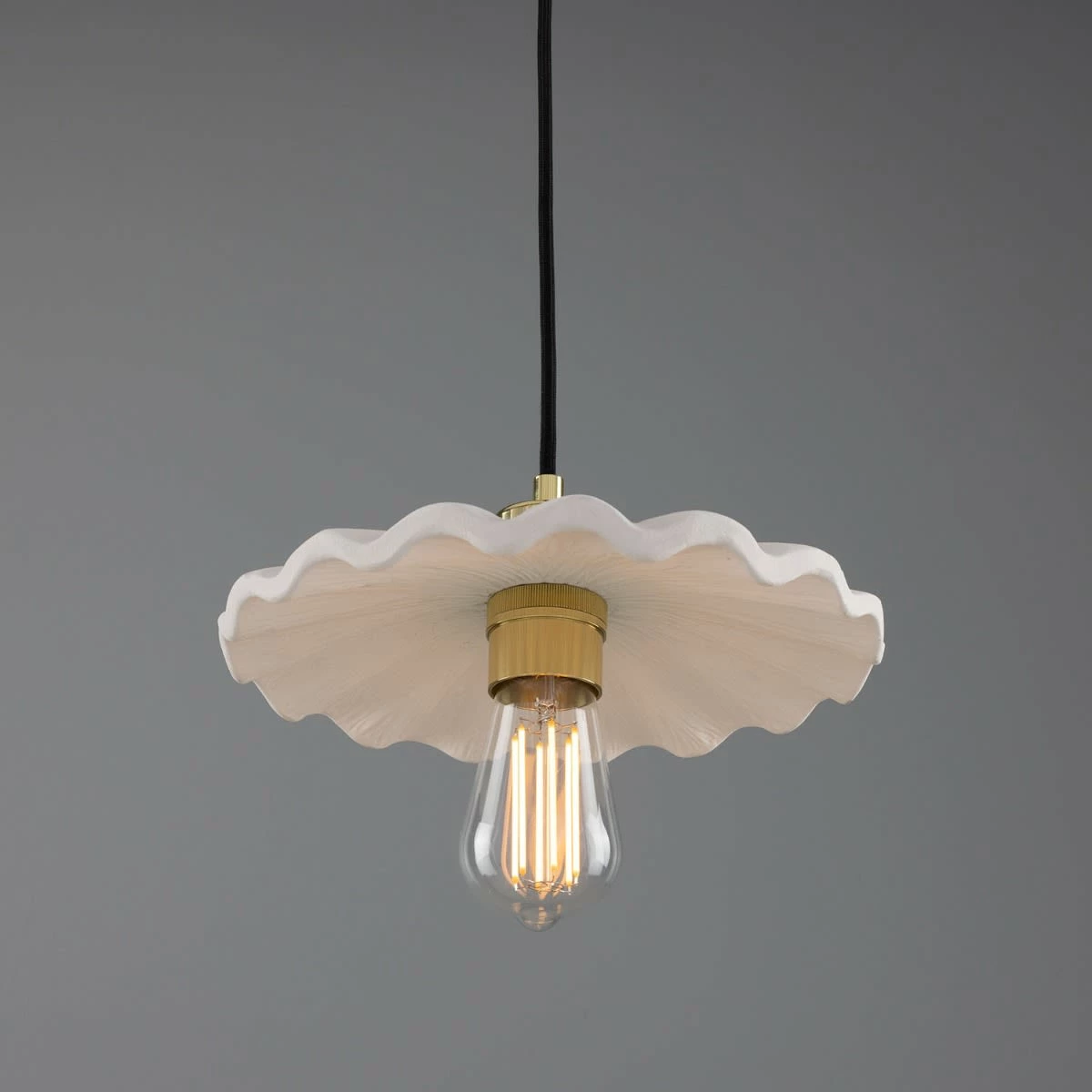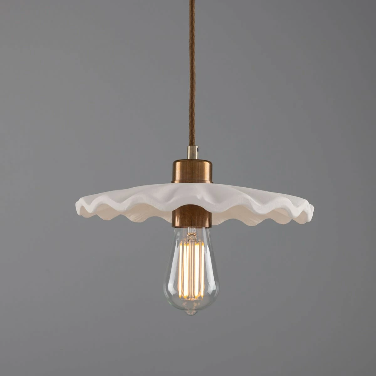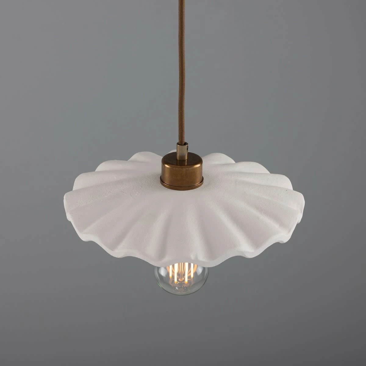 Suspended from a brass ceiling rose, the Kapok pendant meets its ceramic shade with a brass lamp holder and cord grip. To complement an array of interior design styles, five distinctive metal colour finishes are available: antique brass, antique silver, polished brass, satin brass and powder-coated matte black.