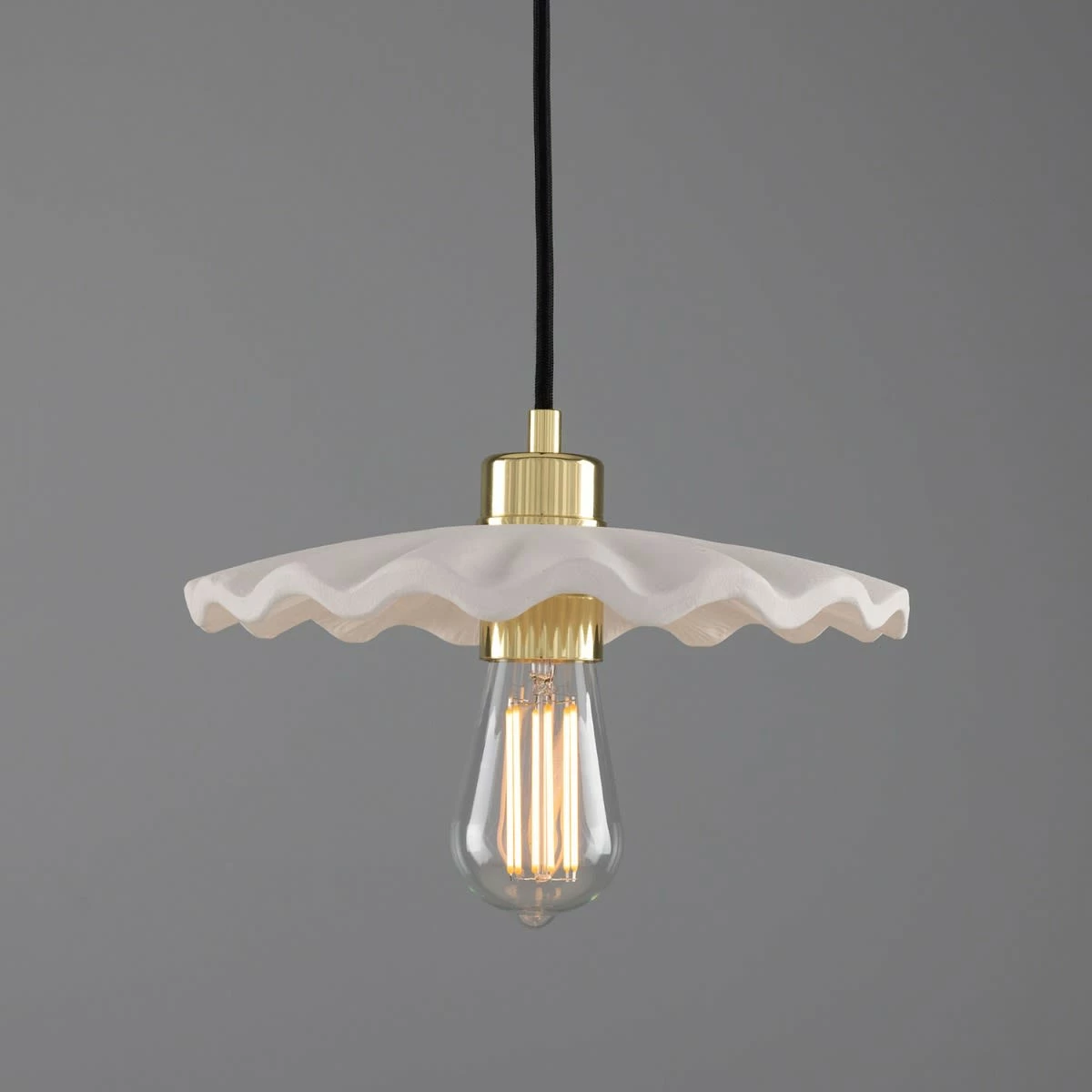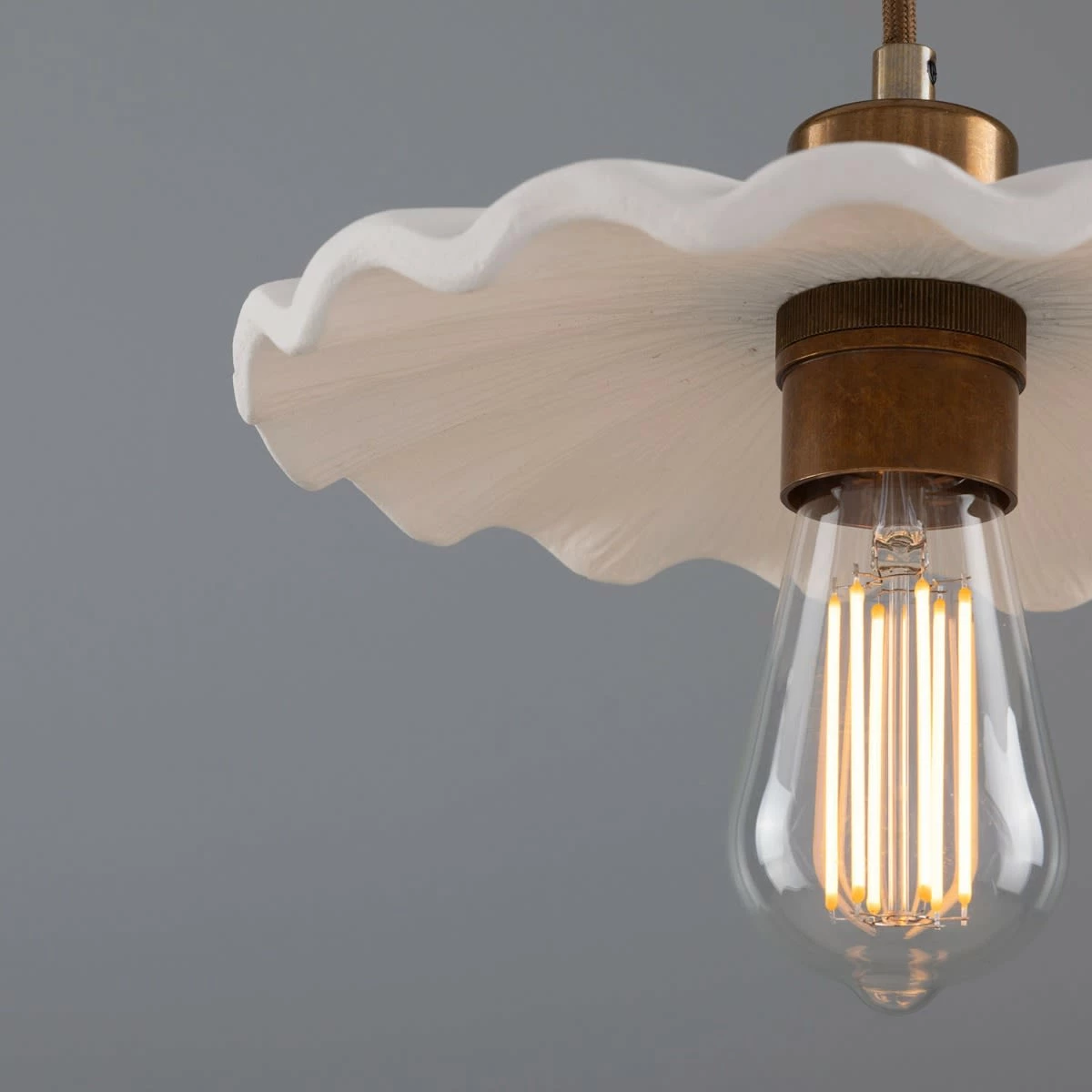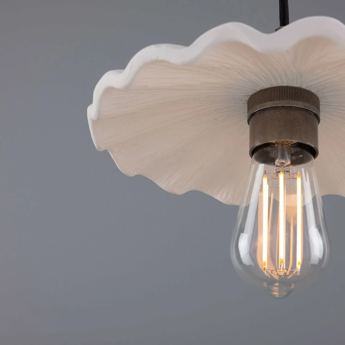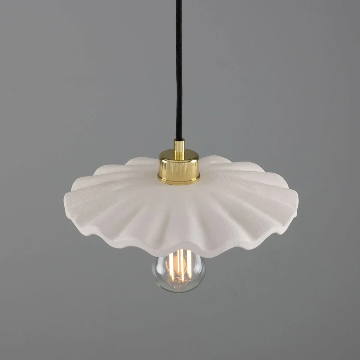 Suspended from a brass ceiling rose, the Kapok pendant meets its ceramic shade with a brass lamp holder and cord grip. To complement an array of interior design styles, five distinctive metal colour finishes are available: antique brass, antique silver, polished brass, satin brass and powder-coated matte black.