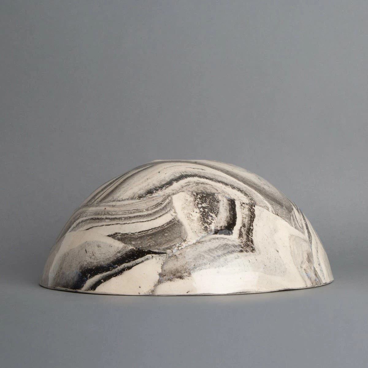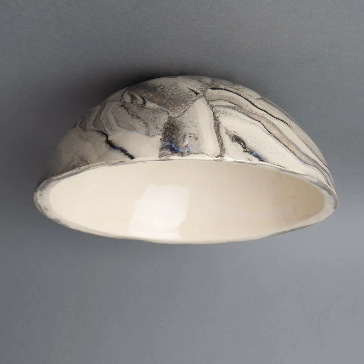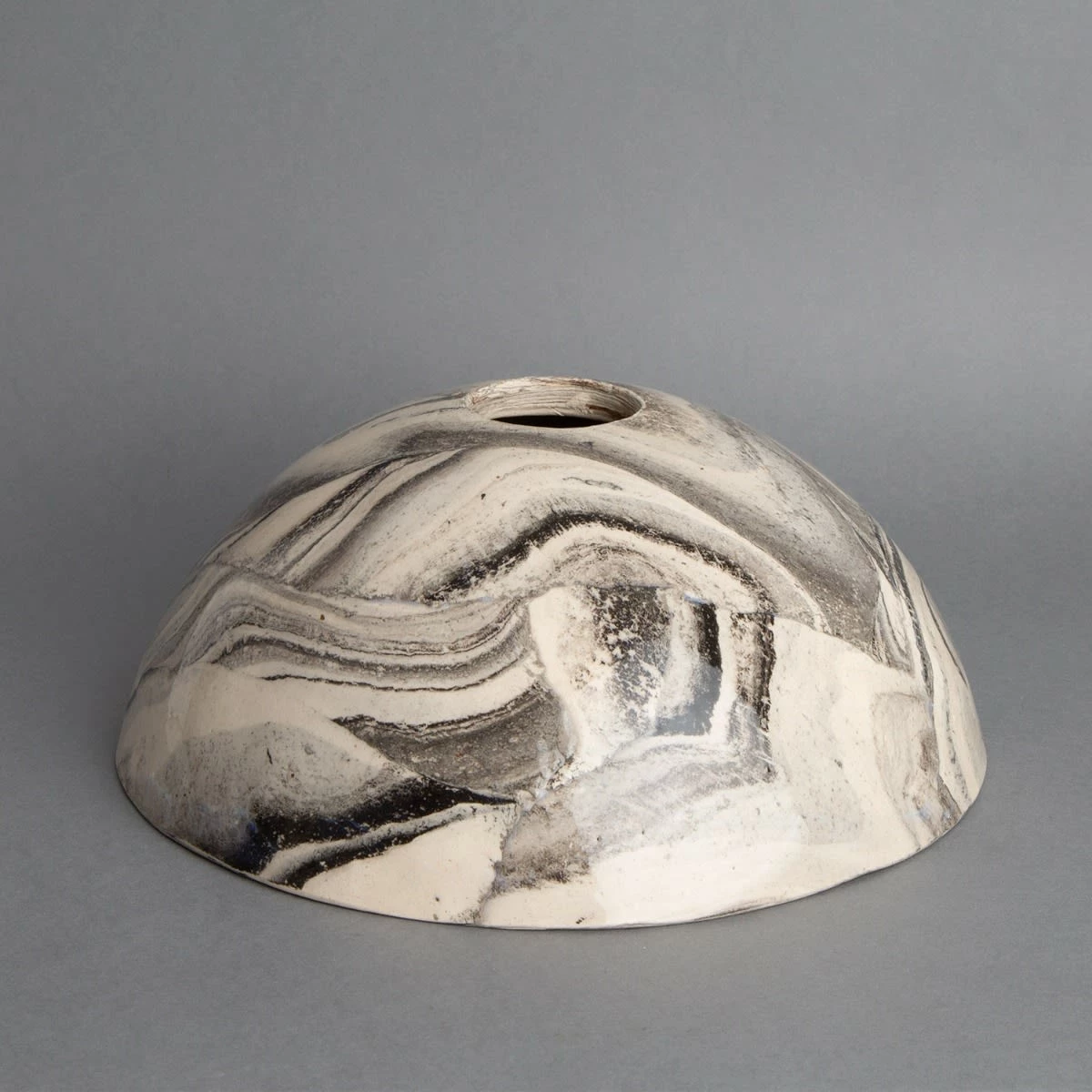 This ceramic dome lamp shade has a diameter of 20cm, is 8.5cm tall and features a white and black marble effect on its surface. It’s handmade in our ceramic studio in Mullan Village.