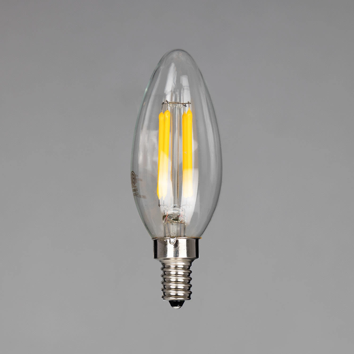 With an E12 base, this LED filament candle bulb is often used in suitable chandeliers and elegant wall sconces. It has a total height of 3.7″ and diameter of 1.4″.