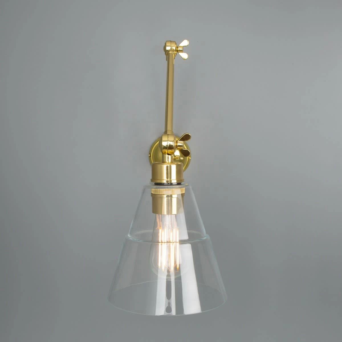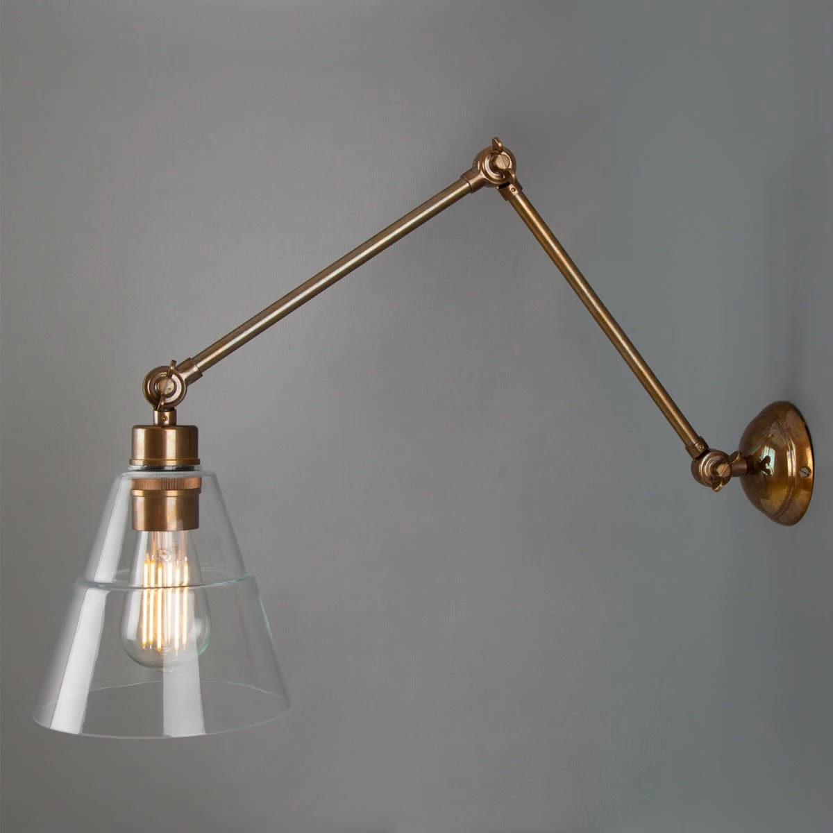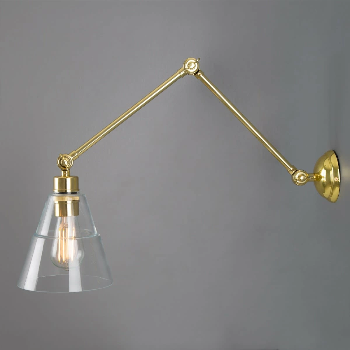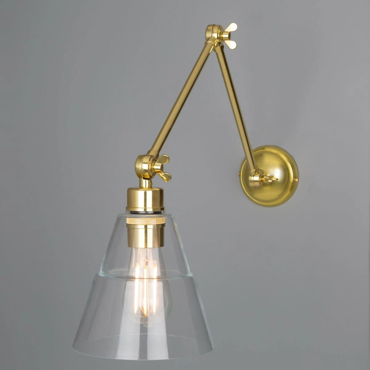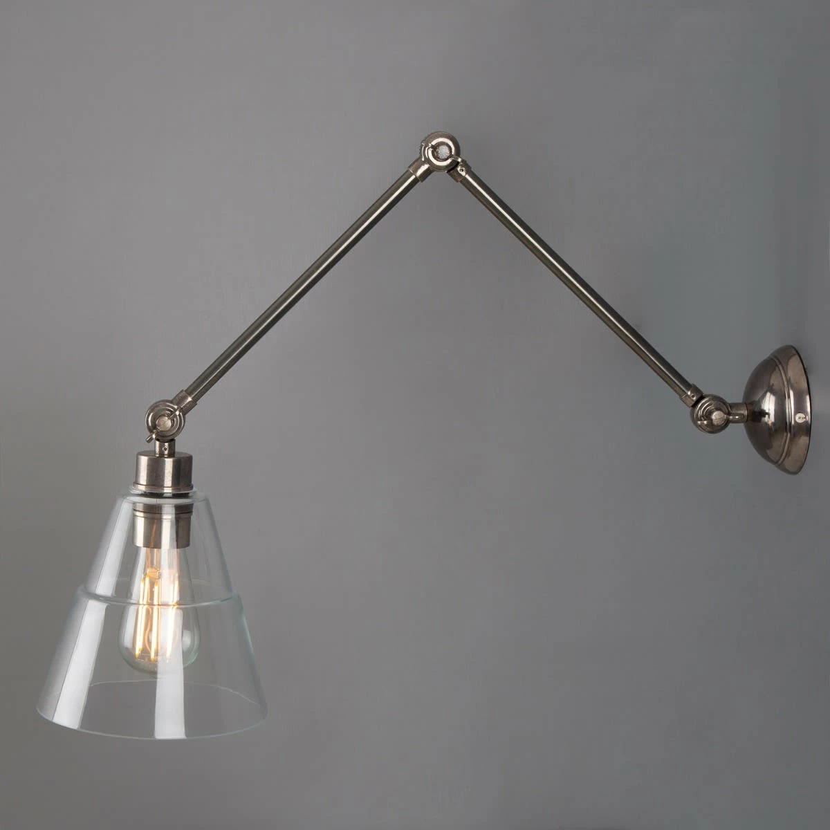 With an eye-catching design, the Lyx Adjustable Poster Light will enhance your home with a perfect mix of form and function. This reading wall light looks great beside the bed, over the bookshelf in the library or in a banquette nook. With an industrial glass shade and three pivot joints, this adjustable arm wall lamp has technical appeal. They all move in an up and down direction to direct the light where you need. The clear glass allows you to see the warm glow of the lamp inside. Perfect for use with a decorative bulb. Bulbs are sold separately.
