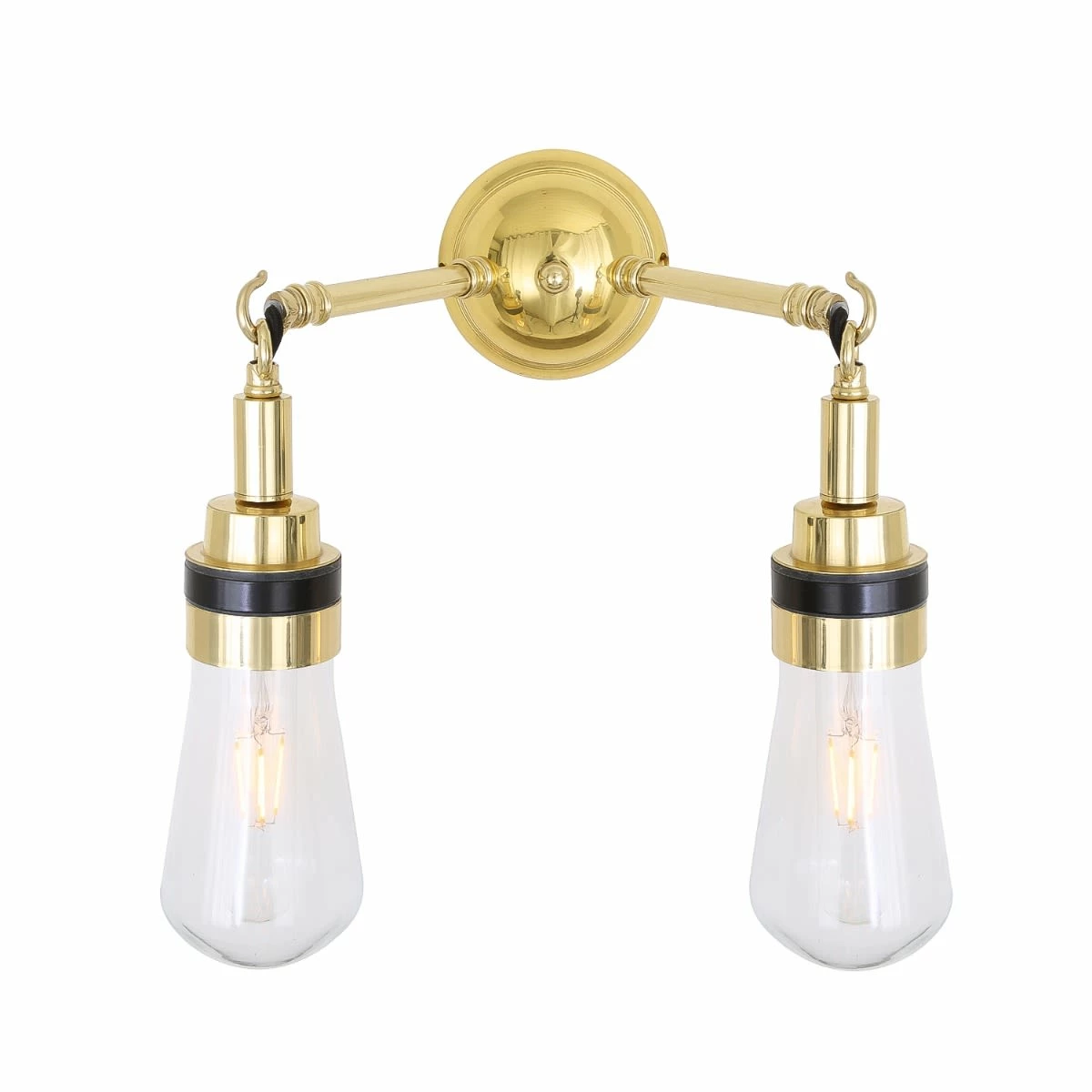 The Meri is an industrial-style double wall light that is suitable for installation in bathrooms and most outdoor areas. It features a single dome wall bracket from which two arms protrude, suspending two IP65 watertight lamps below.