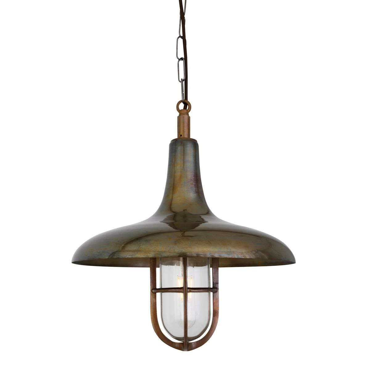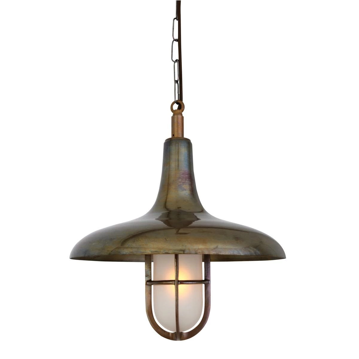 The Mira is a nautical pendant light that is rated IP65 and can be installed in most bathroom and outdoor locations. It features an industrial-style brass metal shade. Under this metal shade is a well glass lamp shade securely housed in a nautical-style brass enclosure.