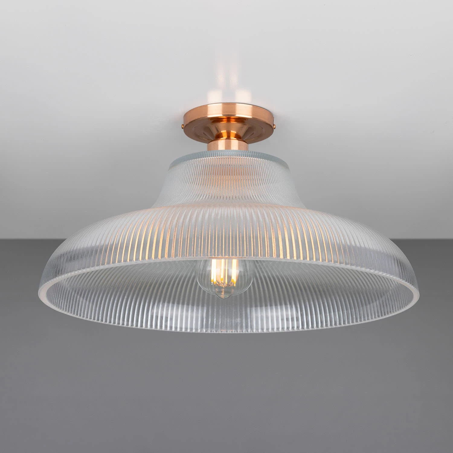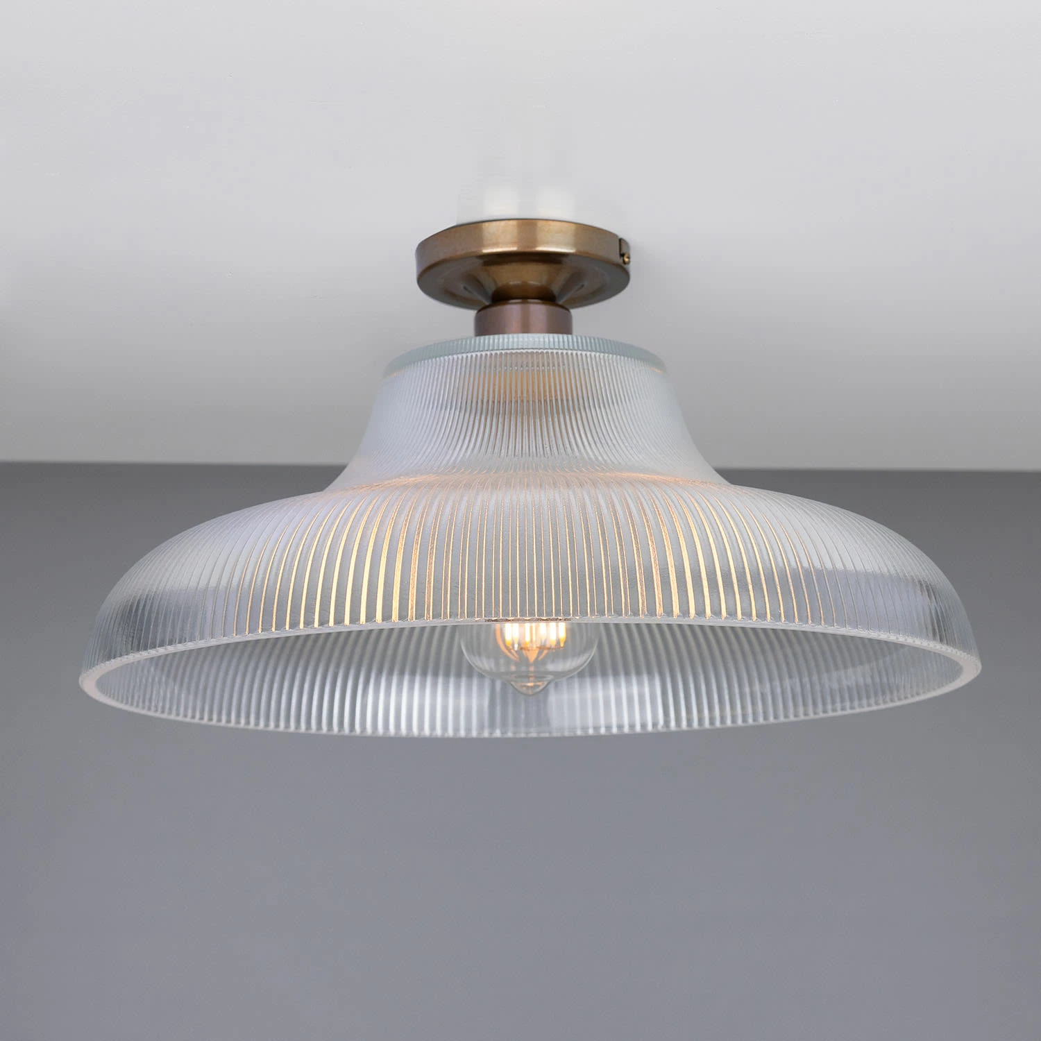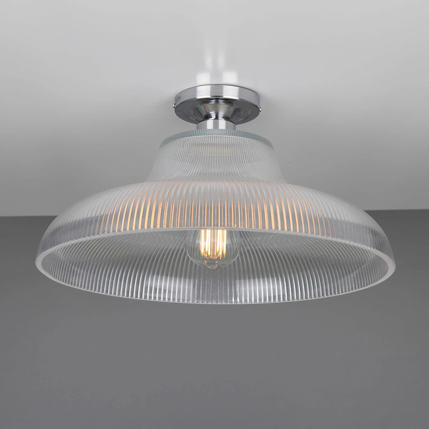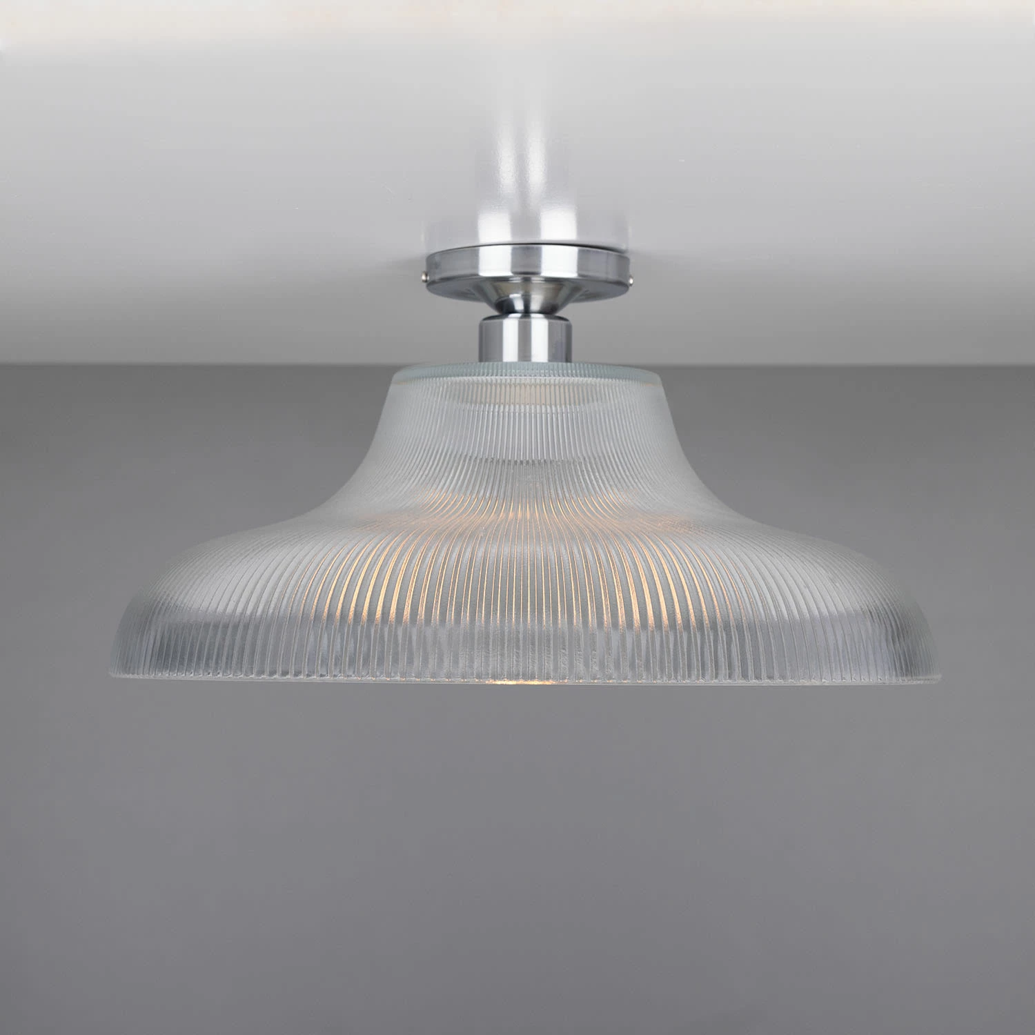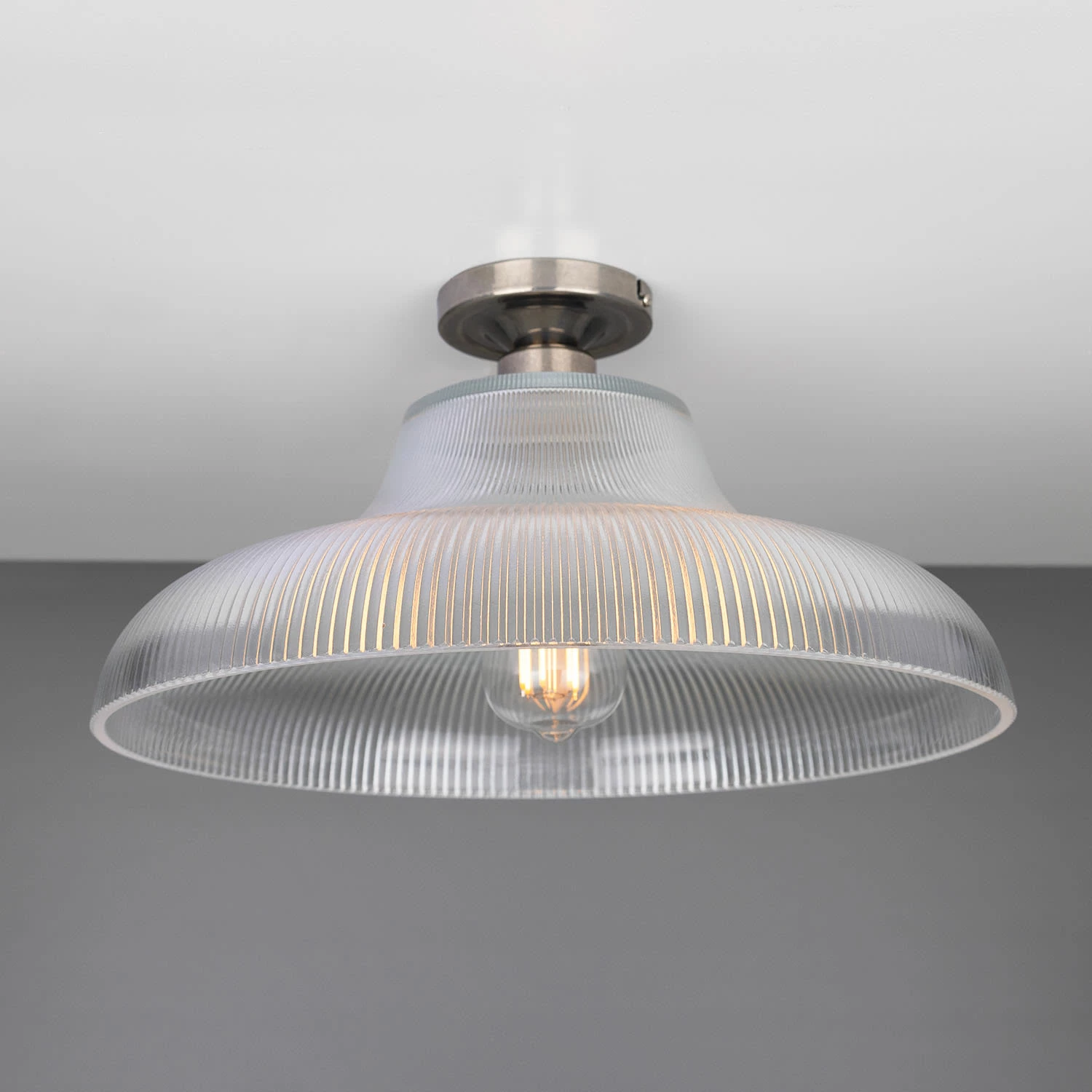 Perfect for homes with contemporary decors, the Mono Industrial 40cm Railway Flush Fitting will enhance your room with diffused light. This semi flush ceiling light will add soft illumination to your entryway, dining room or any other area of your home. Designed to refract the light, this ceiling light fixture features an elegant Holophane glass shade that emanates light outward over your entire space as if it has multiple light sources. Suitable for modern and contemporary interiors, this contemporary semi flush ceiling light looks great when lit with a warm bulb for a soft lighting. Bulbs are sold separately.