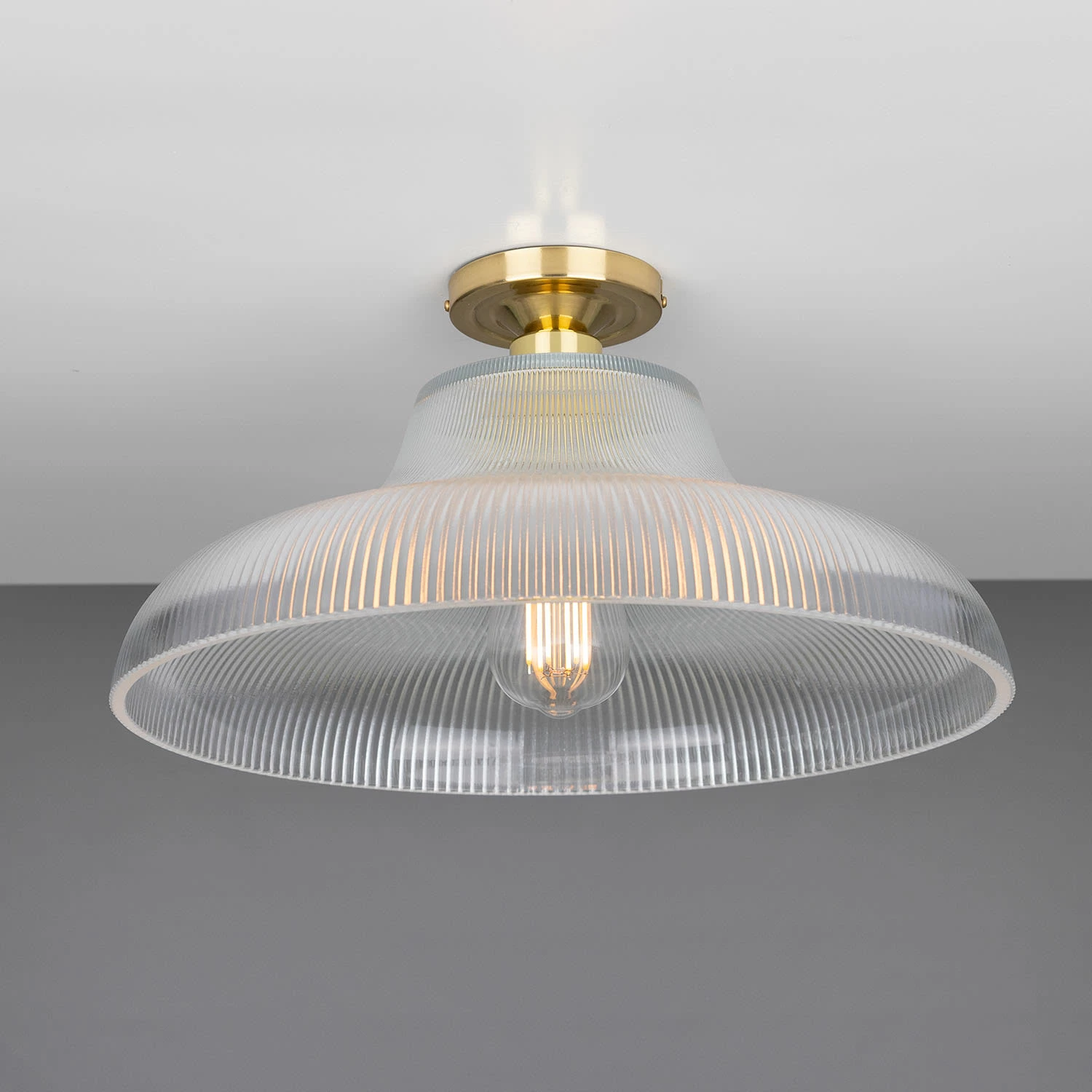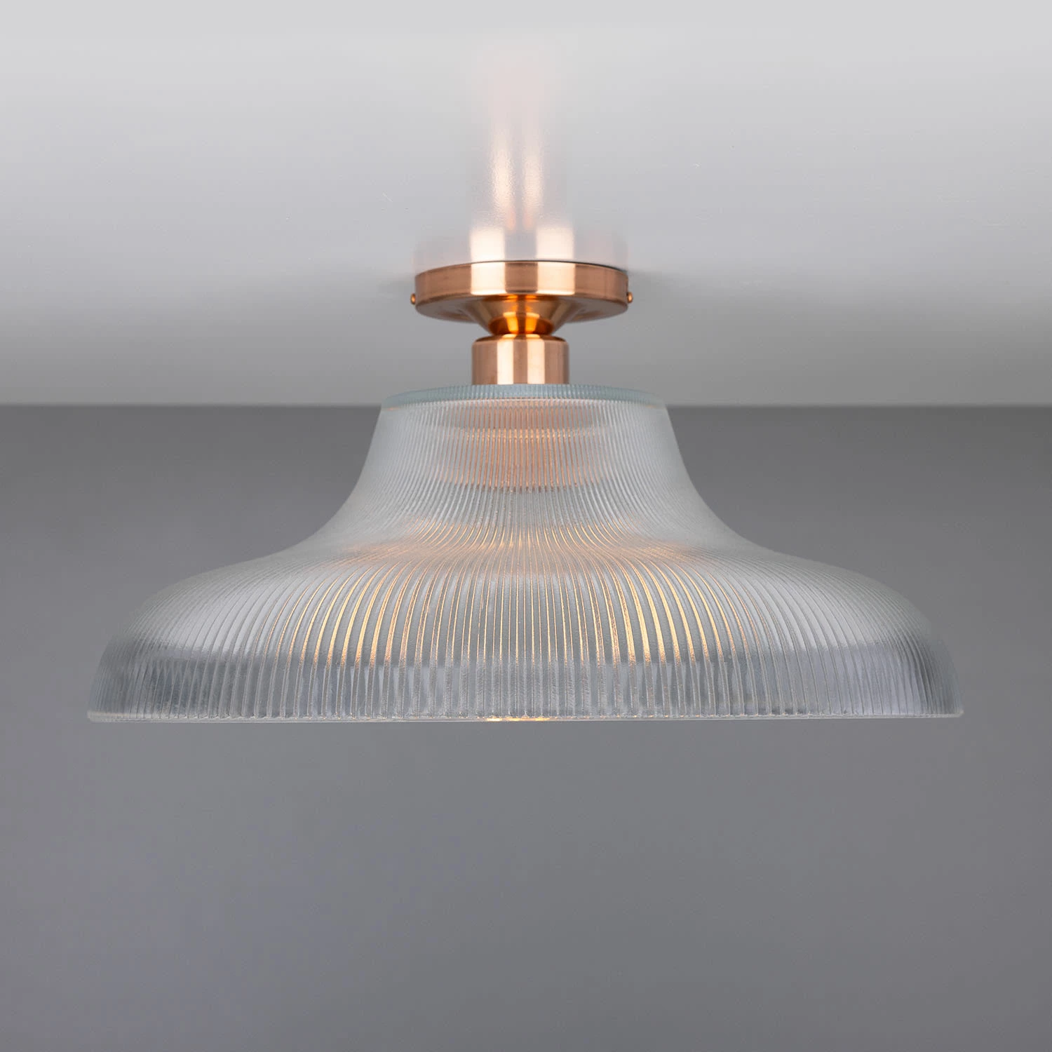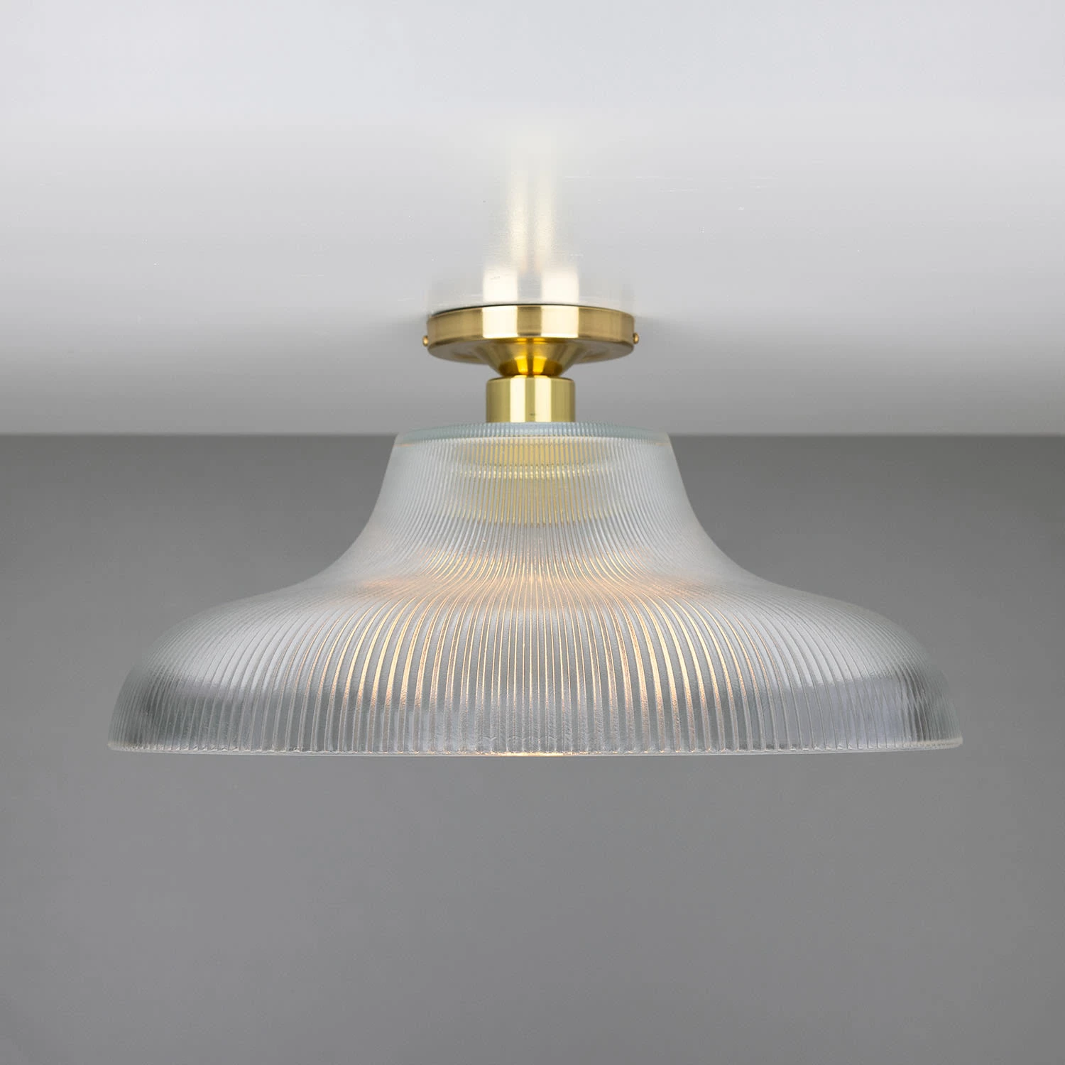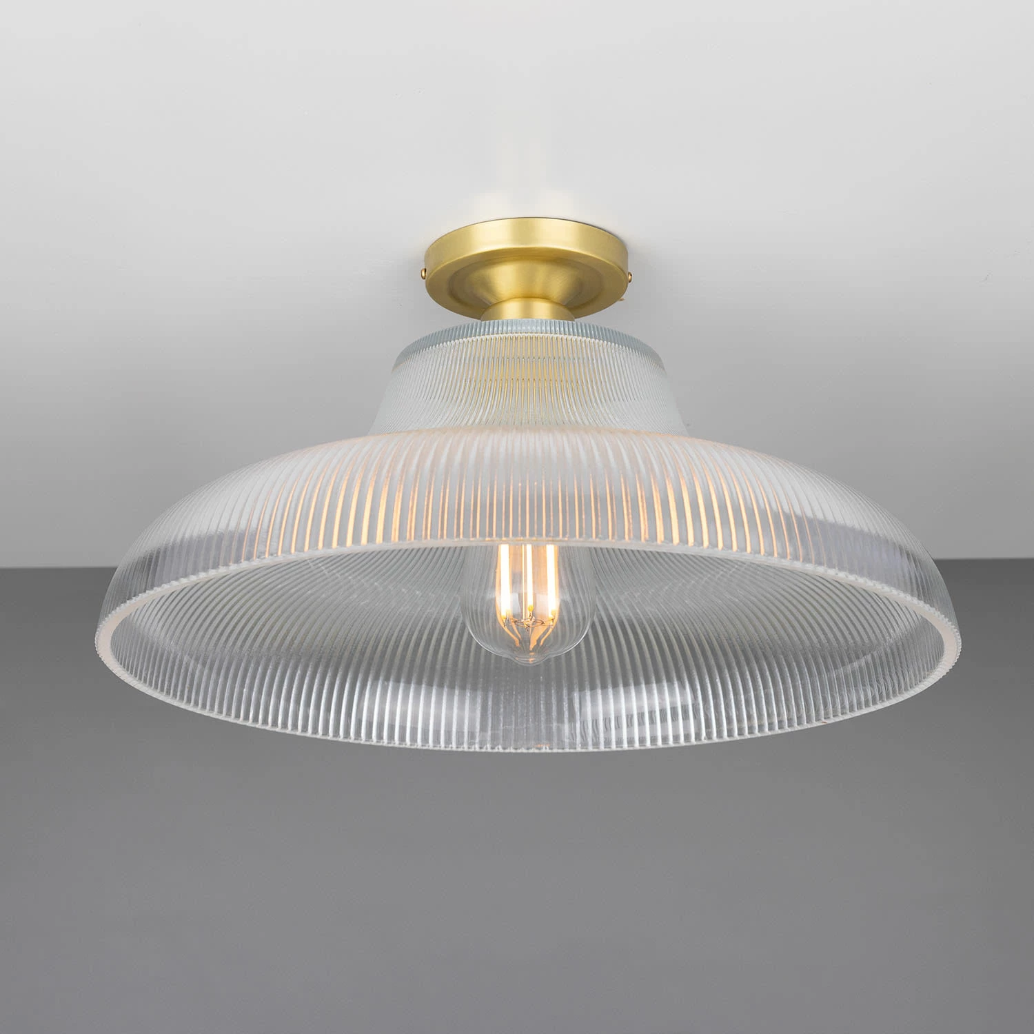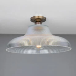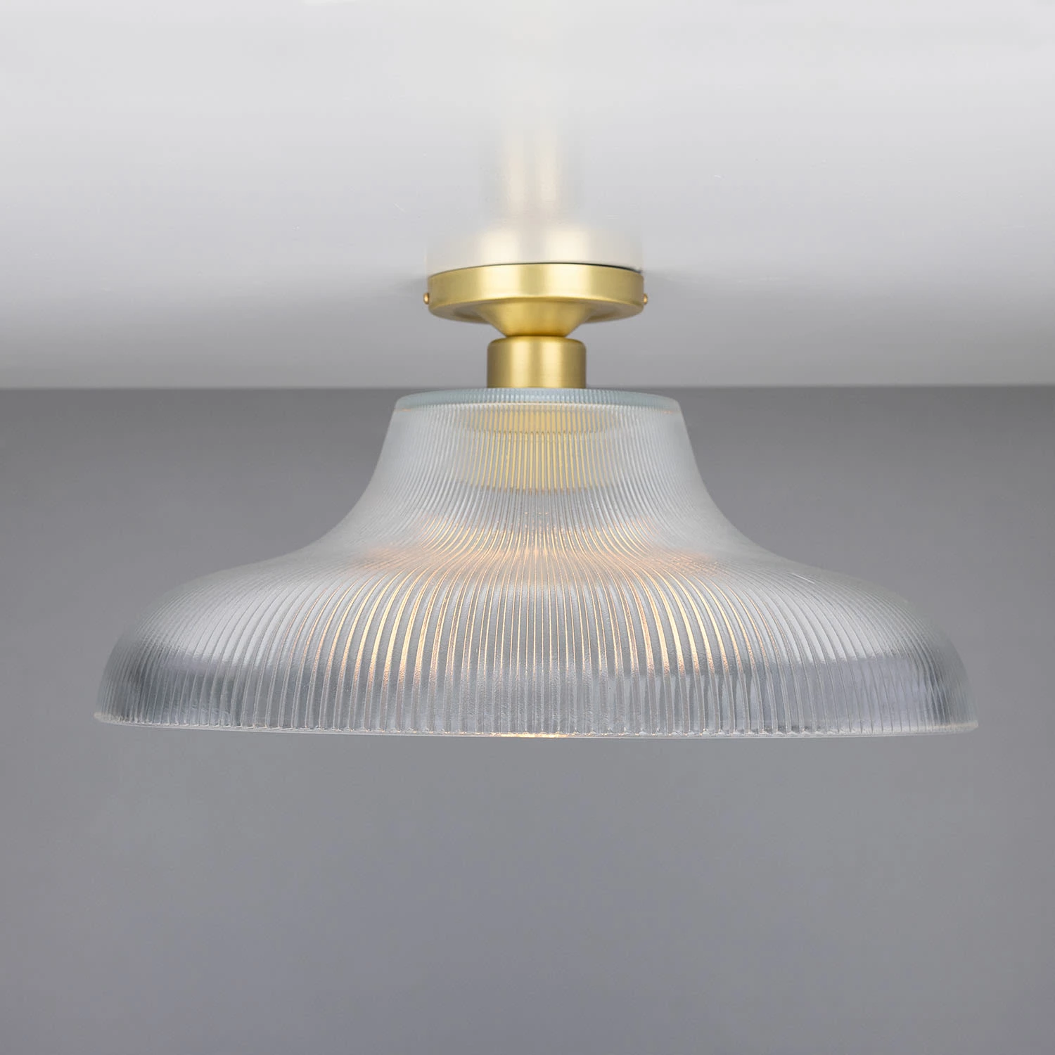 Perfect for homes with contemporary decors, the Mono Industrial 40cm Railway Flush Fitting will enhance your room with diffused light. This semi flush ceiling light will add soft illumination to your entryway, dining room or any other area of your home. Designed to refract the light, this ceiling light fixture features an elegant Holophane glass shade that emanates light outward over your entire space as if it has multiple light sources. Suitable for modern and contemporary interiors, this contemporary semi flush ceiling light looks great when lit with a warm bulb for a soft lighting. Bulbs are sold separately.