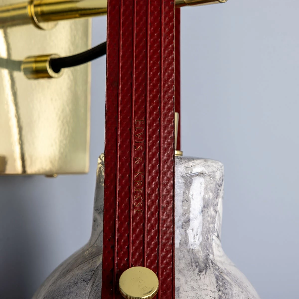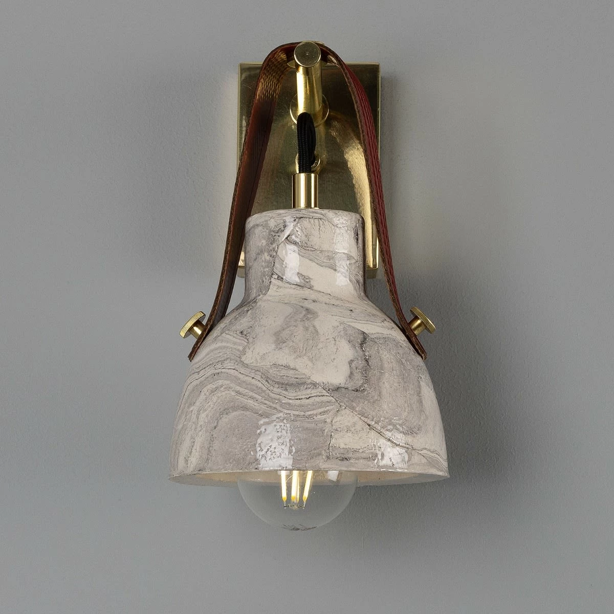 The rescued fire-hose strap of the Nagi wall light brings a unique element to the fixture with a contrasting red or yellow that complements the marbled texture.