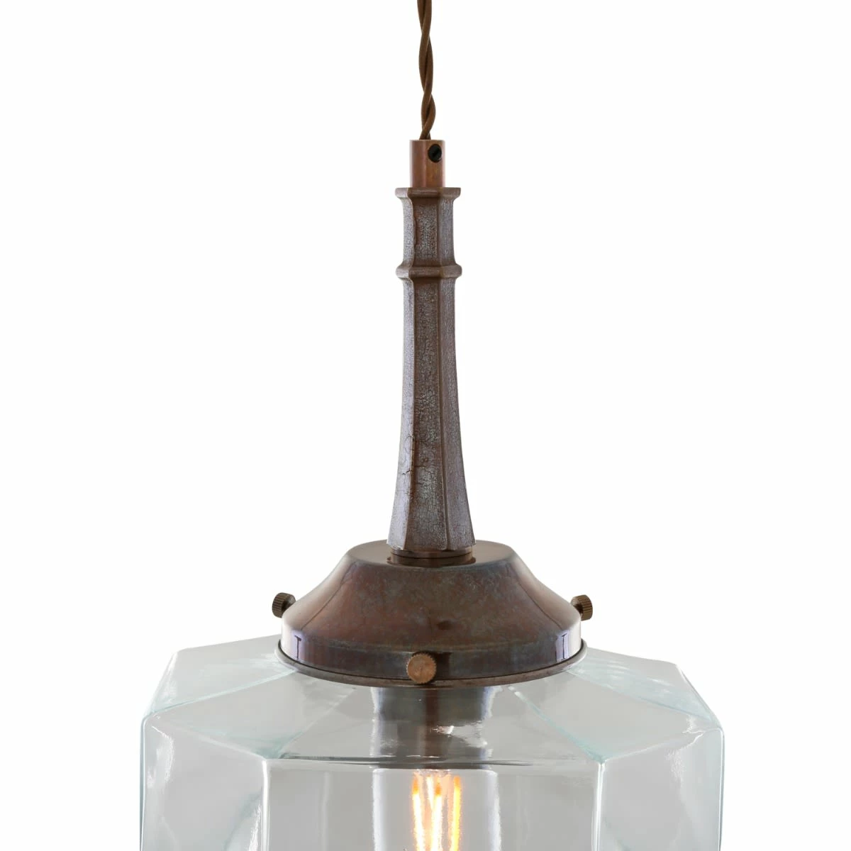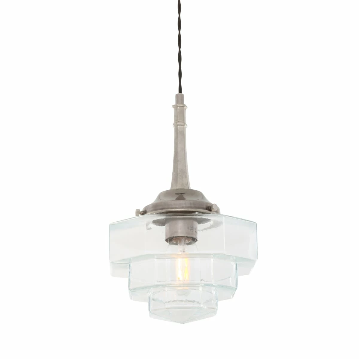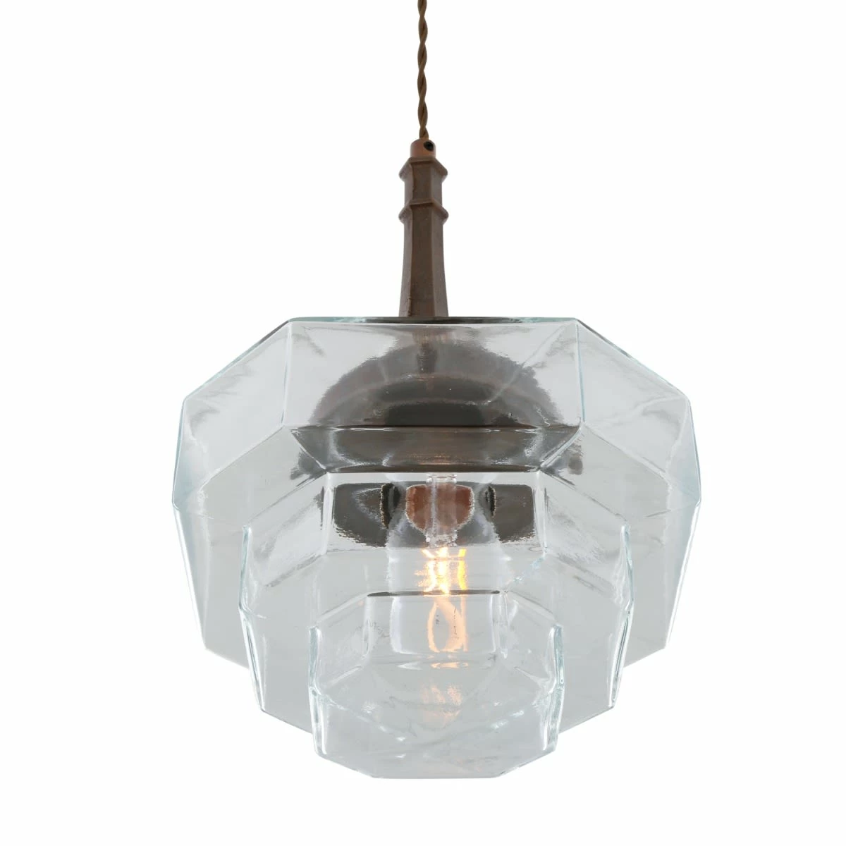 Inside the hexagonal glass shade is an E27 lamp holder. We recommend using one of our decorative LED tube bulbs in this modern, Art Deco pendant (bulb sold separately).