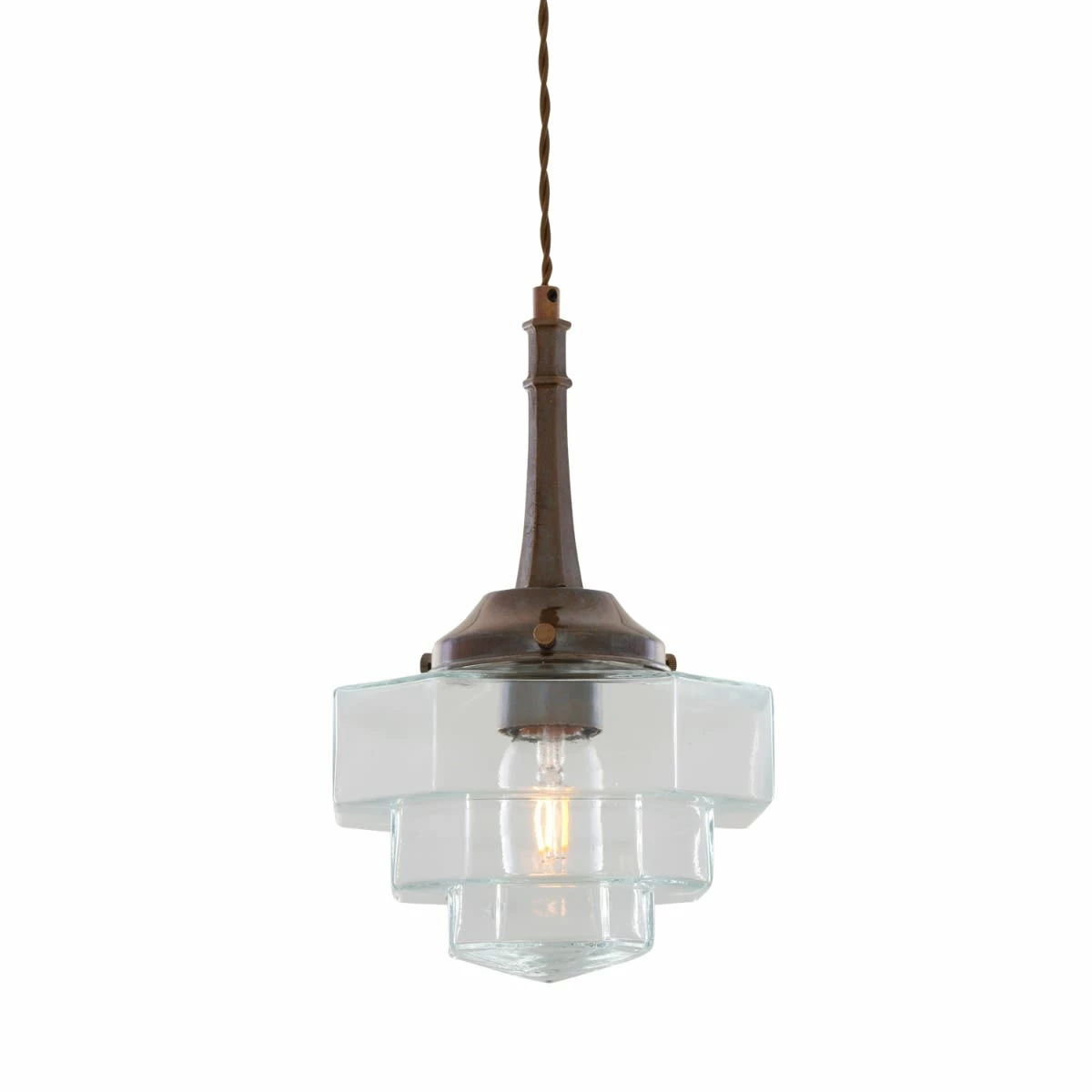 The Novato pendant is a simple suspension that features a slender brass body, brass gallery and hexagonal stepped glass lamp shade. The brass gallery holds the Novato pendant’s distinctive stepped glass shade that gives this light fixture an Art Deco feel.