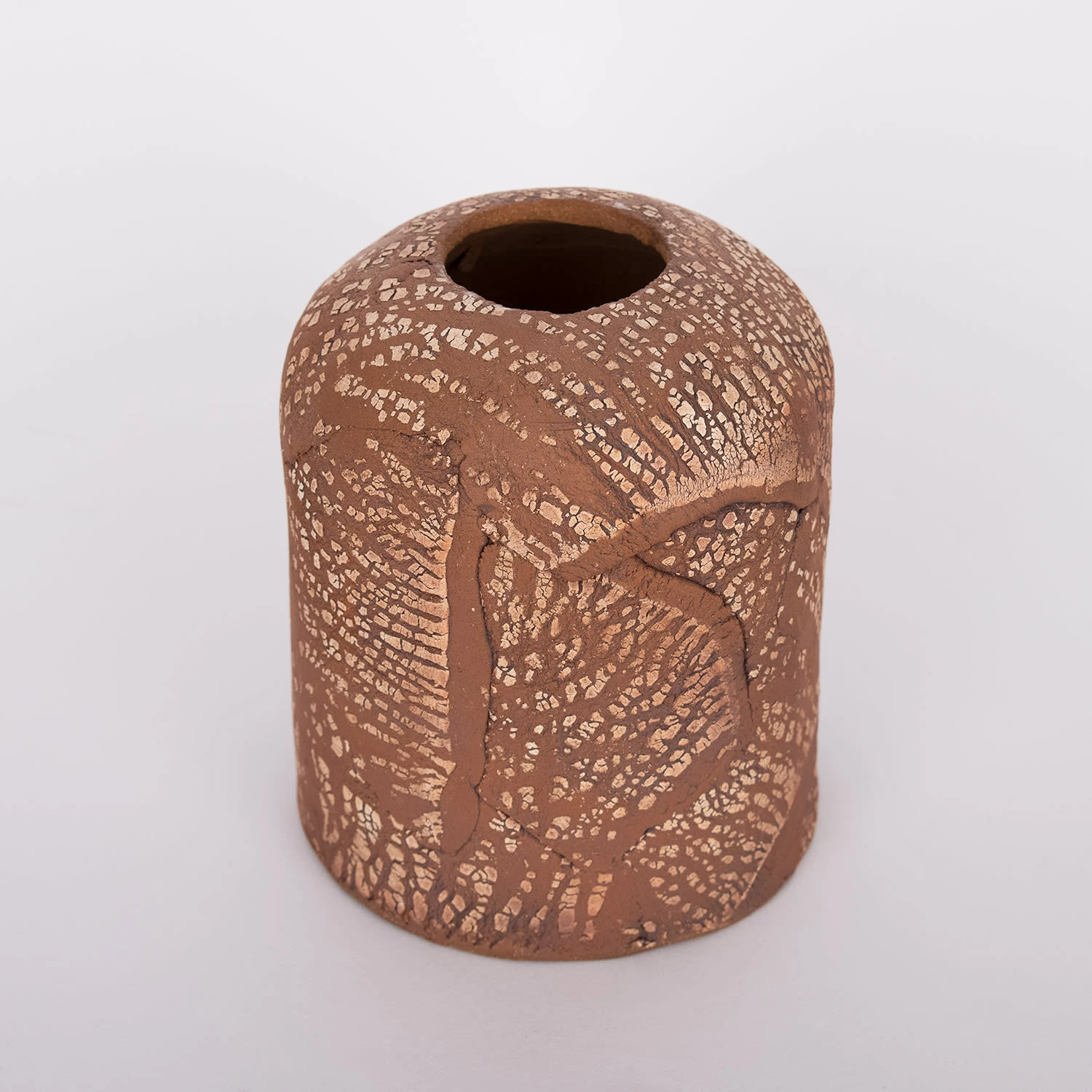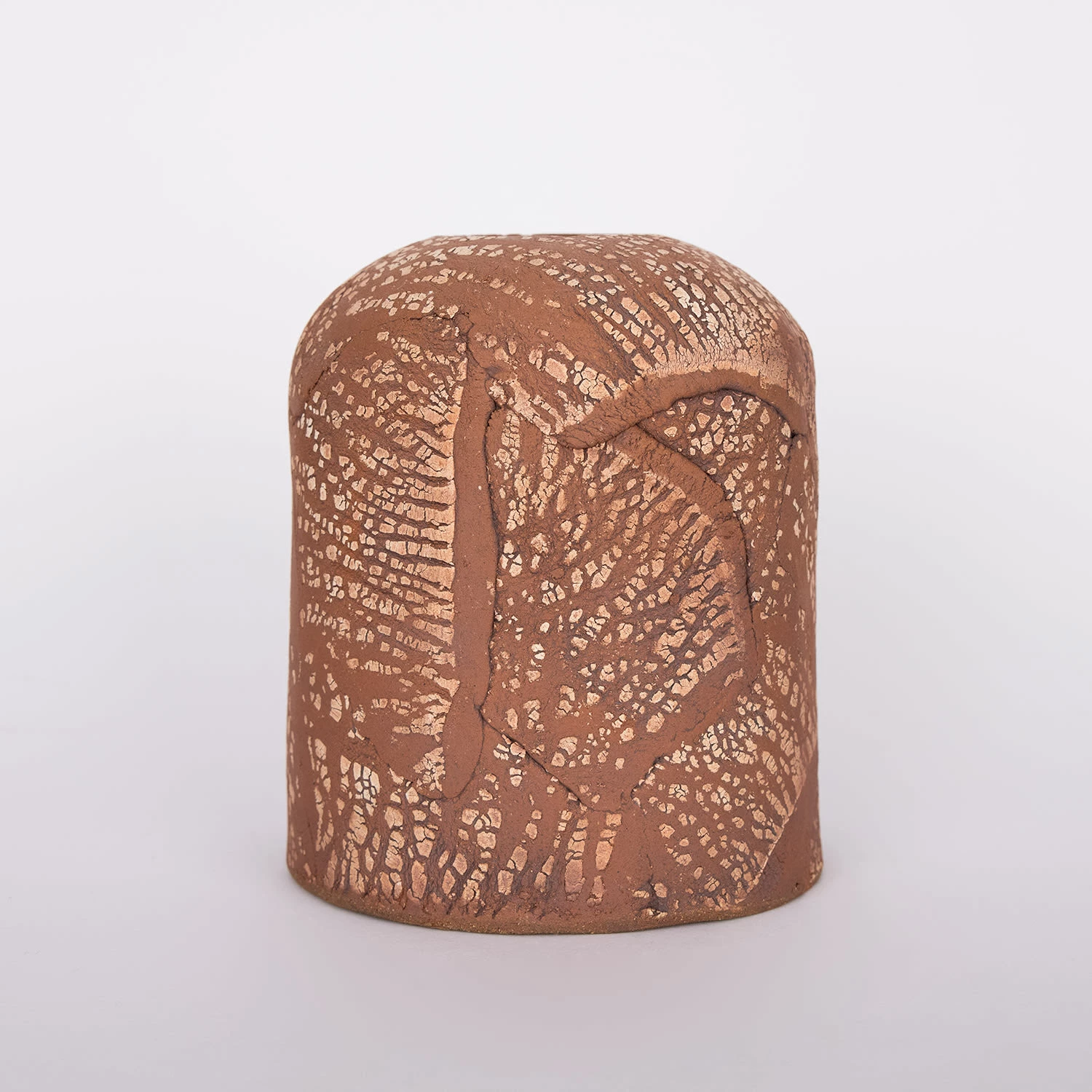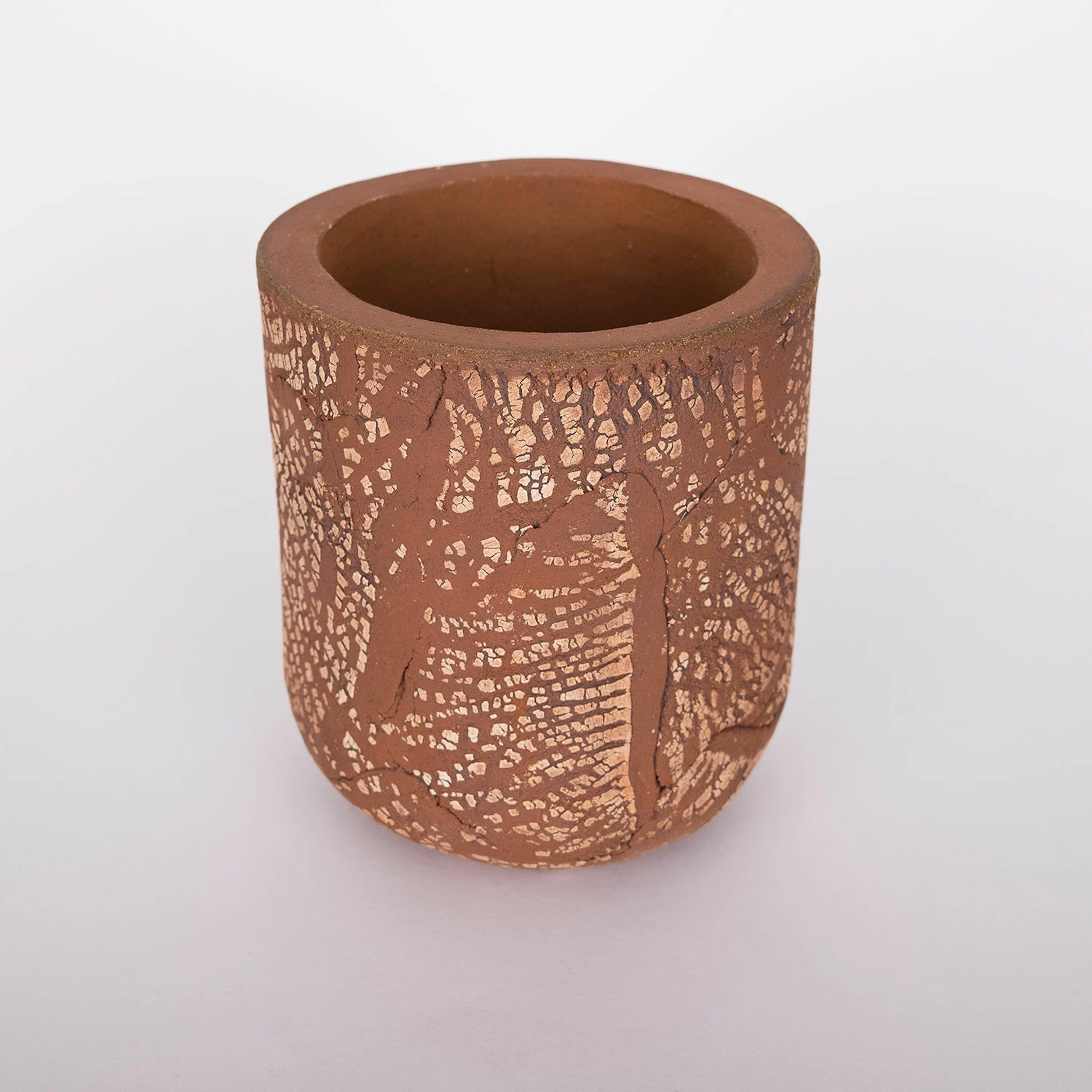 This ceramic cylinder lamp shade has a diameter of 11.5cm, is 14cm tall and features a distinctive crackled Red Iron pattern on its surface. It’s handmade in our ceramic studio in Mullan Village.
