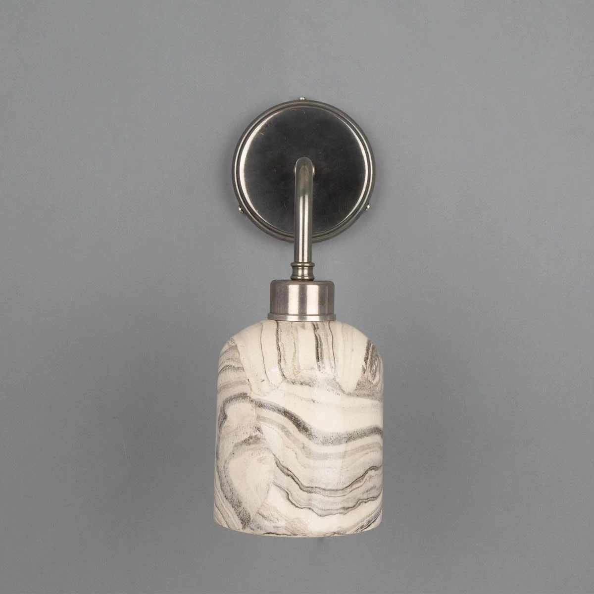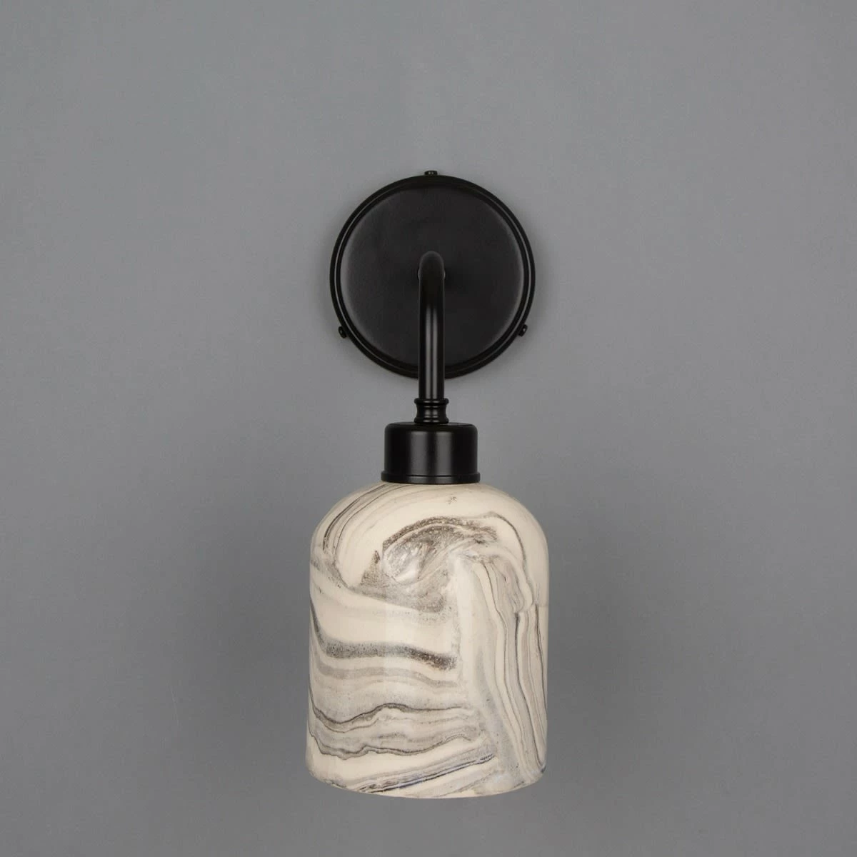 The multi-toned marble effect that runs across the smooth glazed ceramic shade brings an edgy industrial sense to this charming wall lamp.