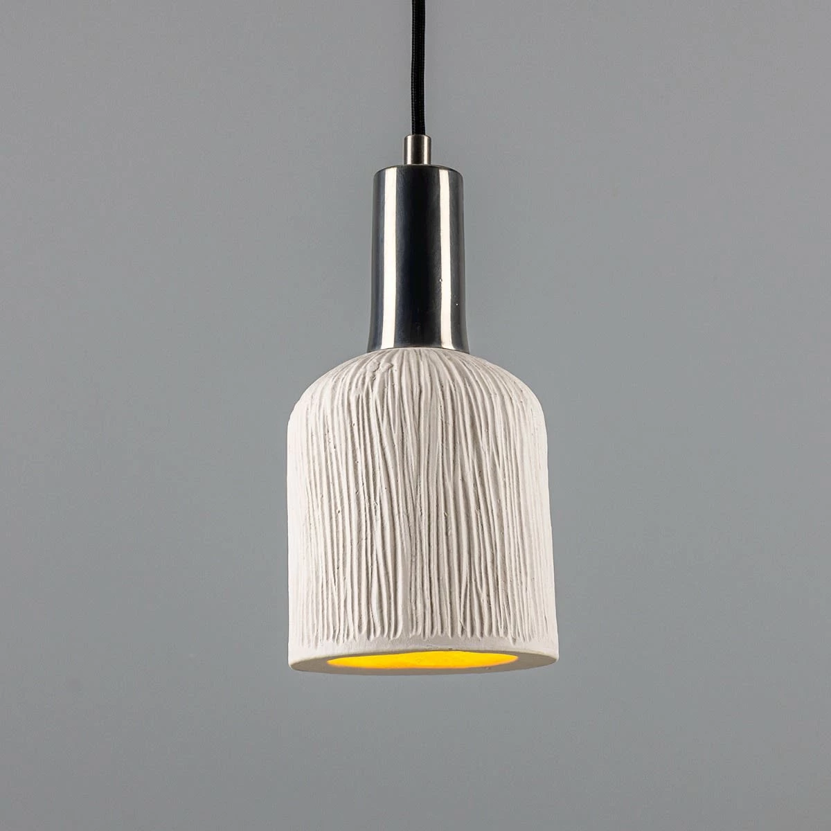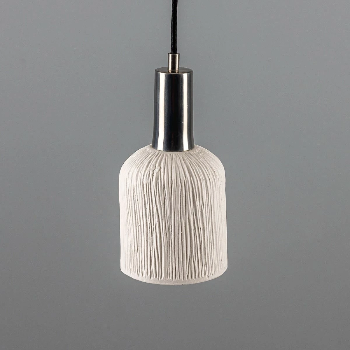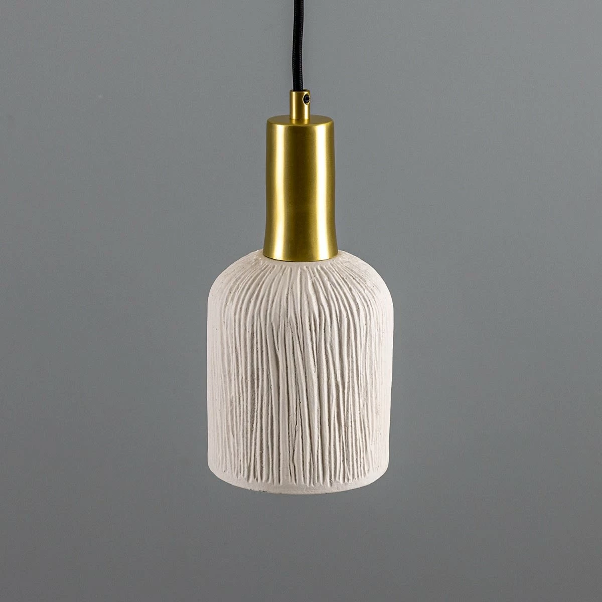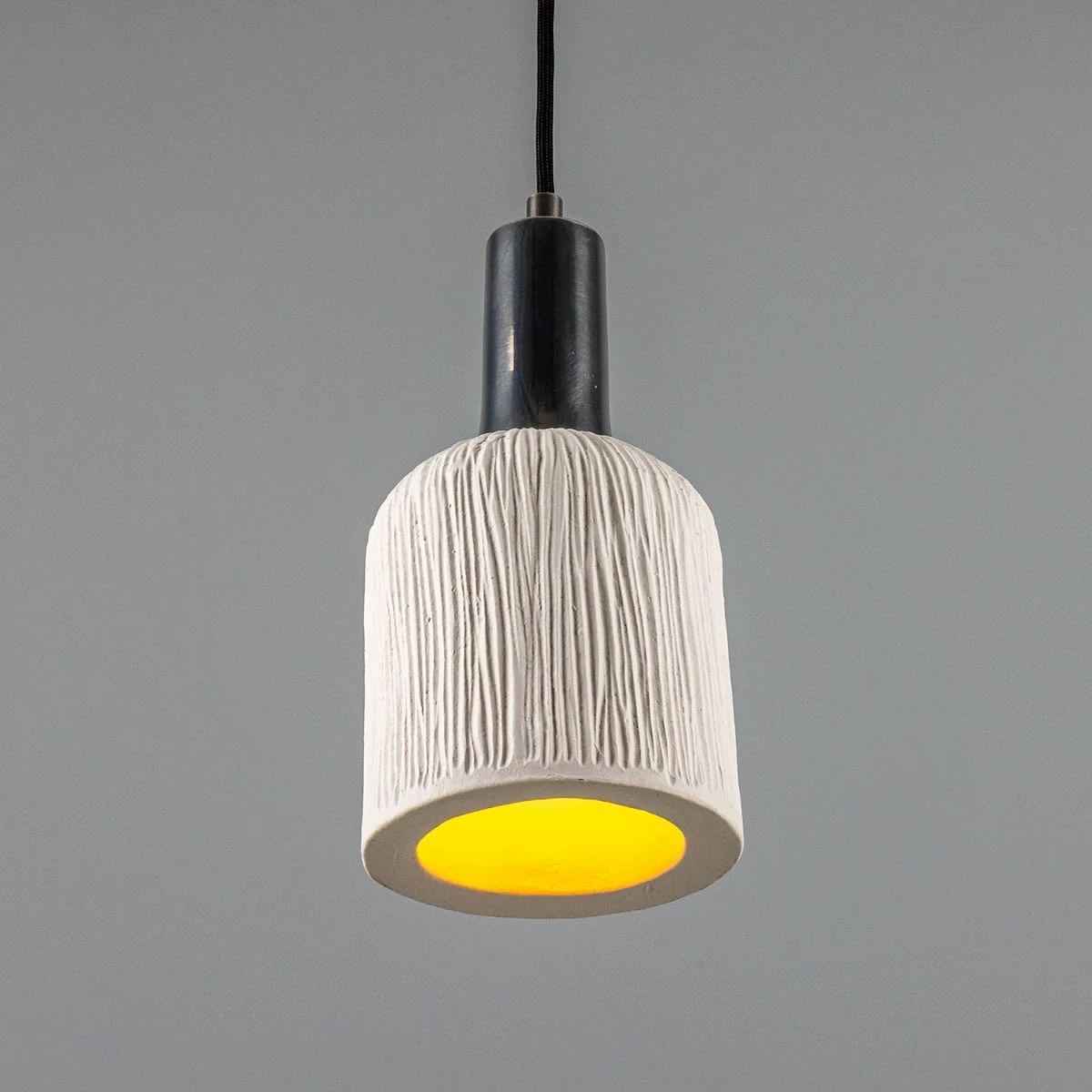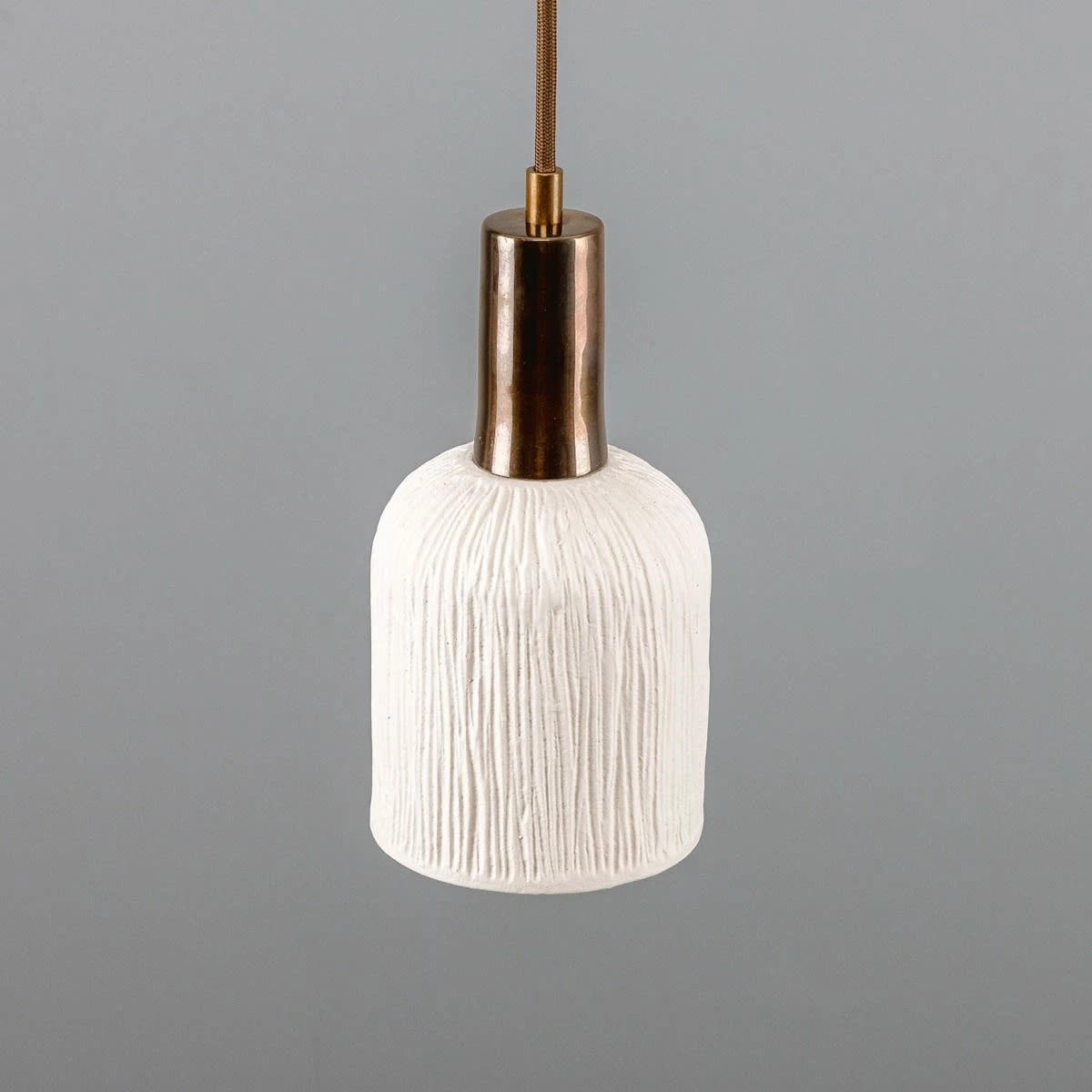 The matte white striped finish elevates this simple design, adding interest with its hand-carved texture. The handcrafted nature of this ceramic pendant makes each light fixture unique.
