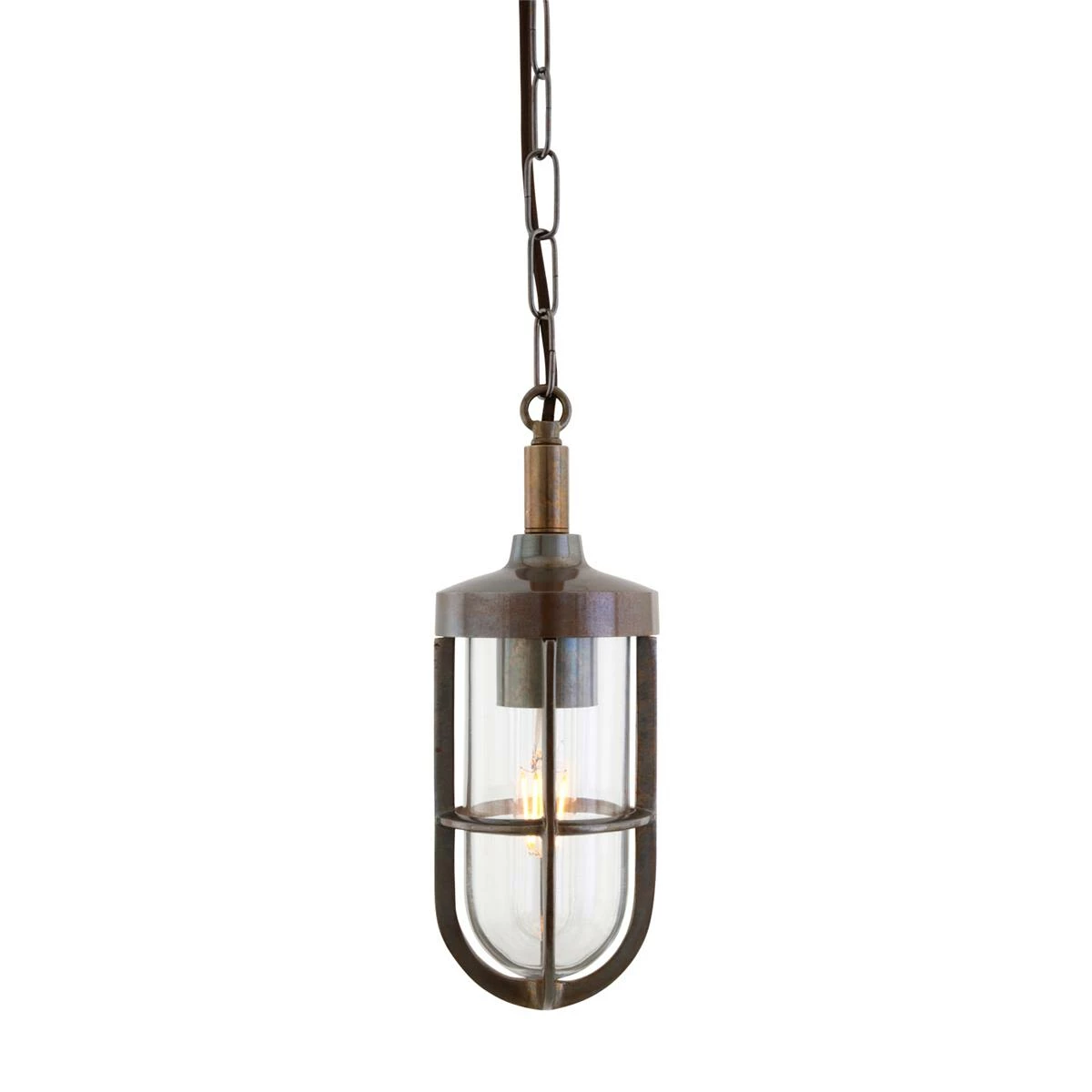 This well glass pendant is protected by a simple nautical-style brass cage that envelopes its glass shade. With an IP65 protective rating this nautical pendant is suitable for installing in any bathroom location or outdoors.