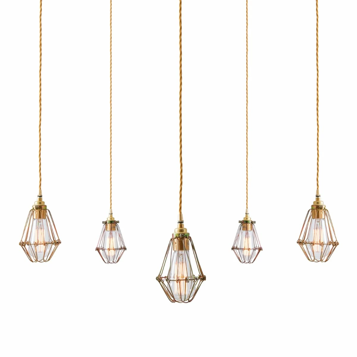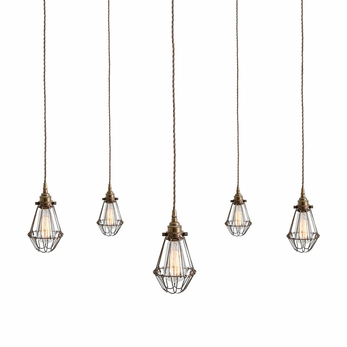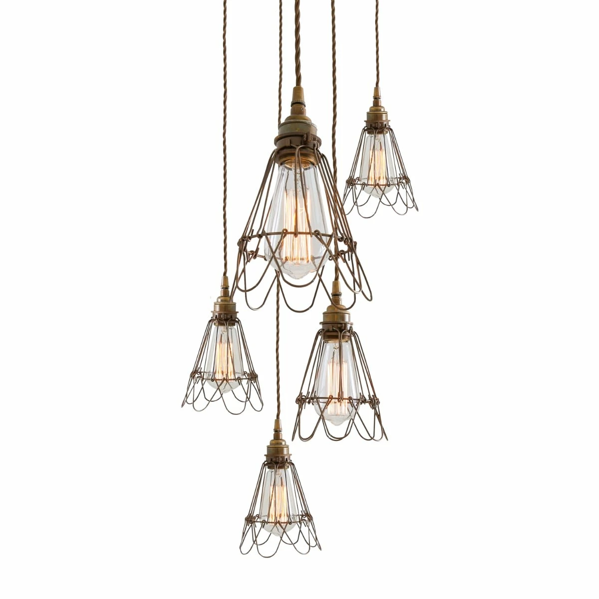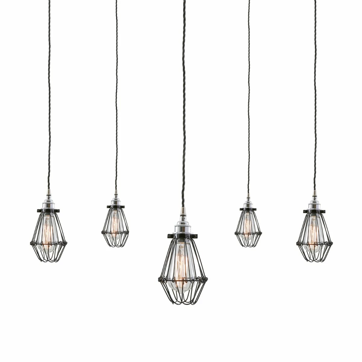 Designed to showcase the warmth of Edison-style filament bulbs, the Praia Cage Pendant Light Cluster can easily blend into any modern environment. A trendy industrial cage cluster pendant light, perfect for a bar or stylish restaurant. With the adjustable opening at the bottom of the cage, and the adjustable ceiling hooks, this cage pendant light can be altered easily to suit your own preference. Suitable for any industrial and minimalist interiors. The cluster design is ideal for off centre ceiling roses. Comes as standard with 5 suspensions from one ceiling rose. Additional or less suspensions can be provided on request.