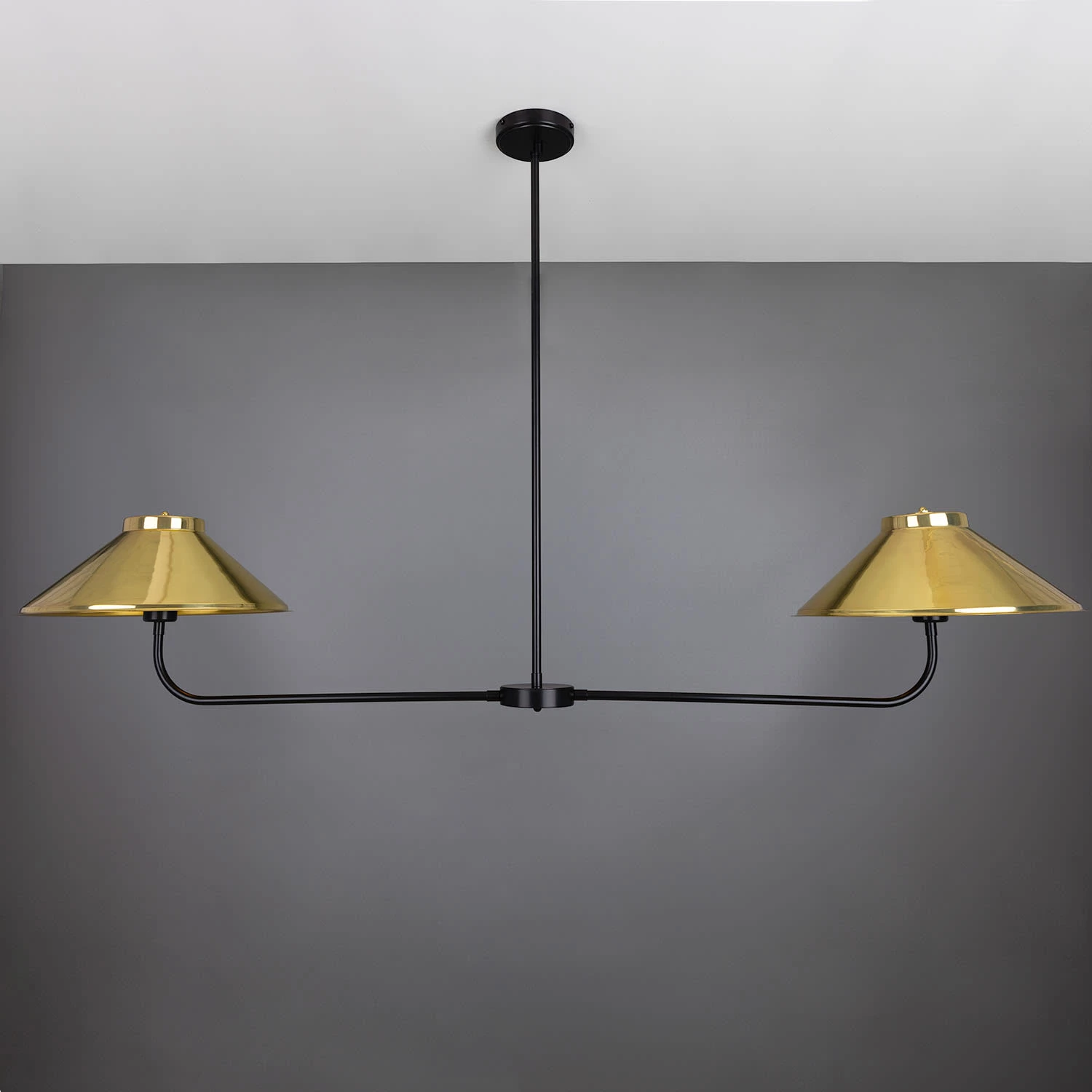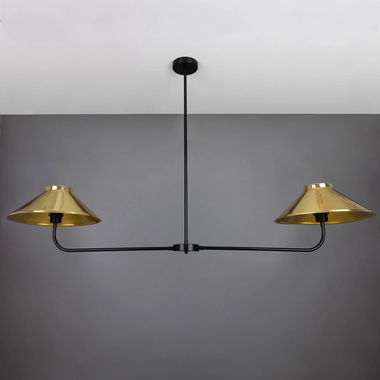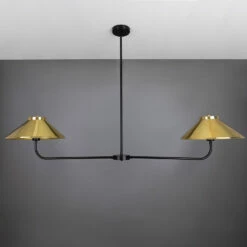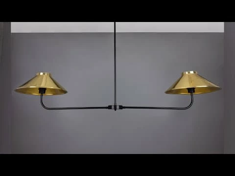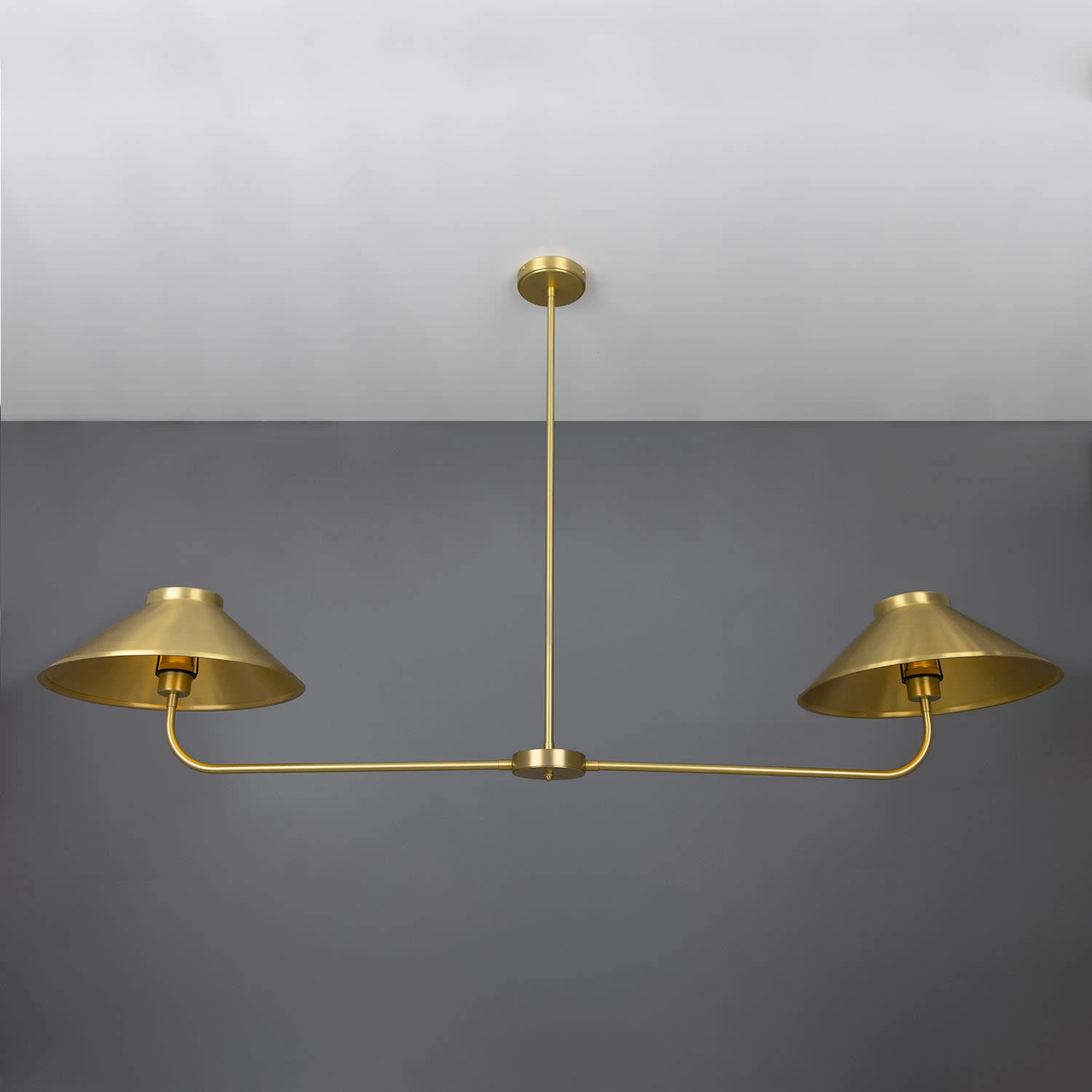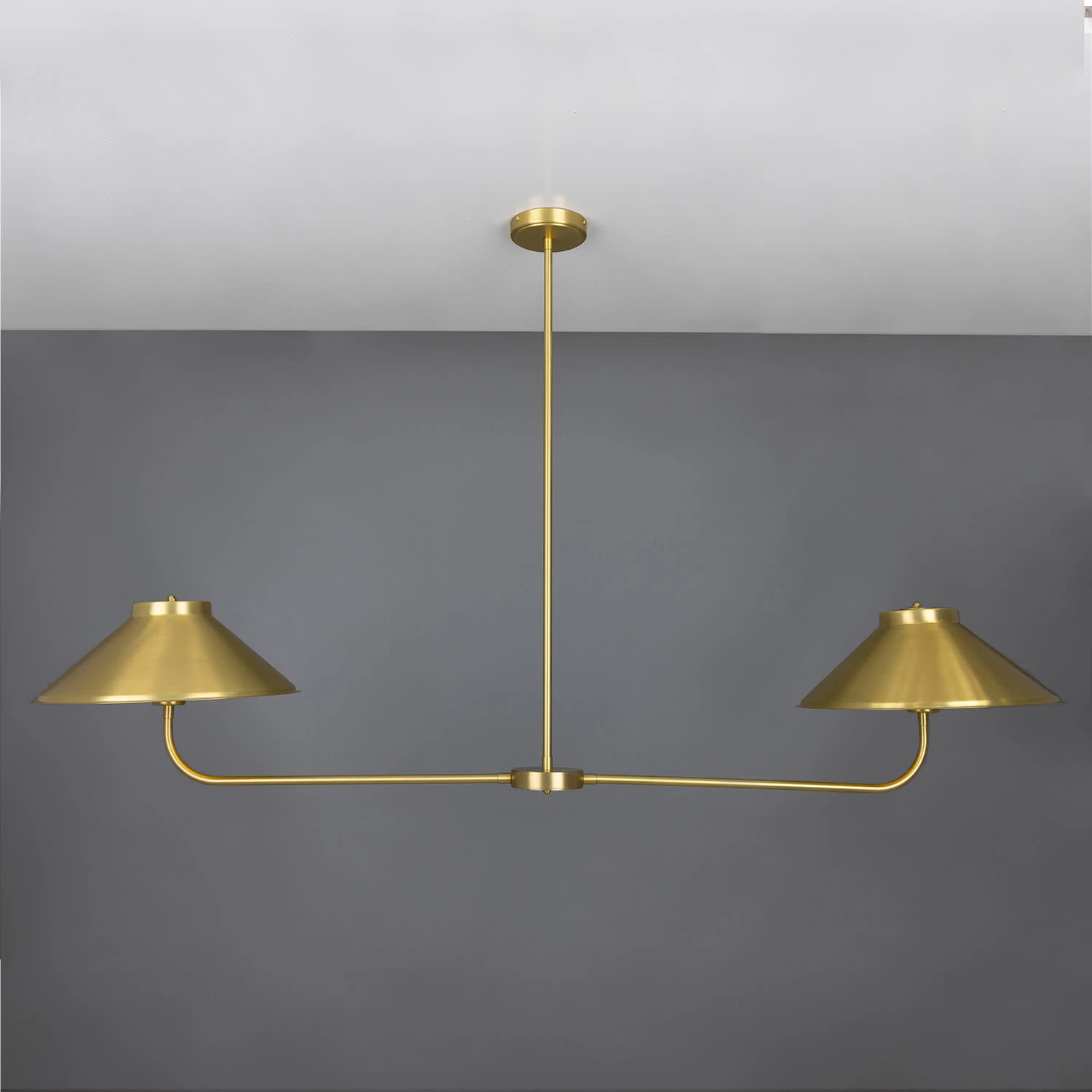 A central brass tube descends from the ceiling rose meeting a cylindrical centre. The cylindrical centre holds two curved brass arms, each supporting a brass lamp shade.
