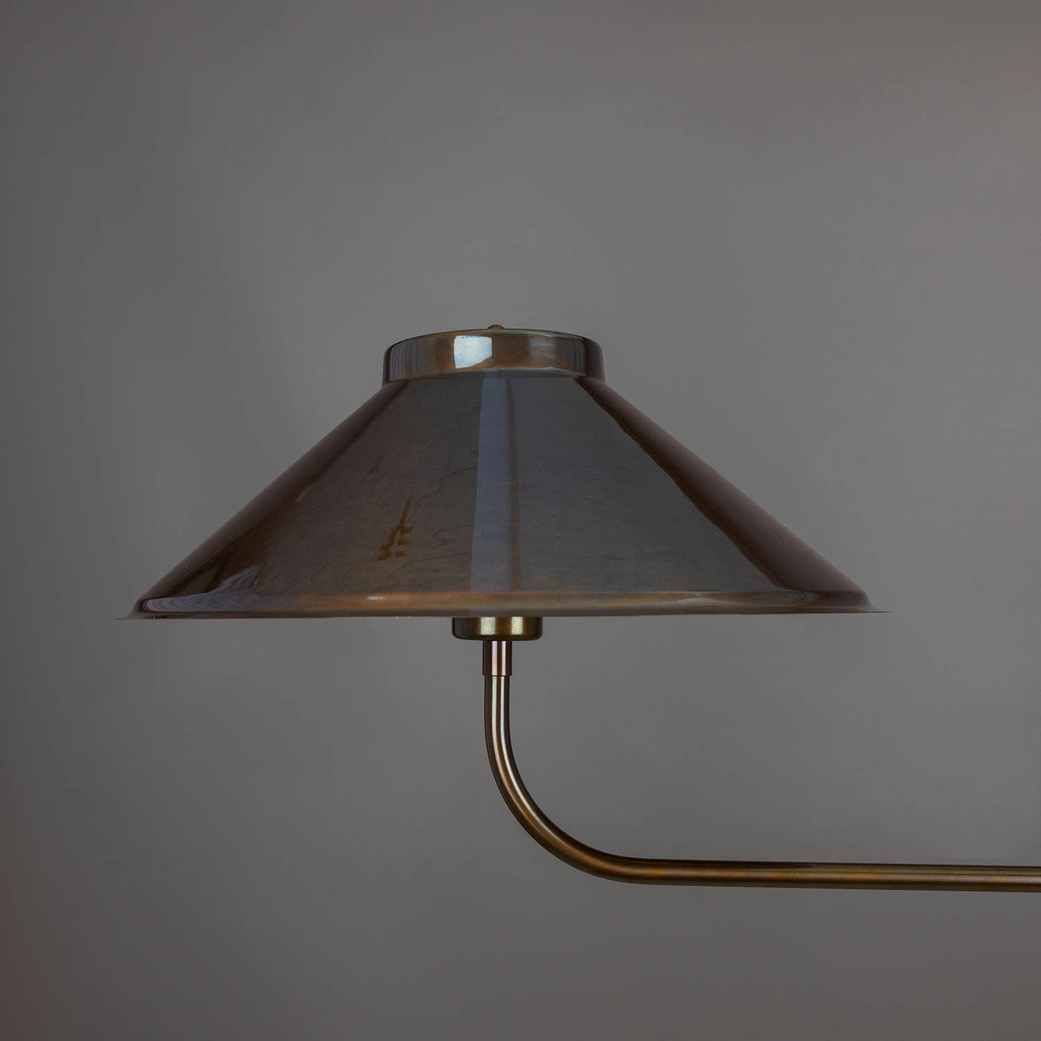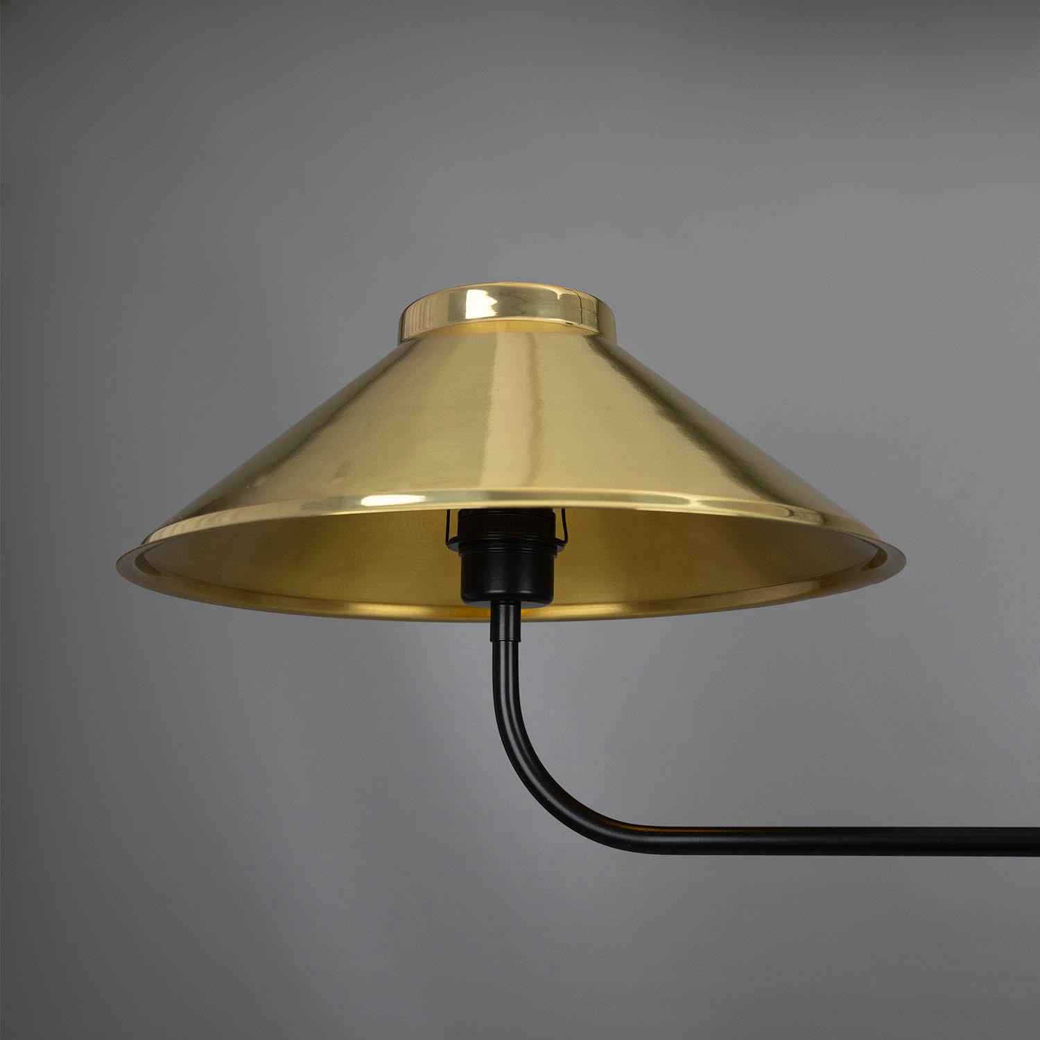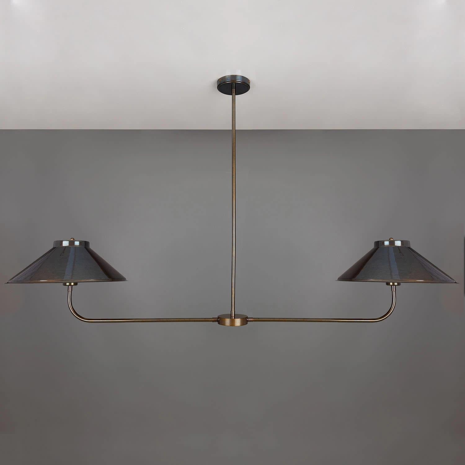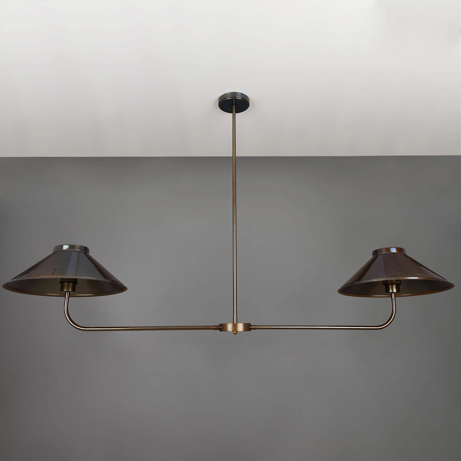 A central brass tube descends from the ceiling rose meeting a cylindrical centre. The cylindrical centre holds two curved brass arms, each supporting a brass lamp shade.