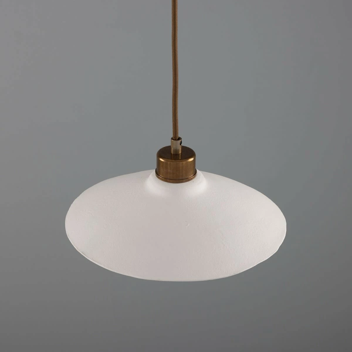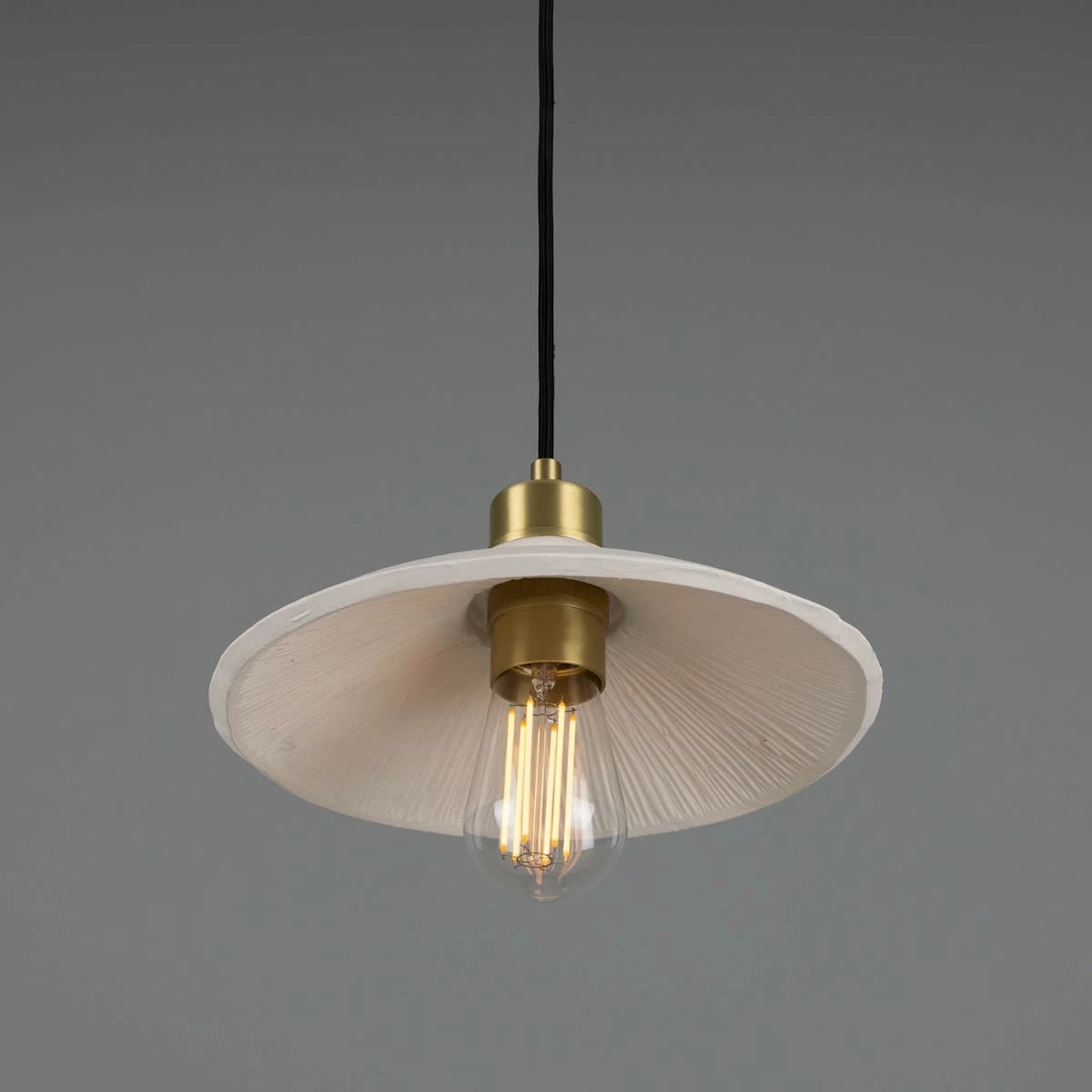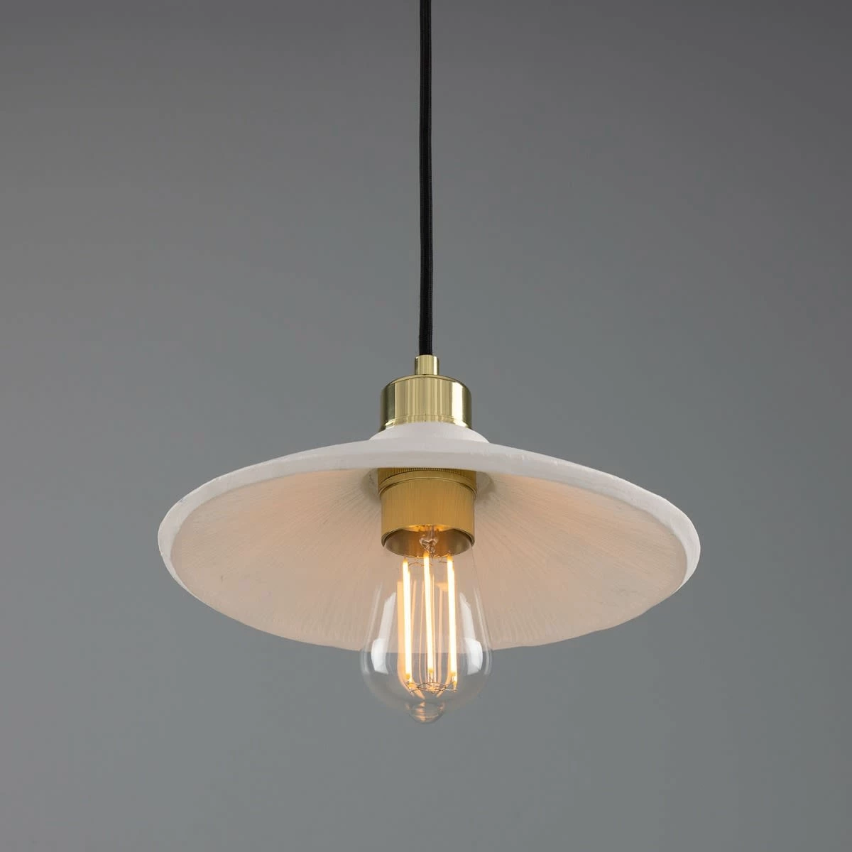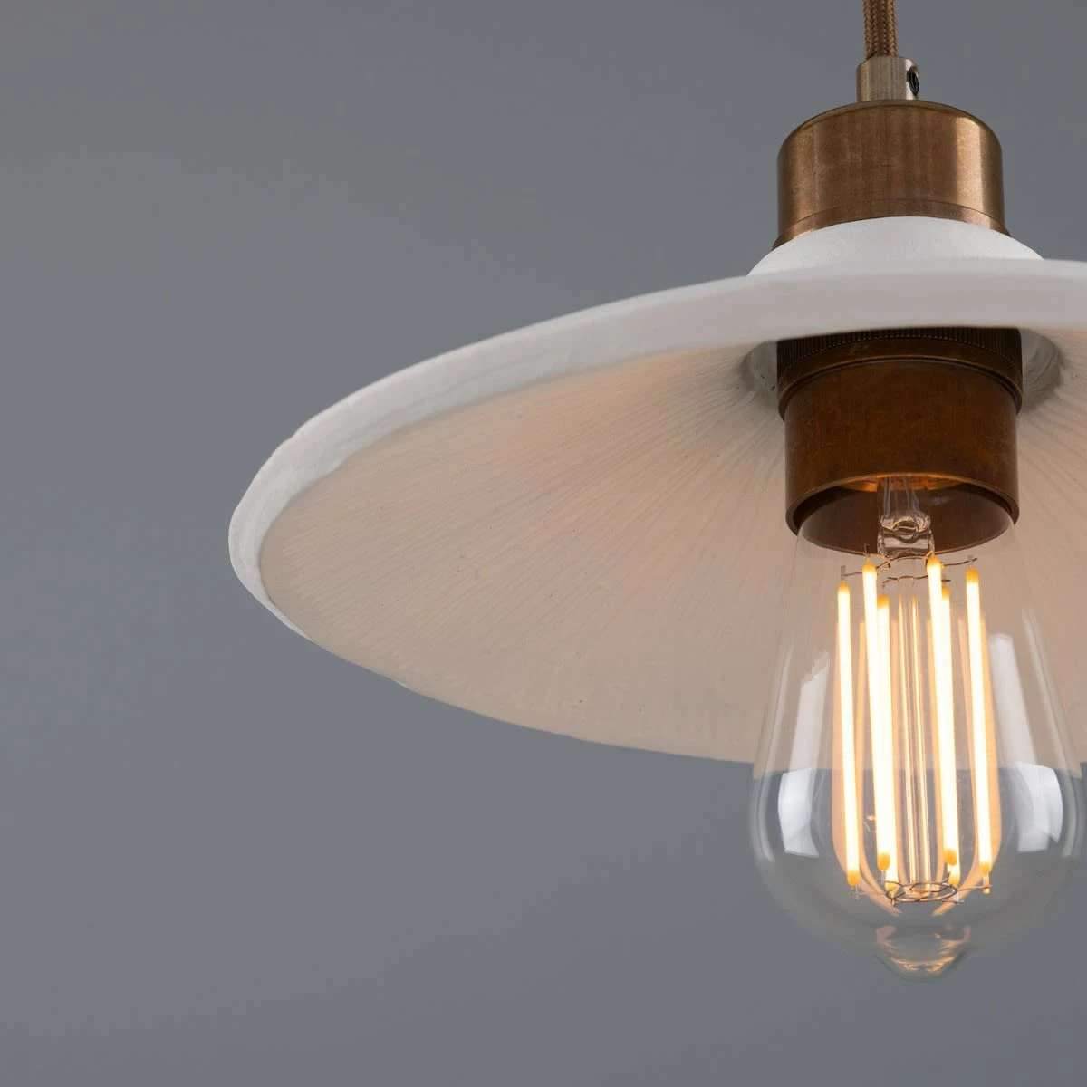 This ceramic pendant includes a matching brass ceiling rose with decorative cable that grips a brass lamp holder. Adapting to a variety of interiors, the brass components are available in five colour finishes; antique brass, antique silver, polished brass, satin brass and powder-coated matte black.