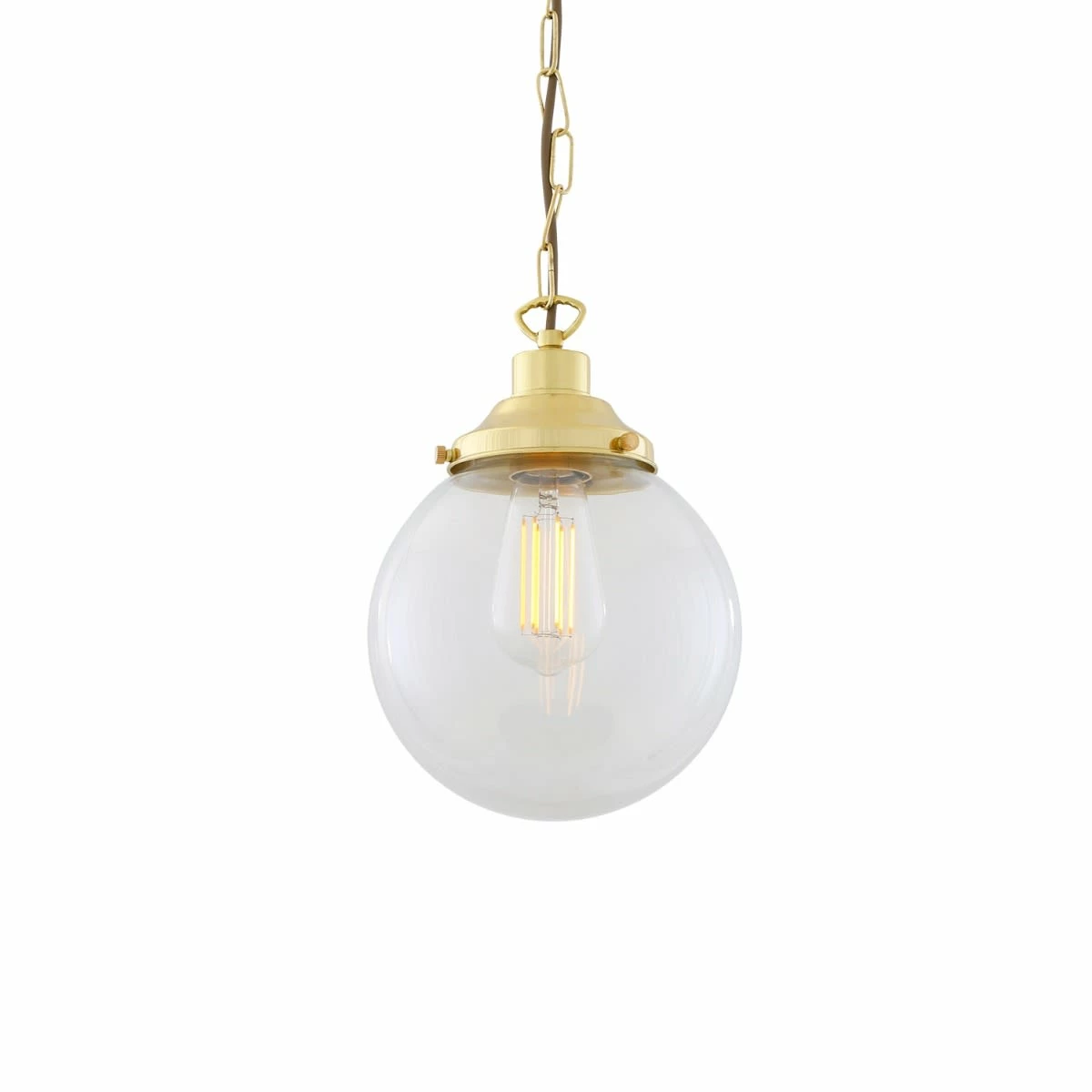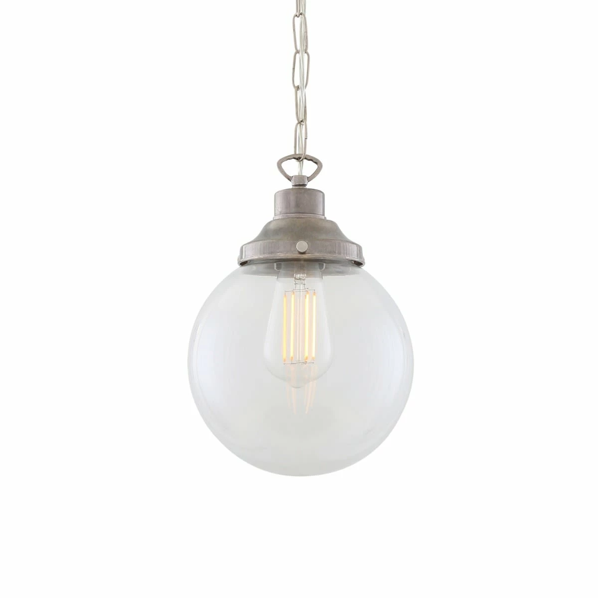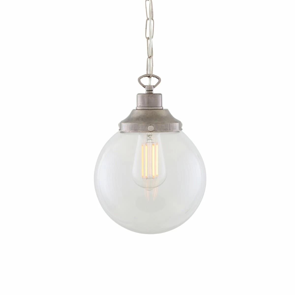 Evoking early 20th-century industrial lighting, the Riad 20cm Clear Globe Pendant retain the classic lines and exposed hardware of the originals. This globe pendant light is a simple design full of style with a modern industrial look for your kitchen, bar or restaurant. Suspended from a simple chain, hang it as individual pendant over a desk or kitchen work space or cluster several together for a more modern look. Suitable for any minimalist or industrial interiors, this glass pendant light looks fantastic when lit with an Edison squirrel cage bulb for a soft lighting. Bulbs are sold separately.