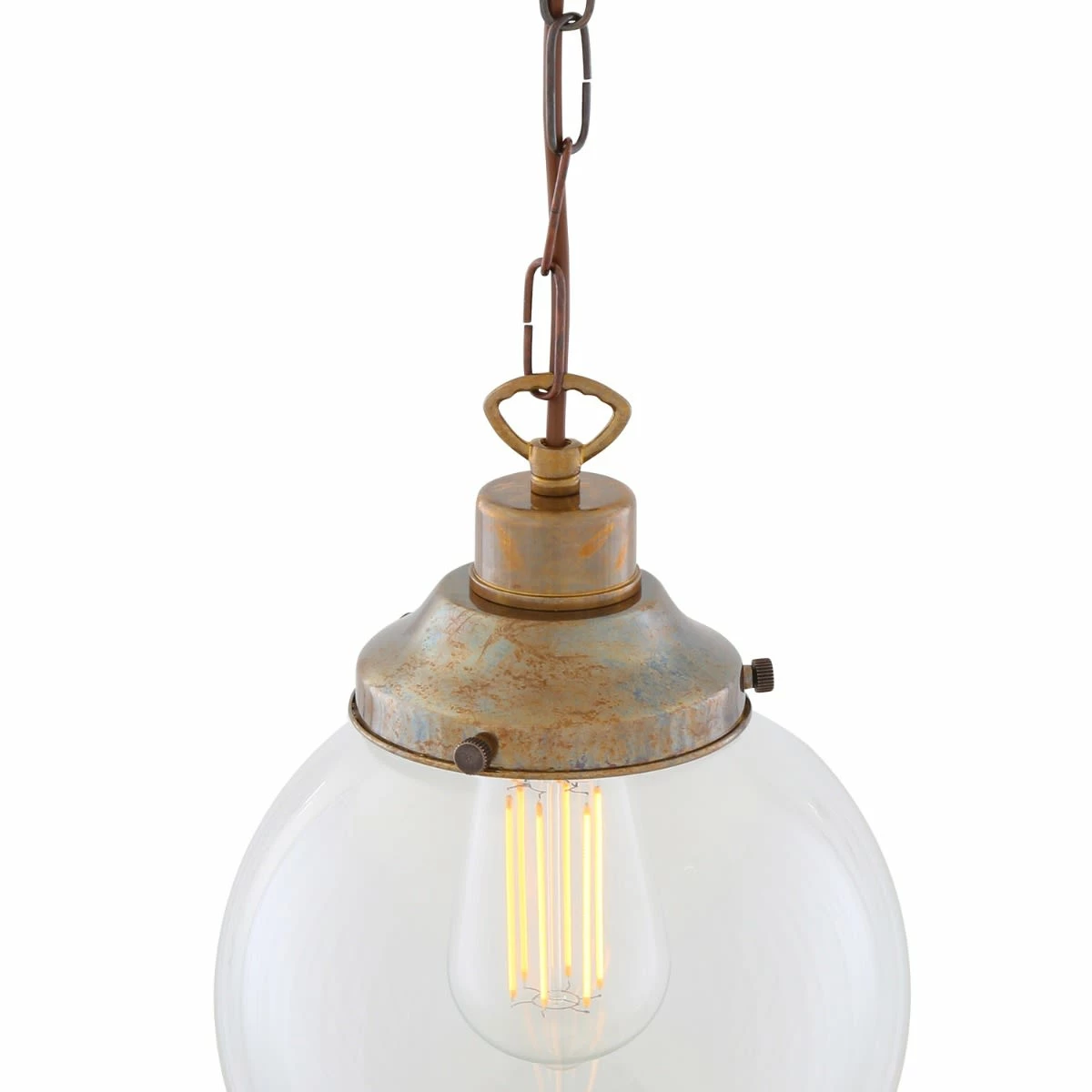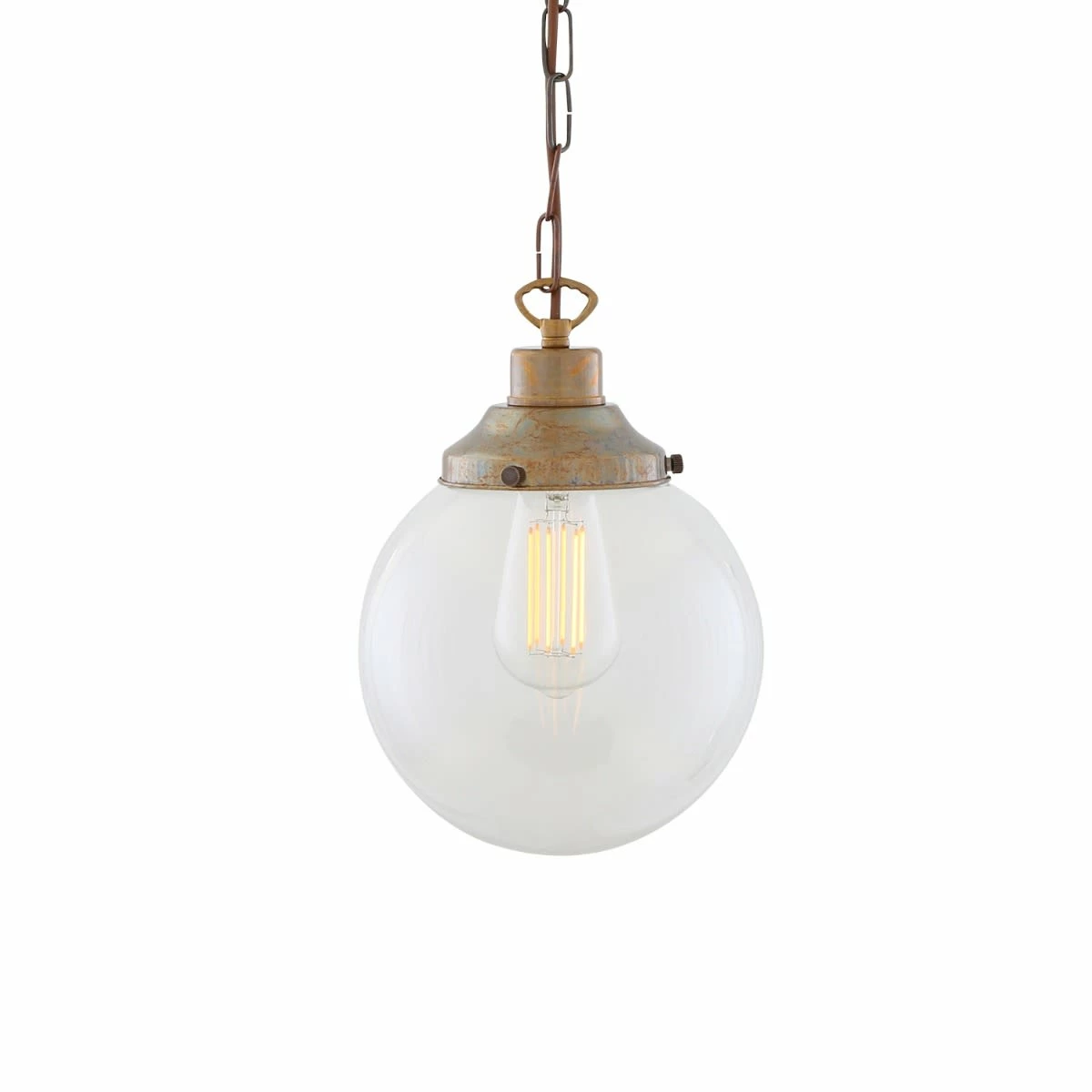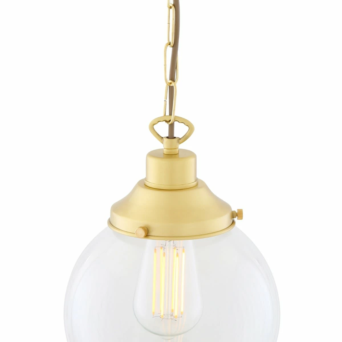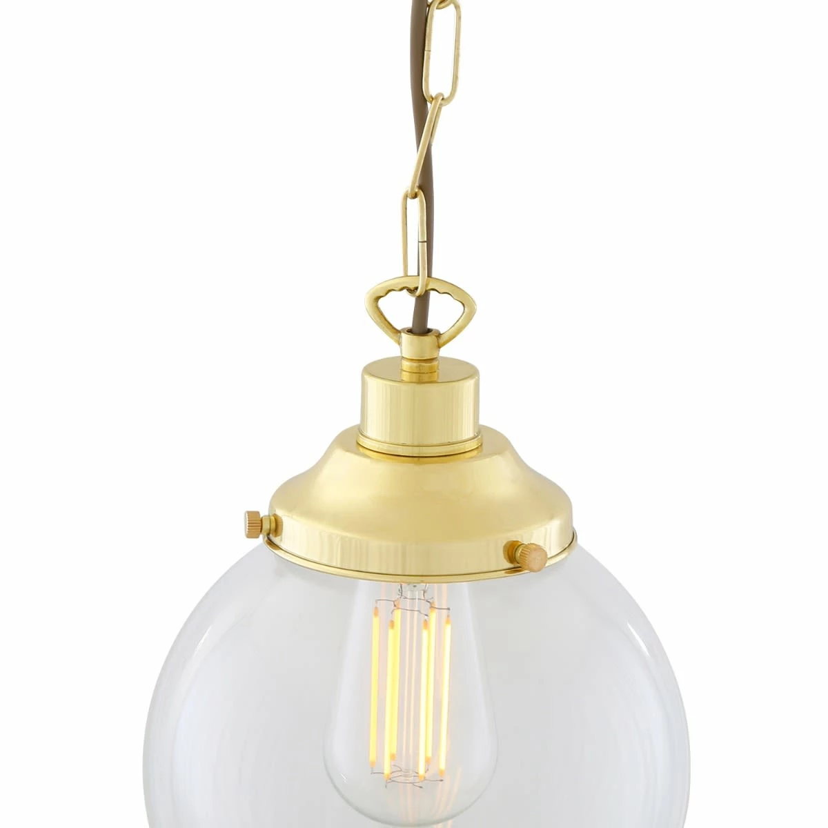 Evoking early 20th-century industrial lighting, the Riad 20cm Clear Globe Pendant retain the classic lines and exposed hardware of the originals. This globe pendant light is a simple design full of style with a modern industrial look for your kitchen, bar or restaurant. Suspended from a simple chain, hang it as individual pendant over a desk or kitchen work space or cluster several together for a more modern look. Suitable for any minimalist or industrial interiors, this glass pendant light looks fantastic when lit with an Edison squirrel cage bulb for a soft lighting. Bulbs are sold separately.