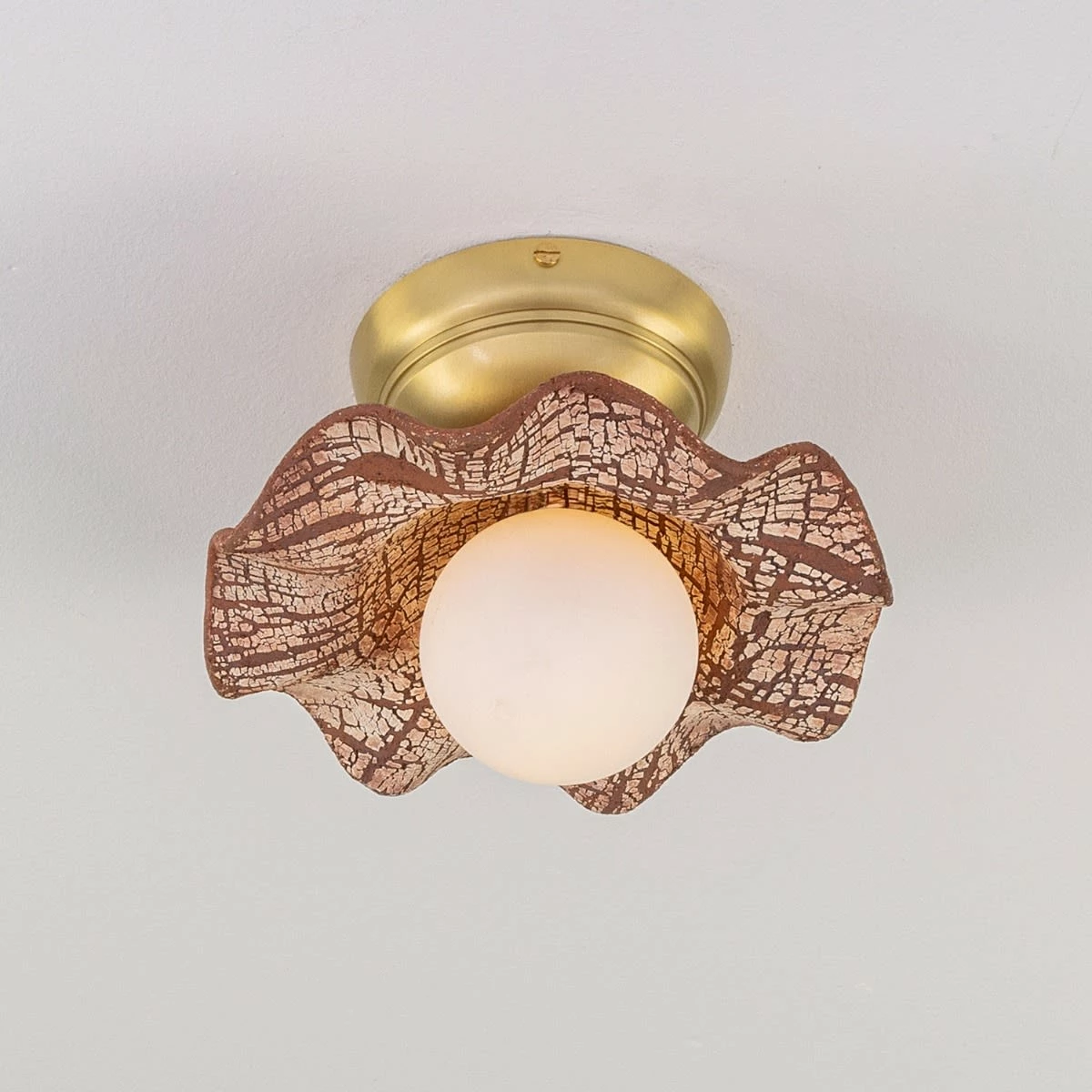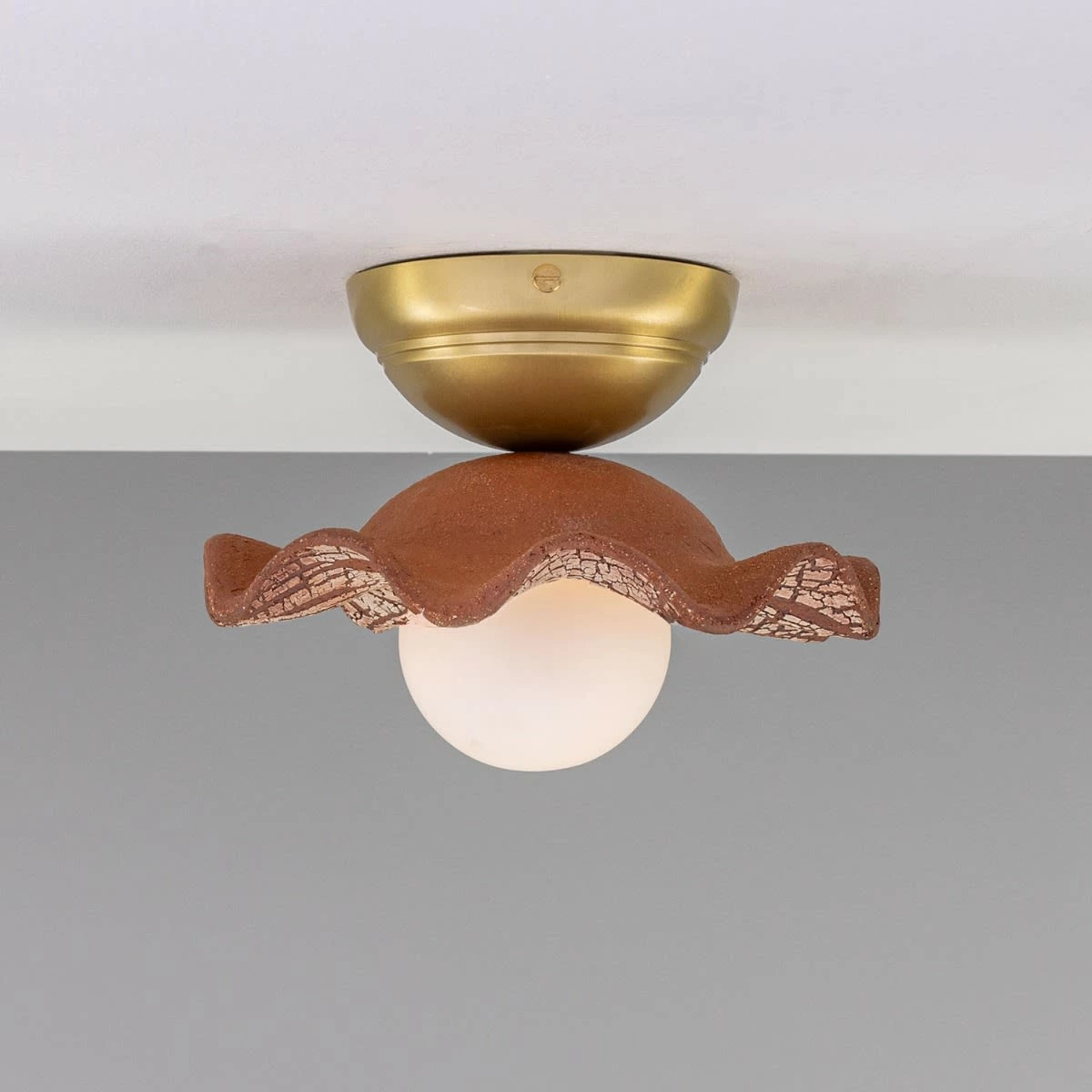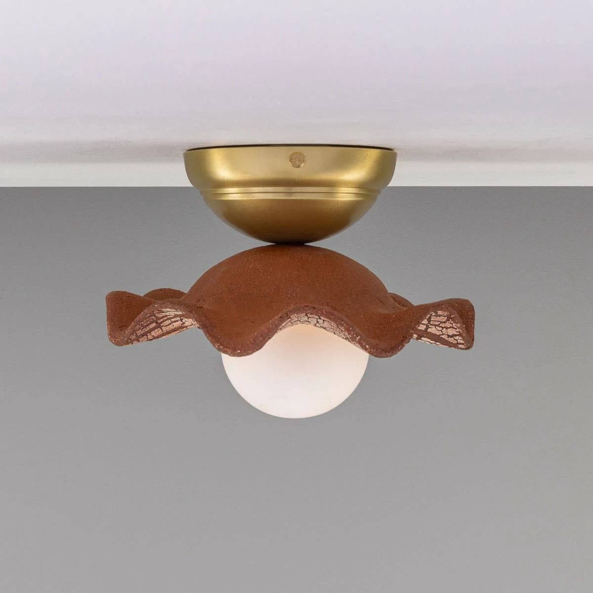 The Rivale red iron ceramic ceiling light is a charming addition to interiors. Inspired by nature, it features a handcrafted, wavy ceramic shade that mimics the Geum Rivale’s delicate petals.
