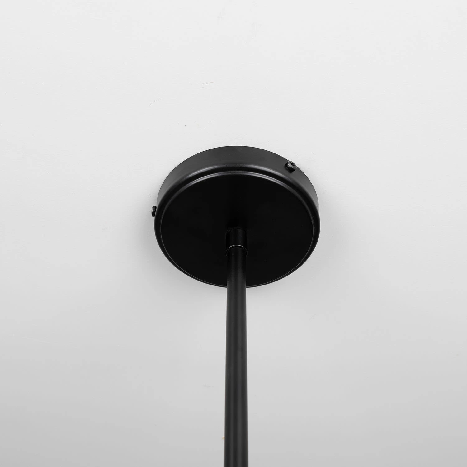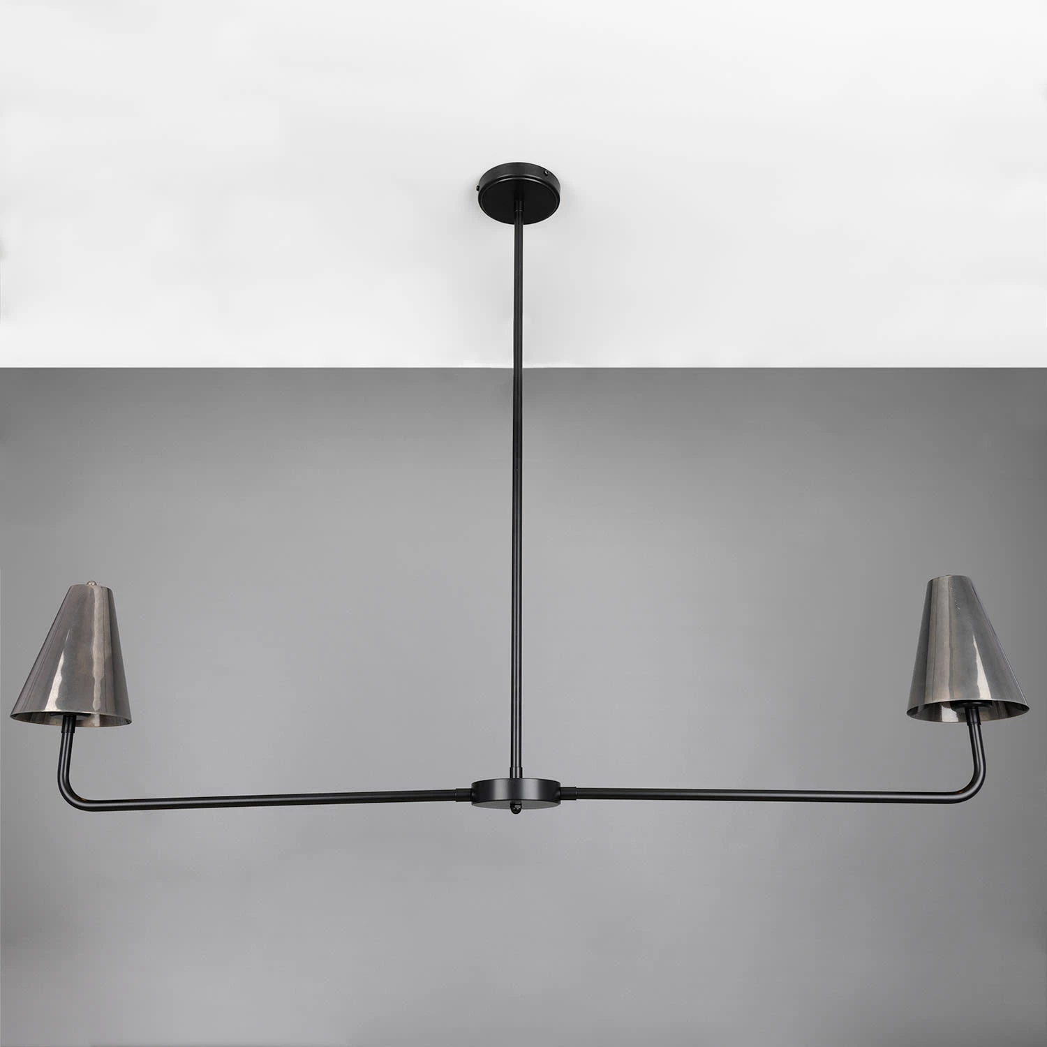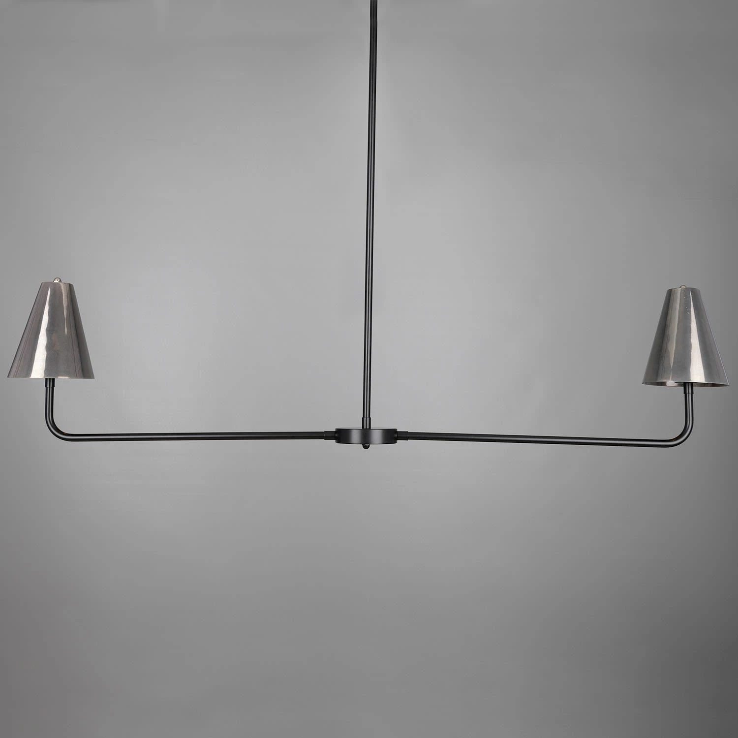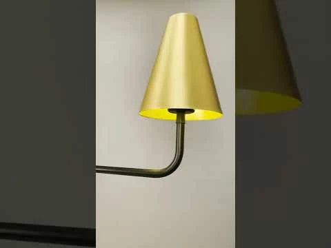 The Riverton island chandelier is suspended from the ceiling rose by a powder-coated matte black arm with two slender arms protruding from its cylindrical centre. These protruding arms are crowned with cone-shaped brass shades on each end.